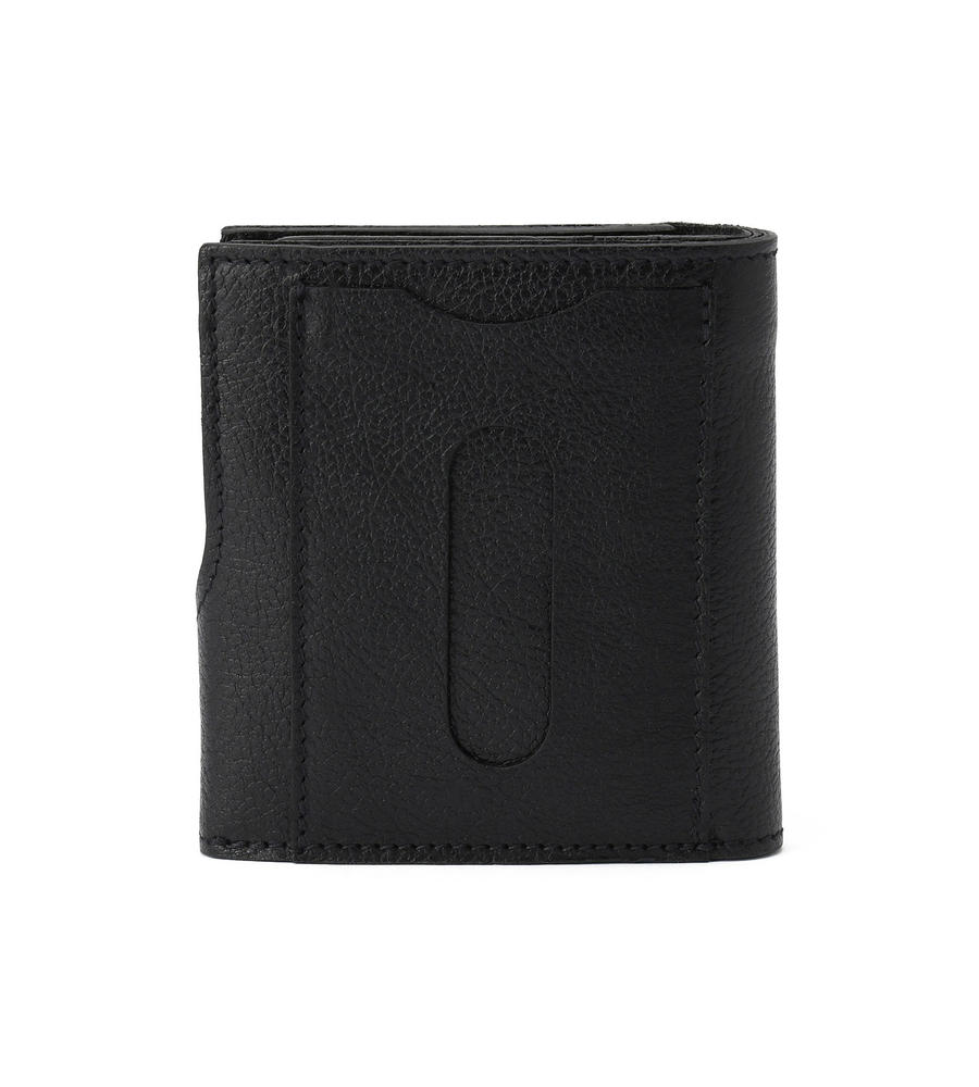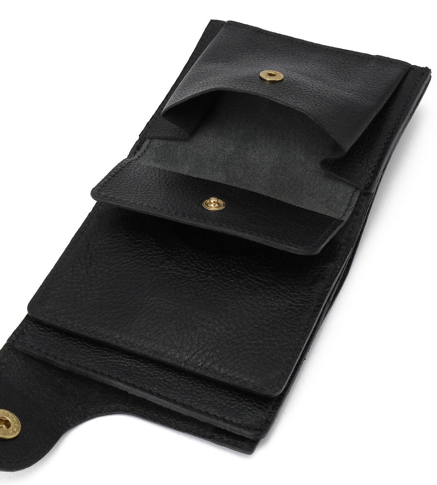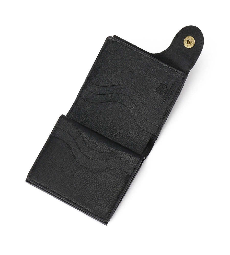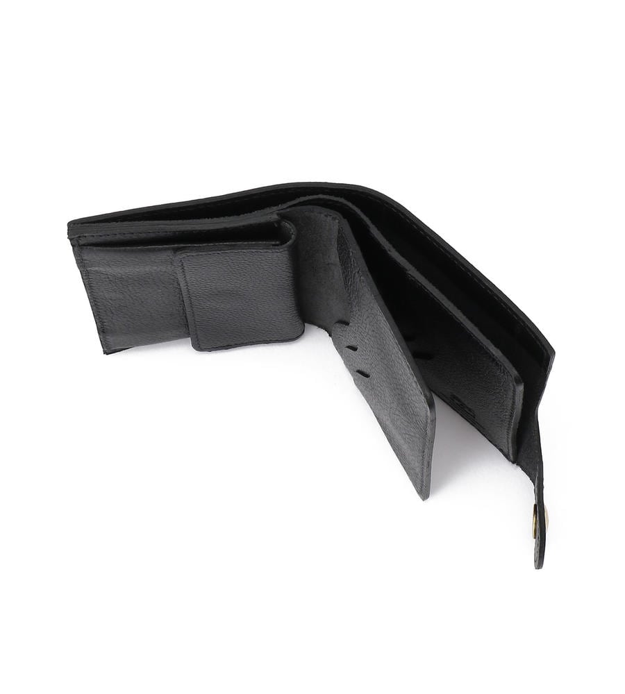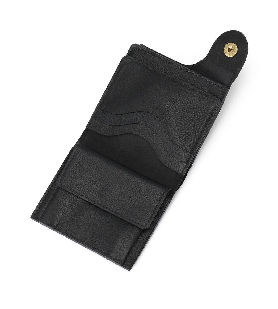 2つ折りデザインのコンパクトウォレット。ドットボタンを開くと、札入れとコイン収納部があり、仕切りを設けてカードスロットも充実させています。シボのあるしなやかな牛革は、使うほどに馴染むのも特徴です。