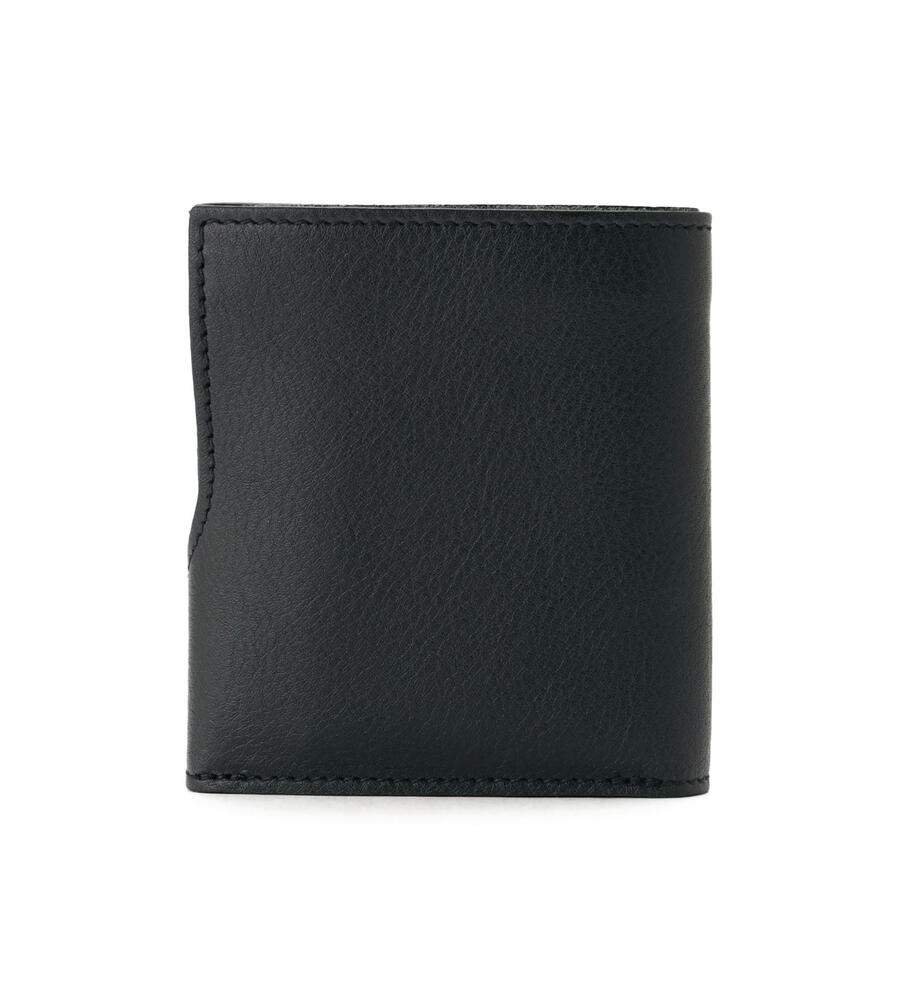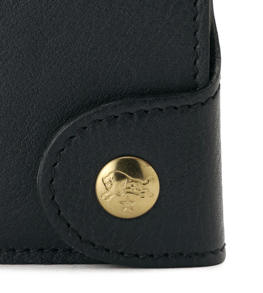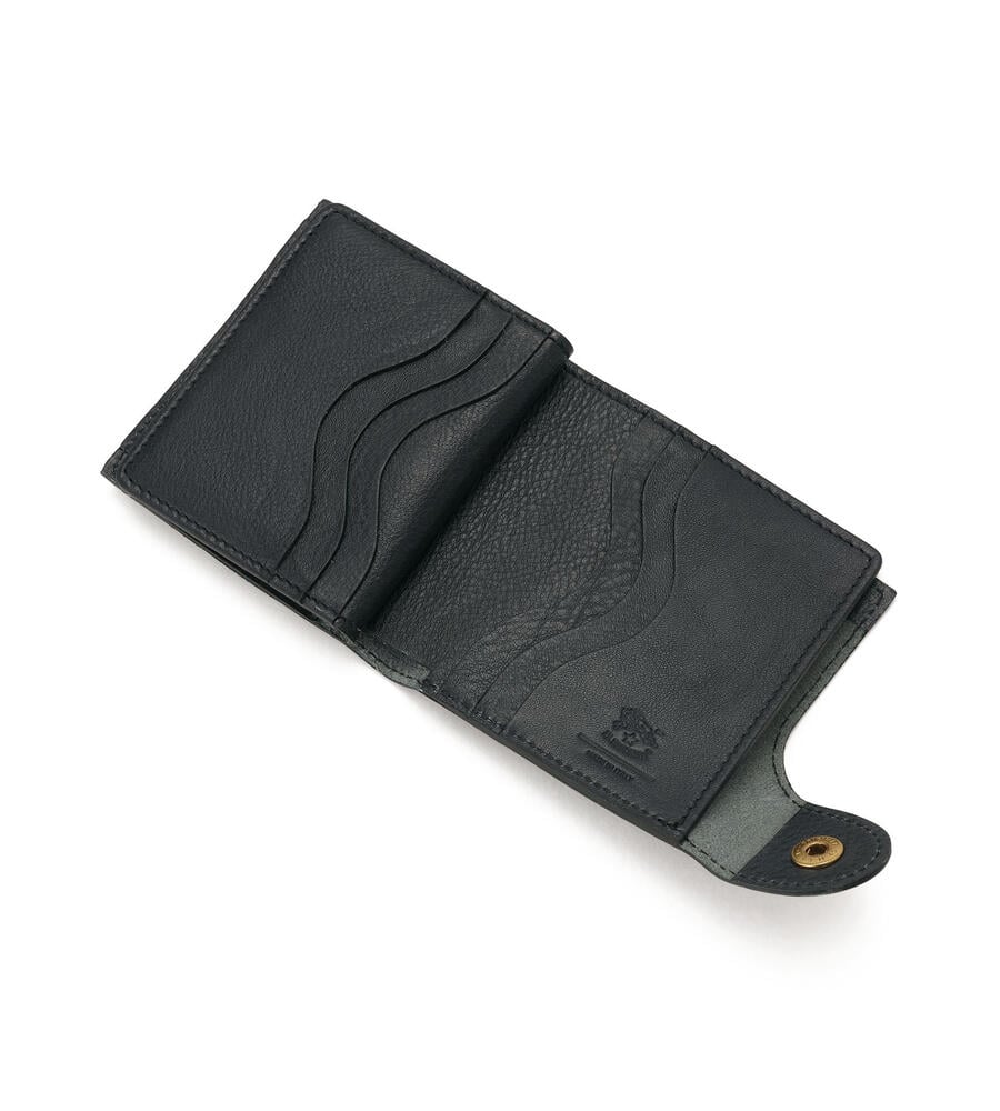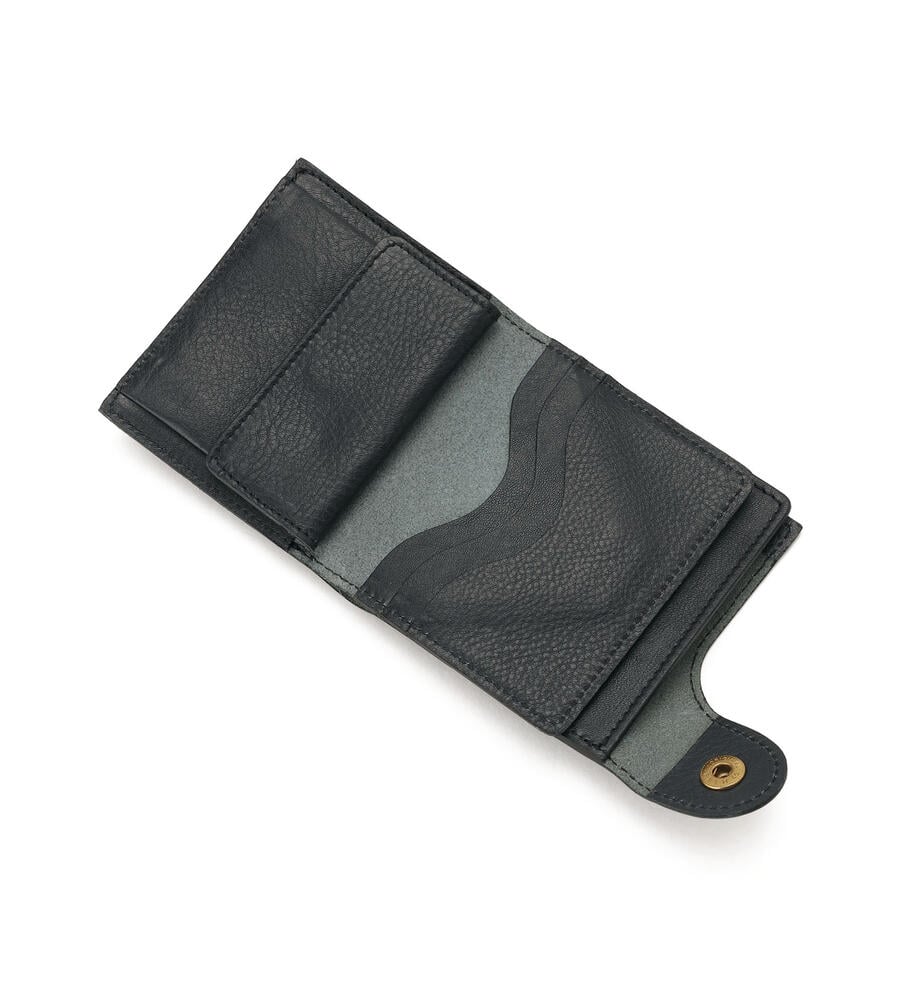 持ち運びがしやすいコンパクトな二つ折り財布。ロゴマークの型押しや非対称にセットしたスナップボタンが、シンプルながらも印象的です。充実したカードポケットなど、機能性にもこだわって仕上げています。