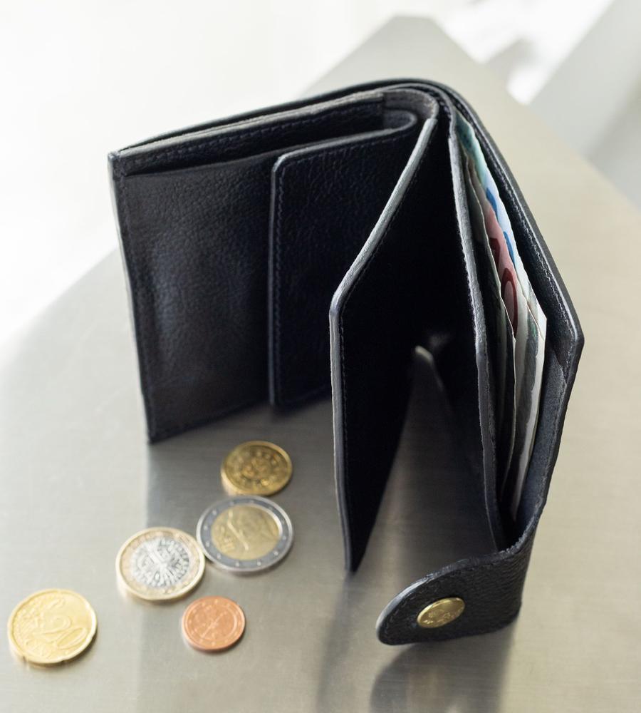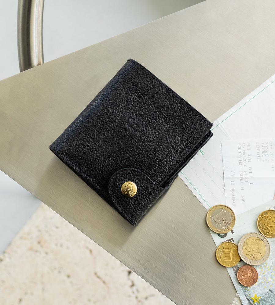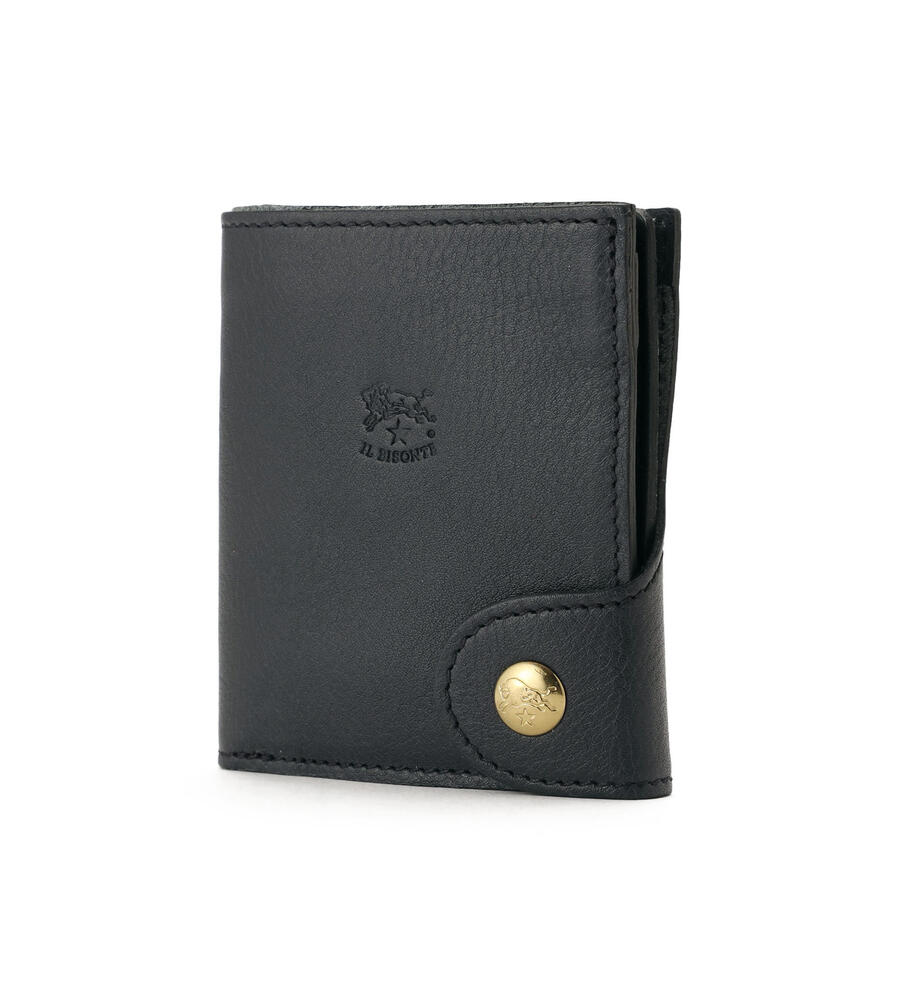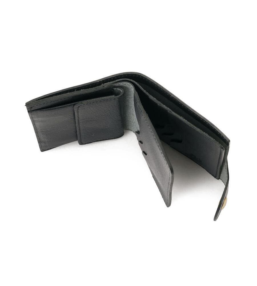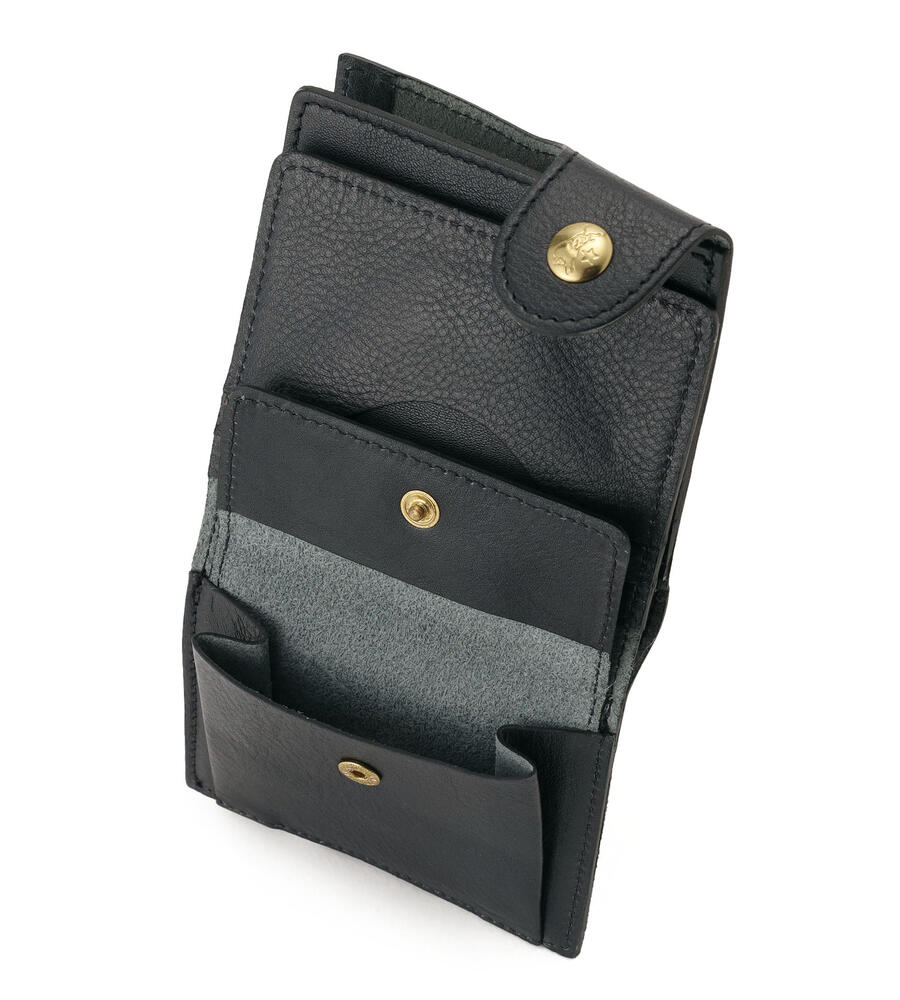 持ち運びがしやすいコンパクトな二つ折り財布。ロゴマークの型押しや非対称にセットしたスナップボタンが、シンプルながらも印象的です。充実したカードポケットなど、機能性にもこだわって仕上げています。