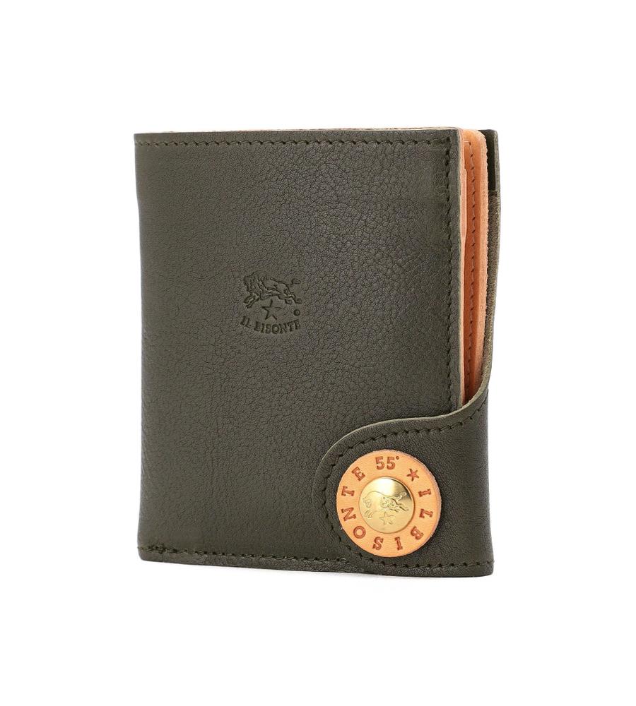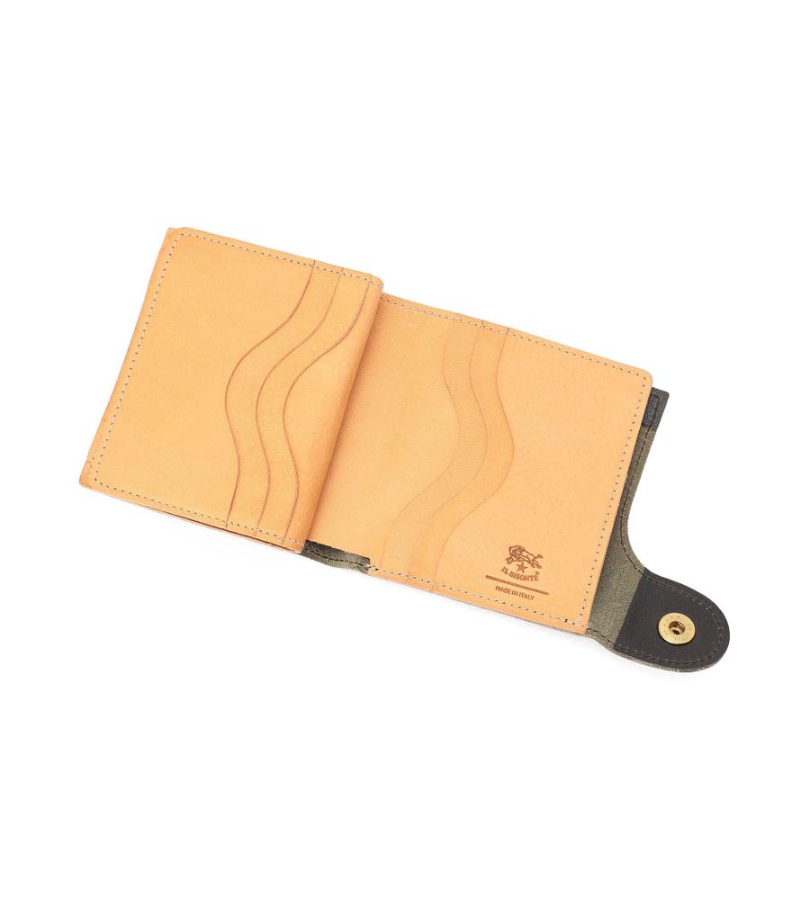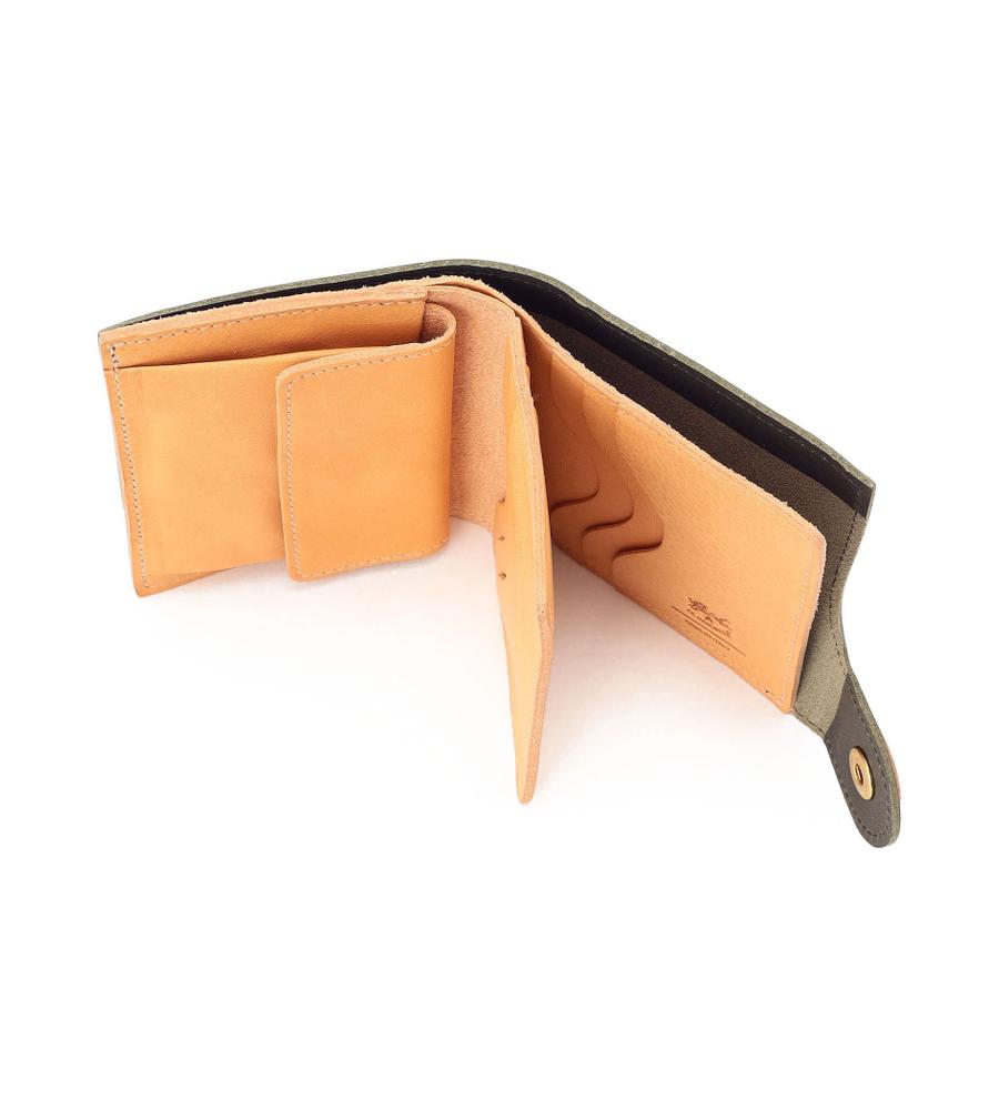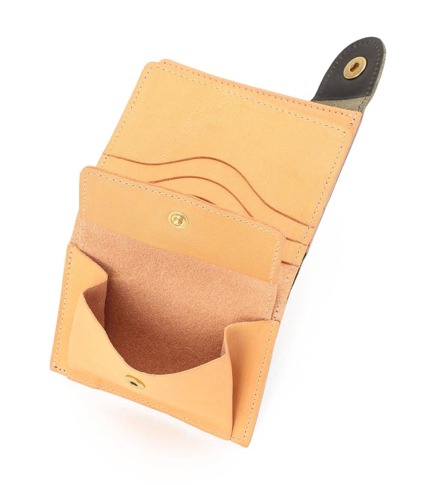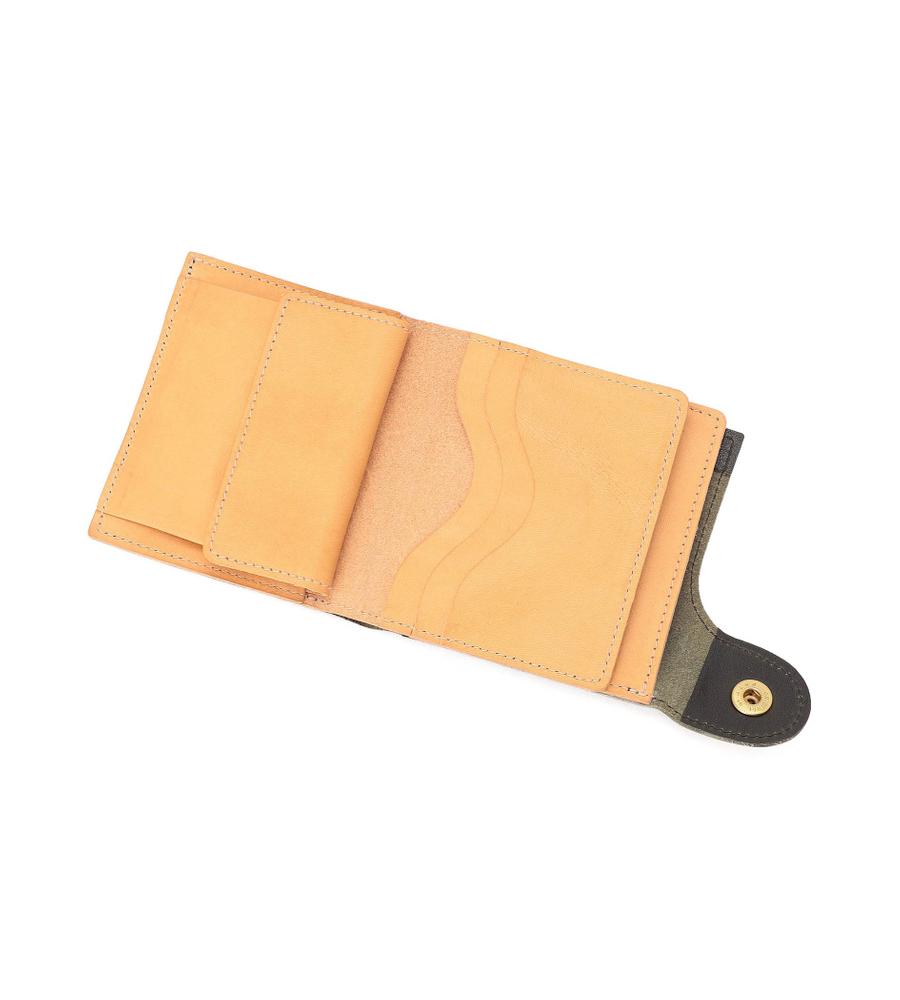 ボタンの留め具がユニークなバイフォールドウォレット。内側は札入れ、コインポケットを完備。カードスロットは二重にして、収納力を備えました。男性は、上着やパンツのポケットにも入れやすい大きさです。