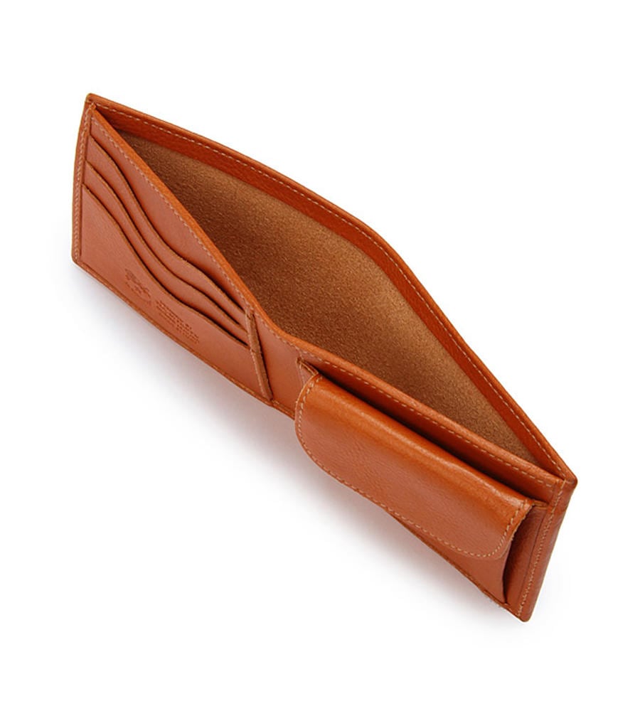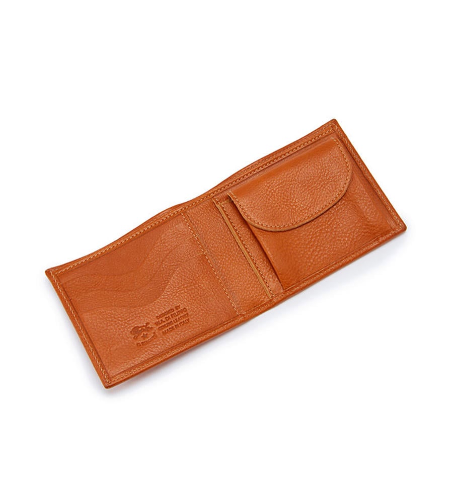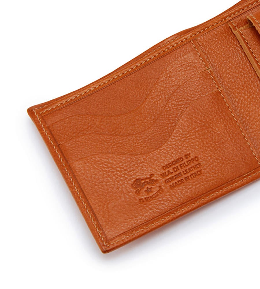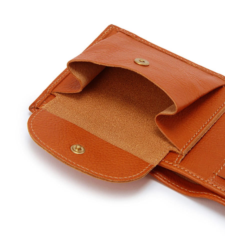 スタンダードな2つ折りのレザーウォレット。内側は札入れ、カードケース、コインケースと必要最小限のディティールのみ配置しています。シンプルな仕様の財布はロングセラーとなっています。
