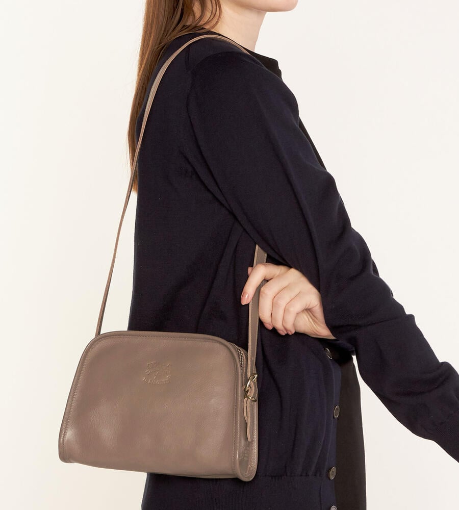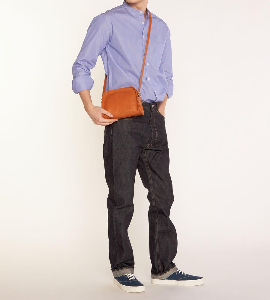 レザーのトリムを施した台形フォルムのバッグ。ショルダーベルトは長さの調節できるので、カジュアルに斜め掛けしても可愛い定番アイテムです。