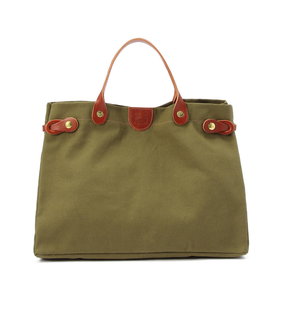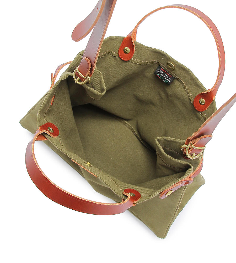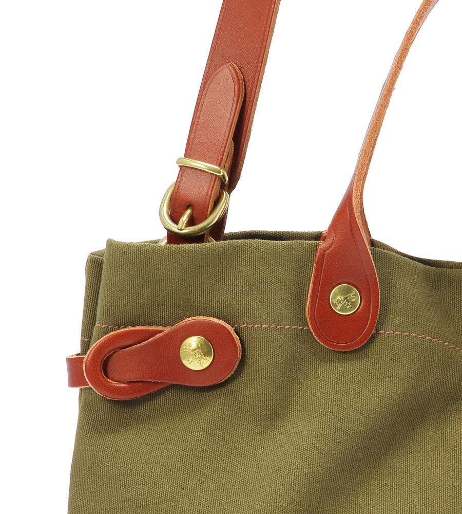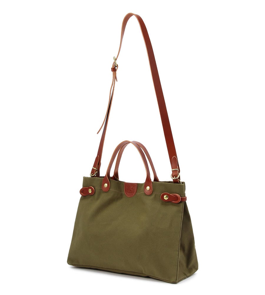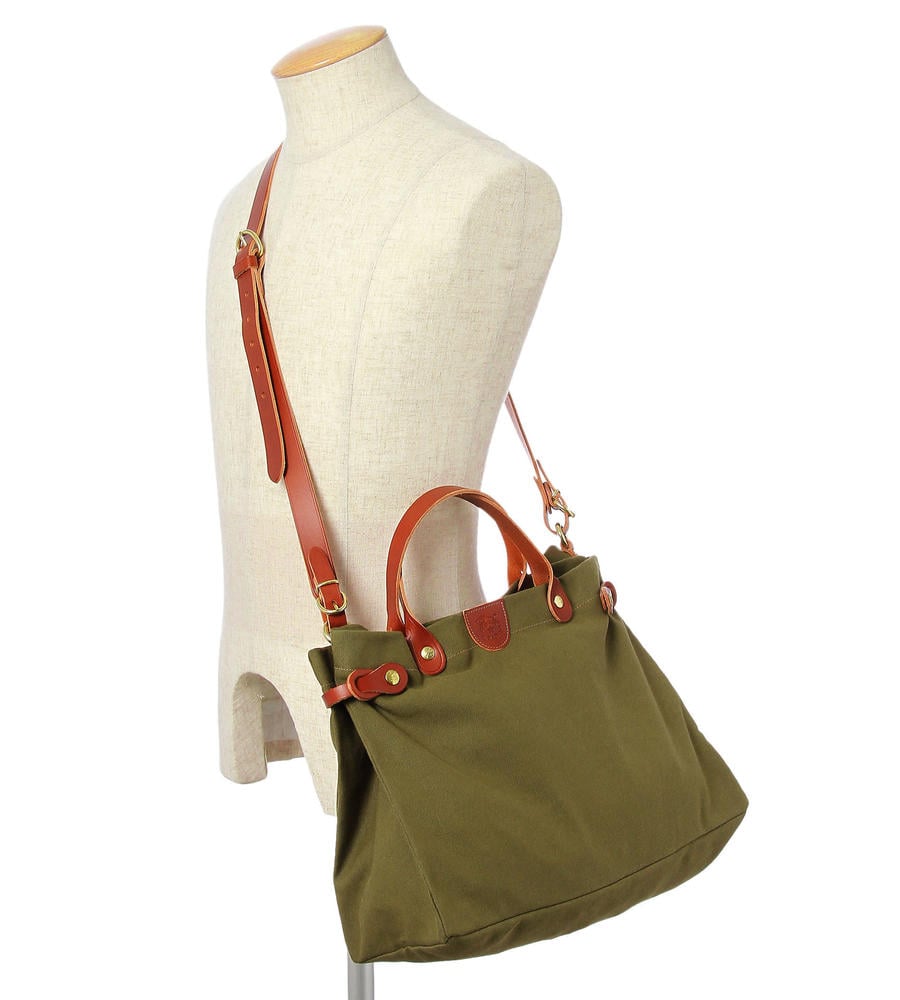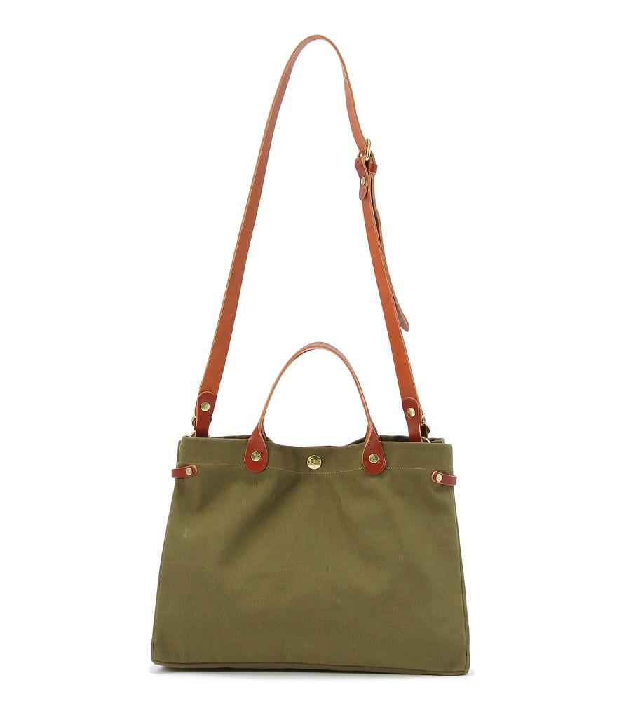 タフで取り扱いやすいキャンバス地のバッグです。ショルダーバッグとしてもお使いいただける2WAY仕様が嬉しいポイント。ハンドルやストラップ部分を配色のレザー素材で仕上げました。メタルパーツがポイントです。