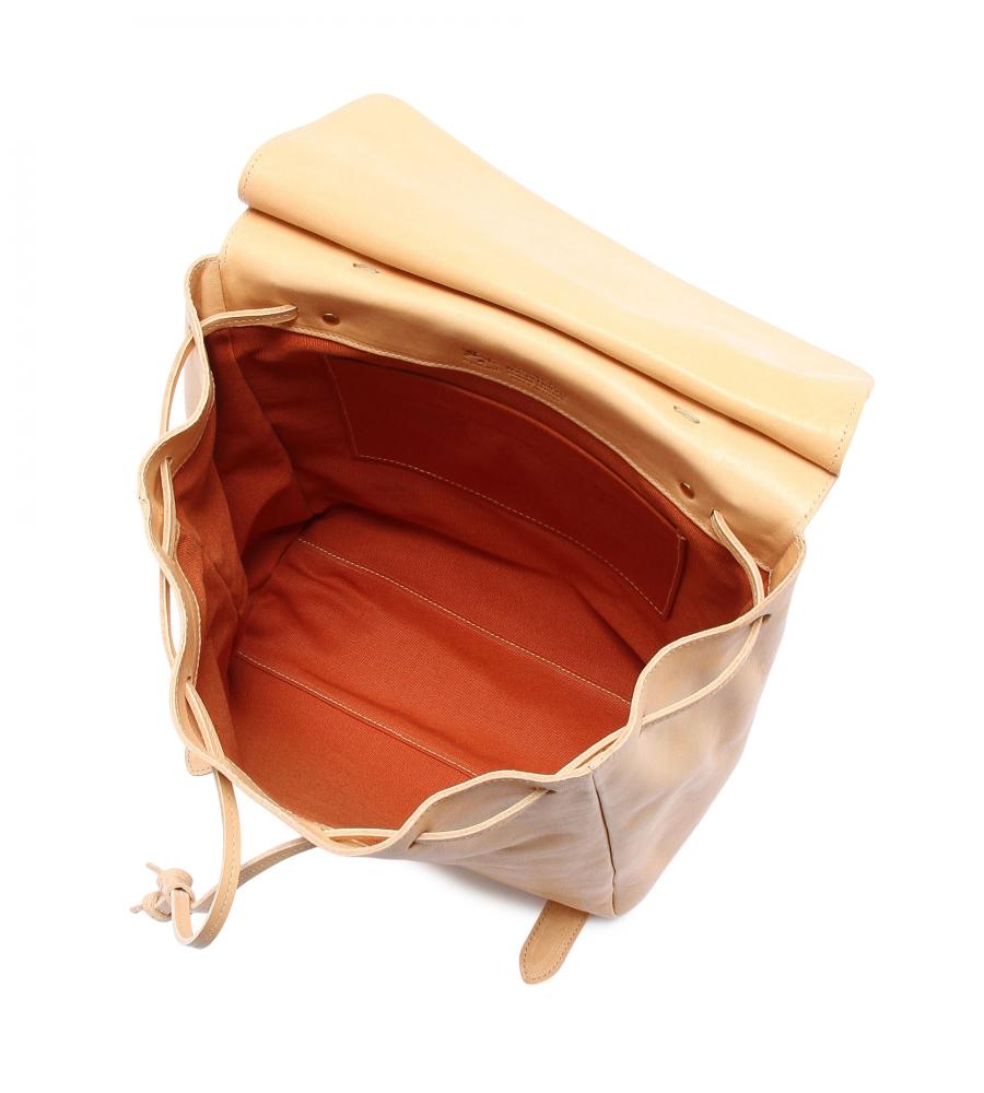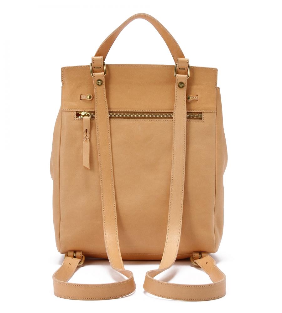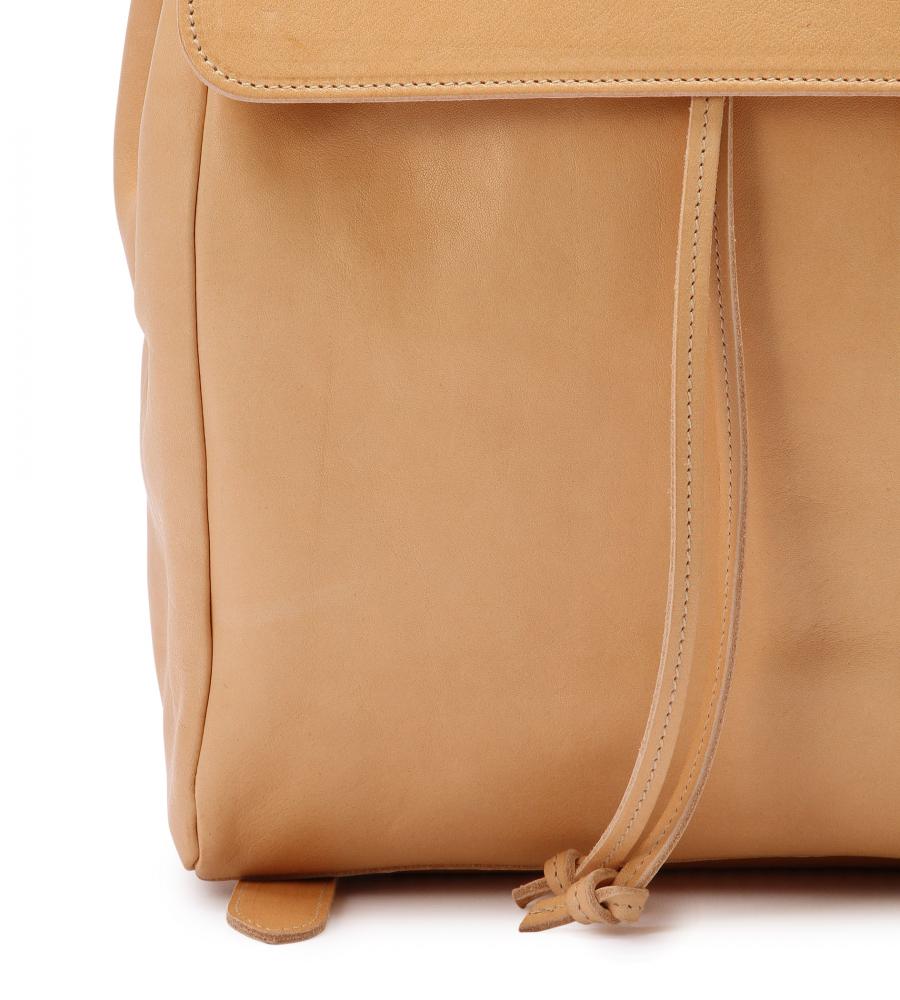 バイソンの刻印がアクセントになった、スクエアフォルムのバックパック。巾着タイプなので中身の出し入れもスムーズ。背面のファスナーポケットは、すぐに取り出したいパスケースや鍵の収納に便利です。