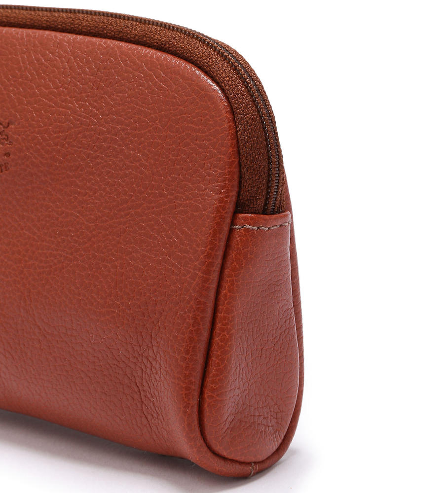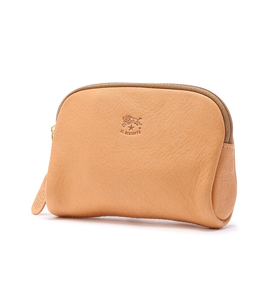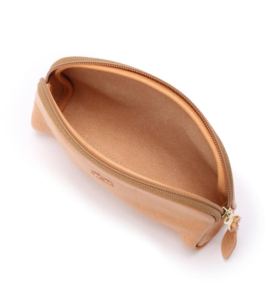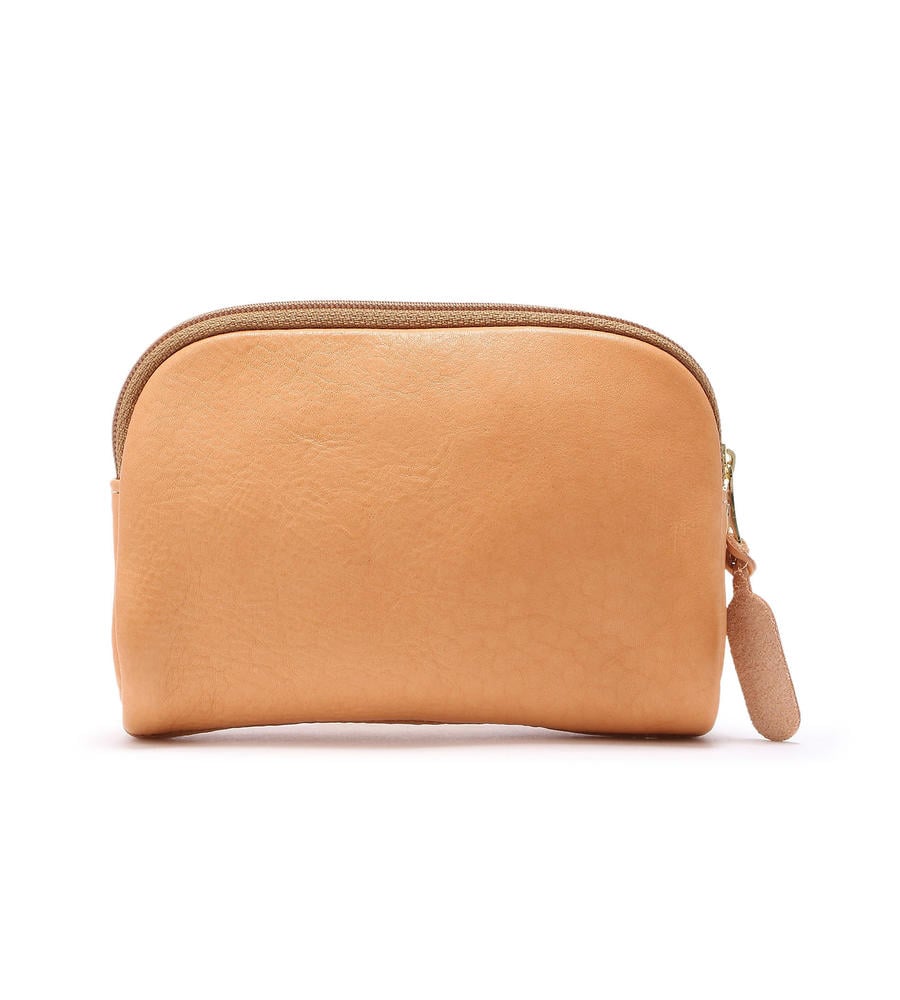 小物の収納に便利なポーチ。ややツヤ感のある本革を使用し、持つほどにヴィンテージ感が増すのが特徴。中央部分はもちろんファスナートップにも刻印をあしらい、細部までこだわった1品です。