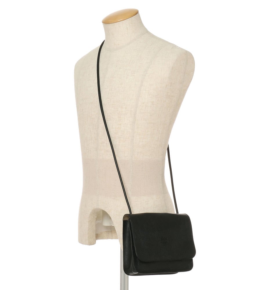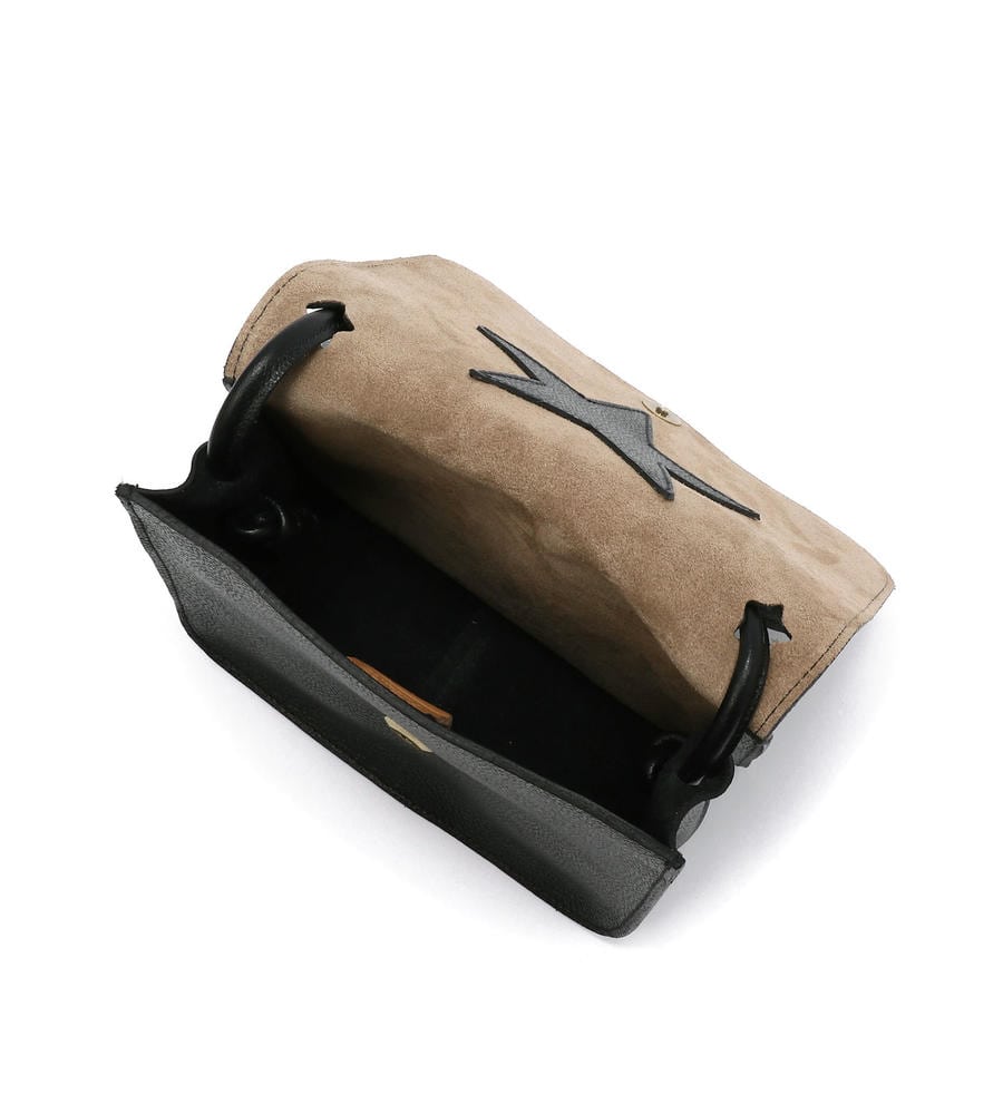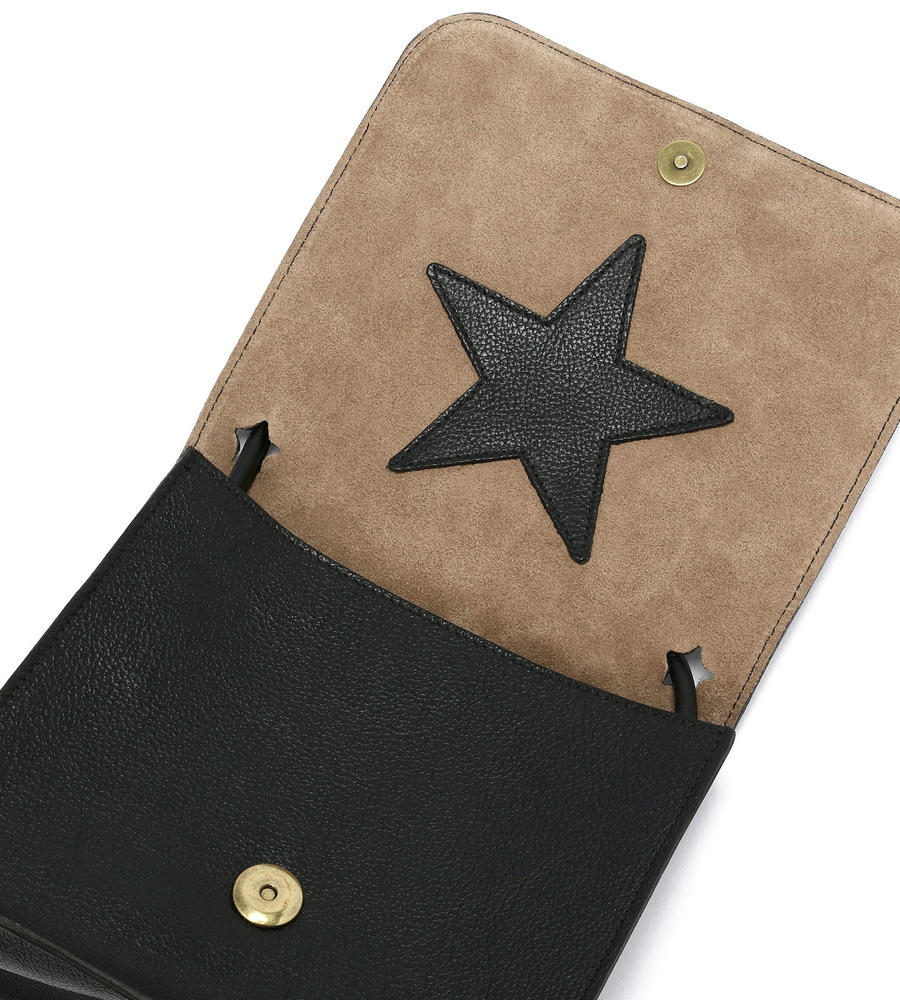 スリムなショルダーがスタイリッシュなムードを放つ、マチありスクエアフォルムのバッグ。マグネット仕様のフラップを開けると、内側にはスターモチーフがデザインされています。大人の遊び心が溢れる一品。
