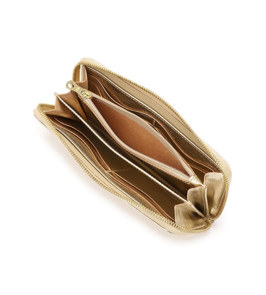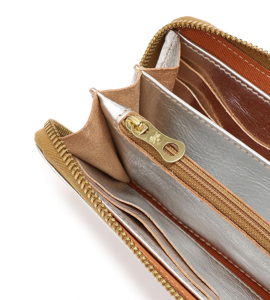 抜群の収納力で人気の高いロングウォレットです。ラウンドジップタイプで大きく開き、中身を出し入れしやすいのがポイントです。内側は、中央にコインポケット、その両サイドに札入れとカードポケットを備えています。