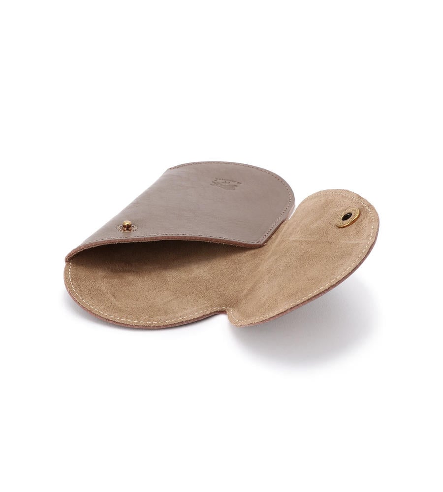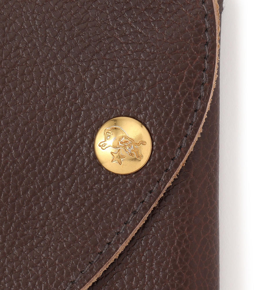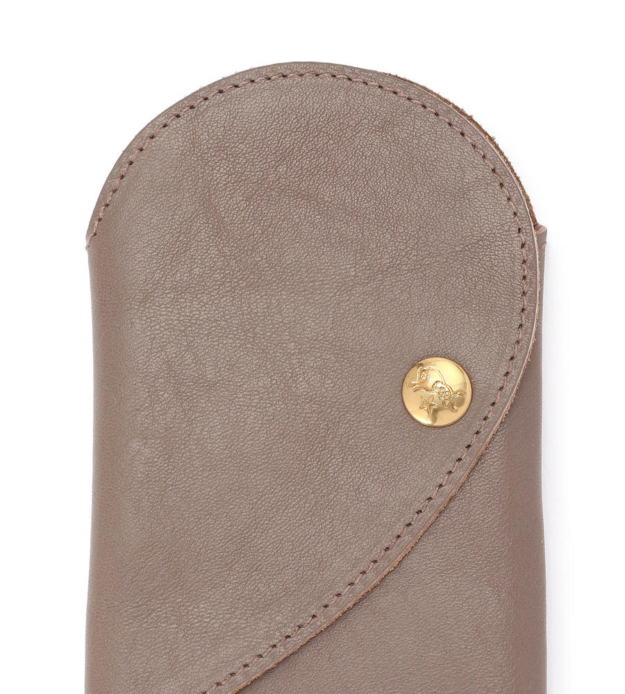 斜めに配したフラップのディテールが目を引くメガネケースです。バイソンロゴのワンポイントが効いたシンプルなデザインです。丁寧なステッチワークも高ポイント。