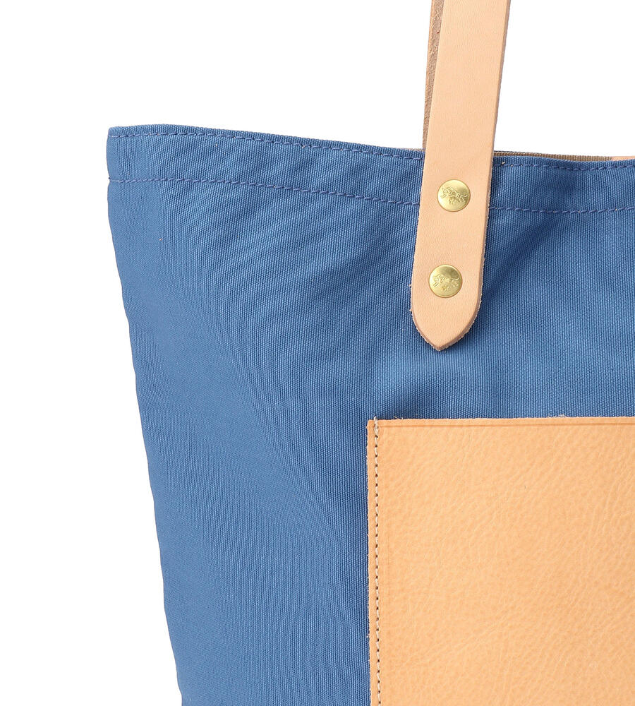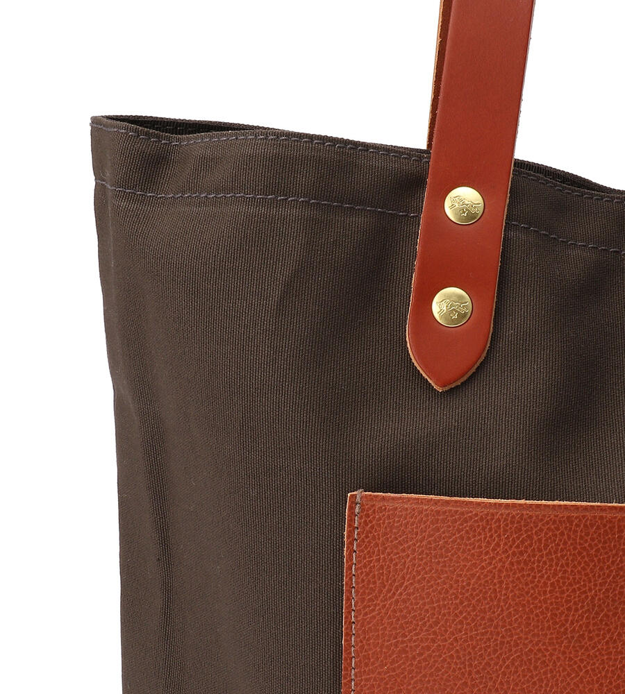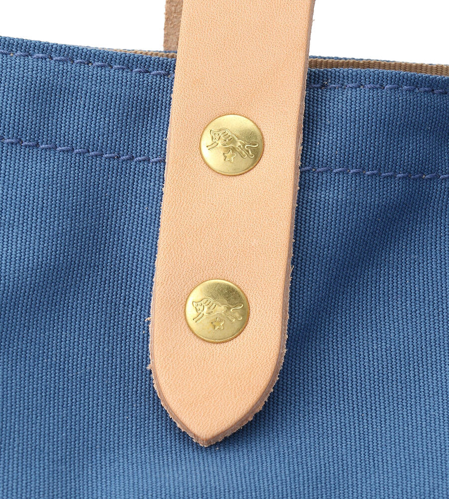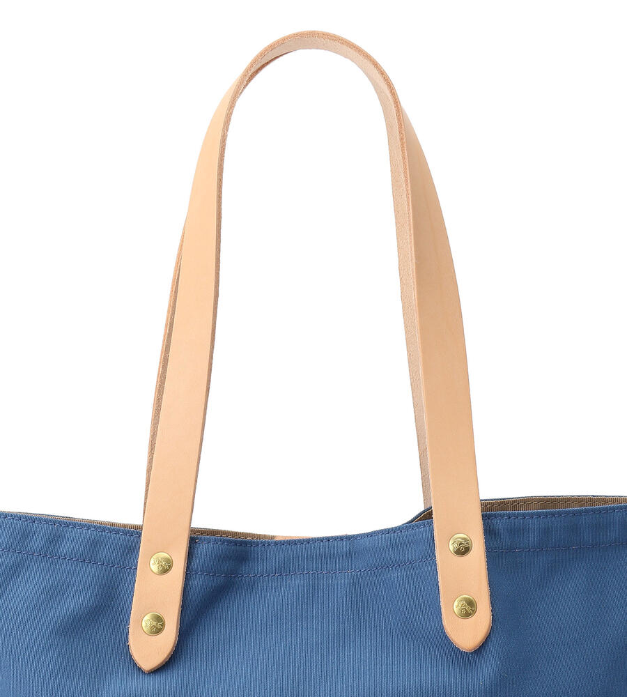 ハンドルとアウトポケットをレザーで切り替え、カジュアルエレガントなムードを演出したコットンハンドバッグ。マチつきのフォルム、間口はスナップボタン仕様。フロントにはブランドロゴの型押しがほどこされています。手持ちも、肩掛けもできる絶妙なハンドルの長さが使いやすさの決め手に。
