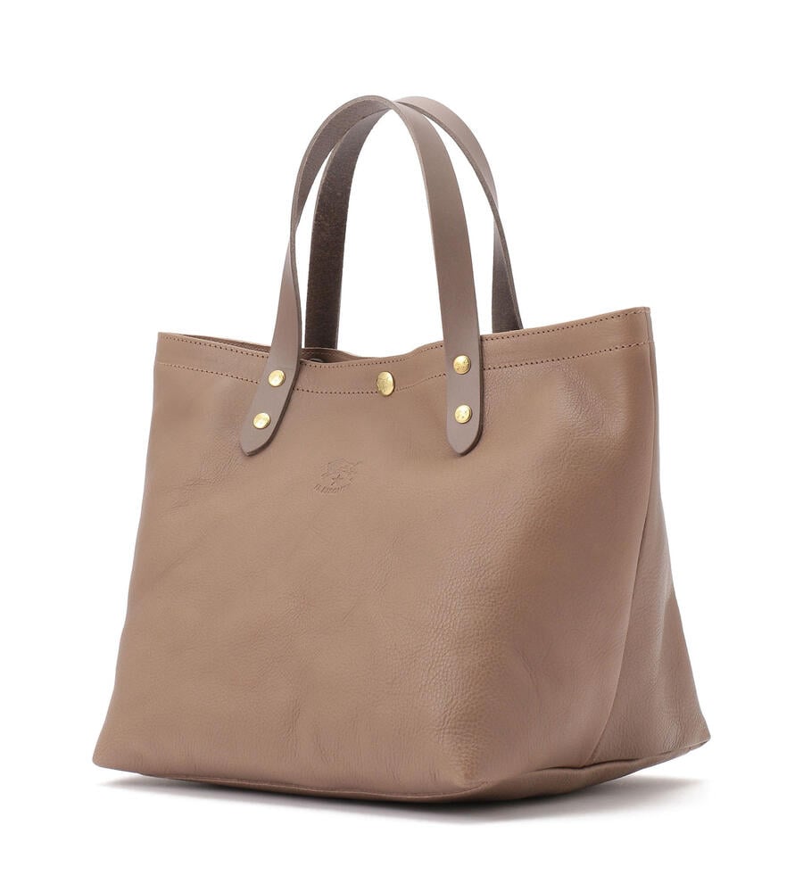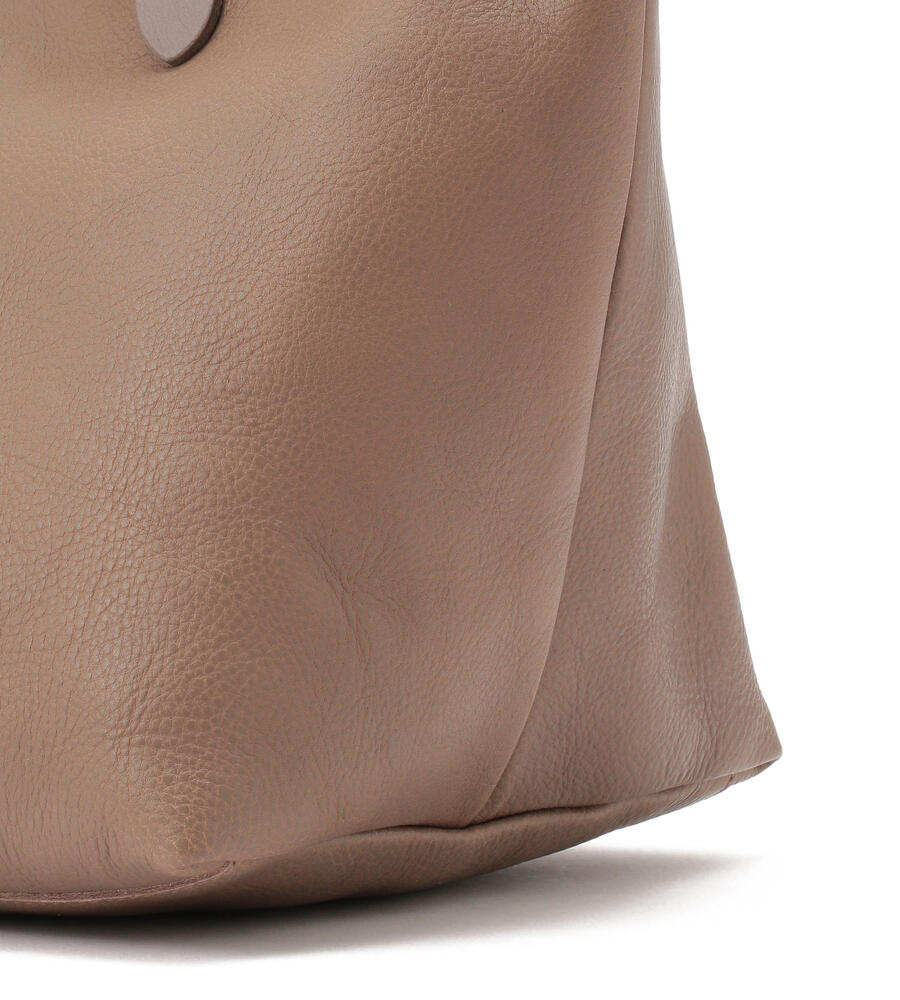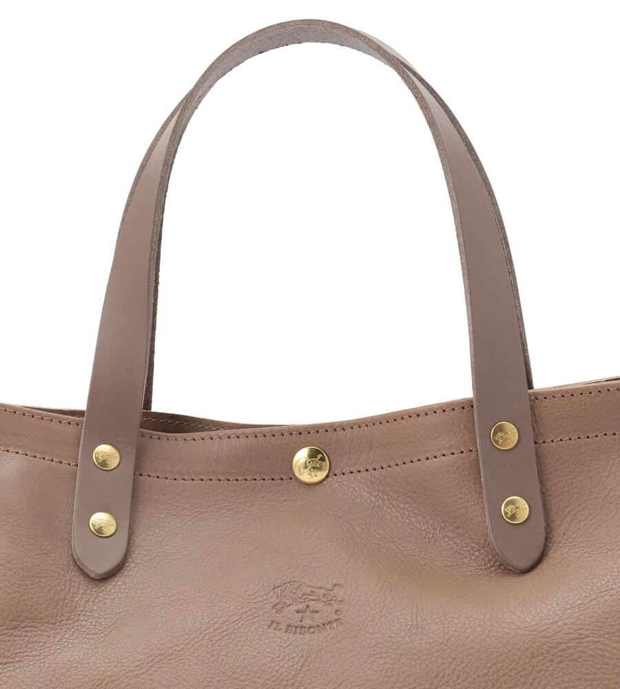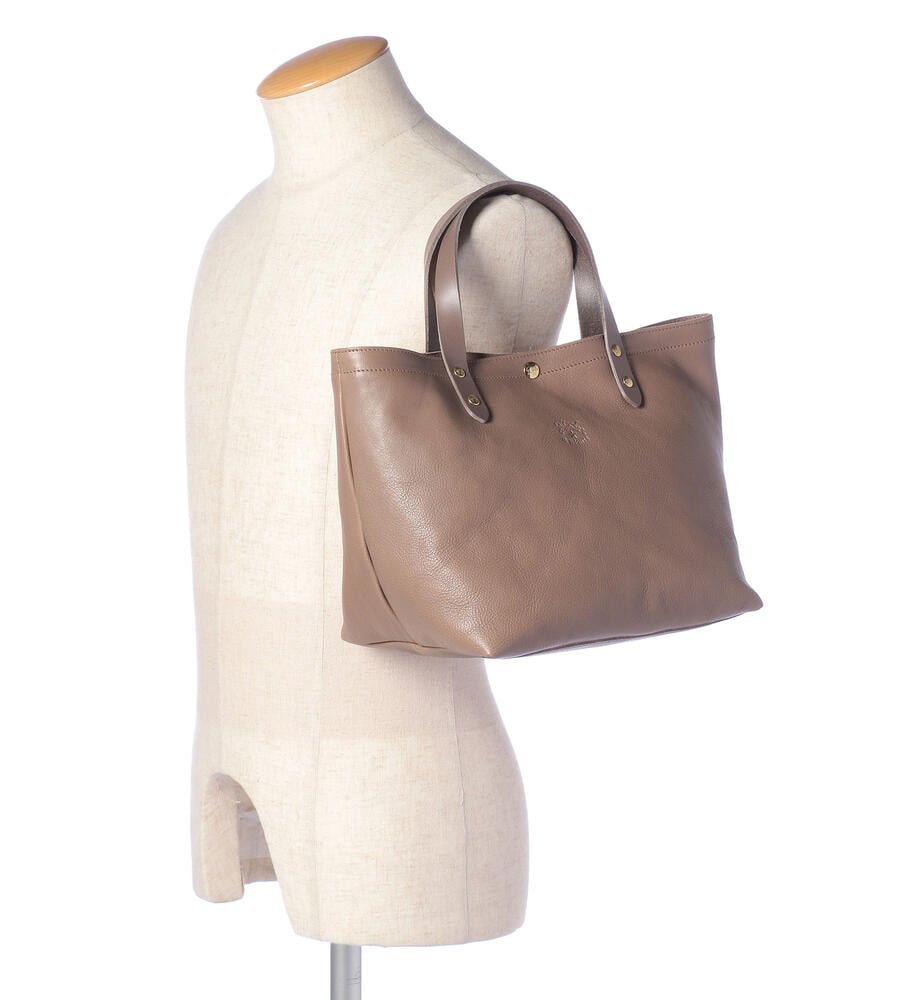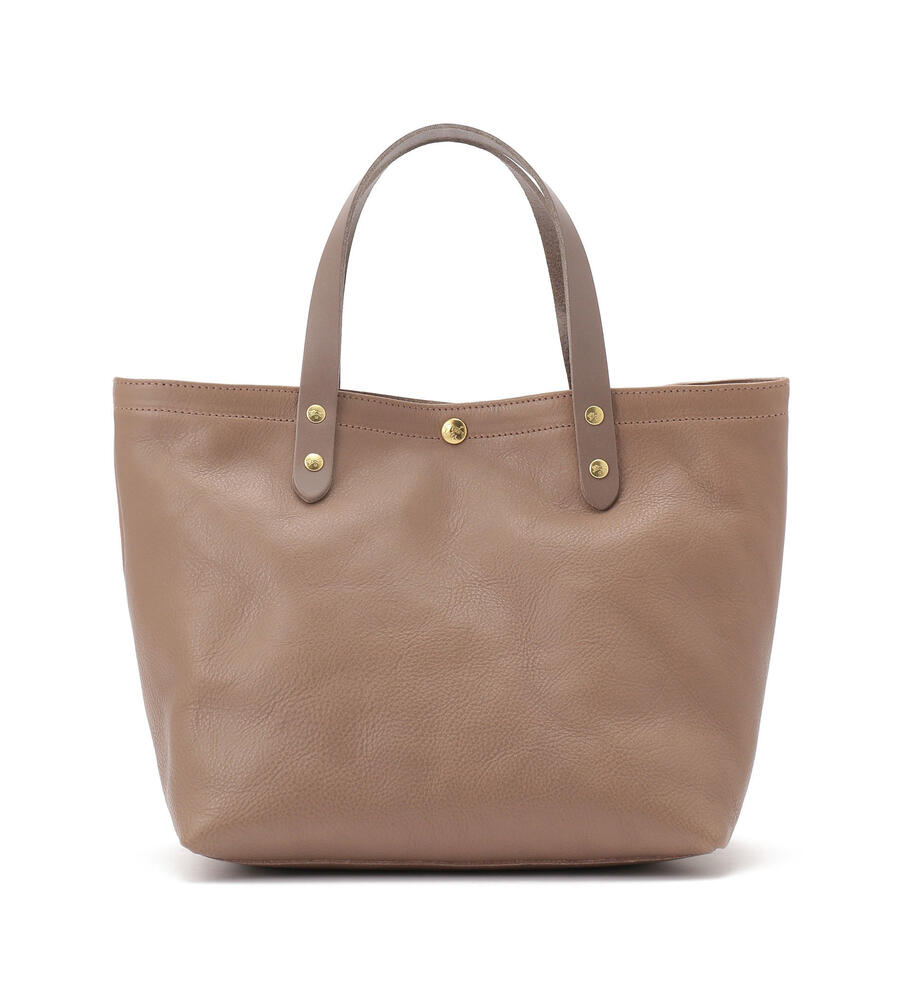 シンプルで洗練されたデザインがコーディネートに合わせやすいレザートートバッグ。フロントにはさりげなくバイソンロゴの型押しをあしらいました。キラリと光るゴールドのメタルボタンがリュクスな雰囲気をプラス。マチつきフォルムで収納力を高め、実用性にこだわり仕上げています。