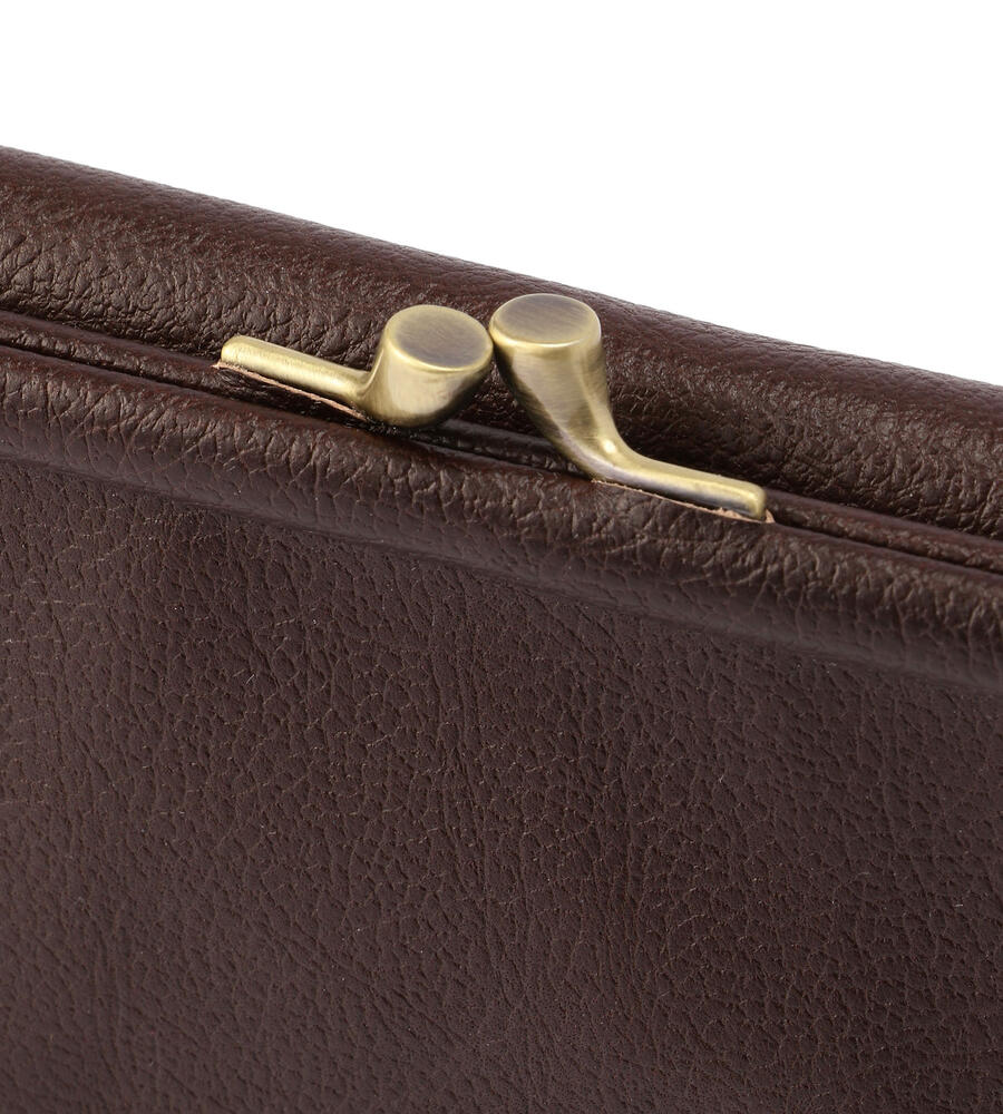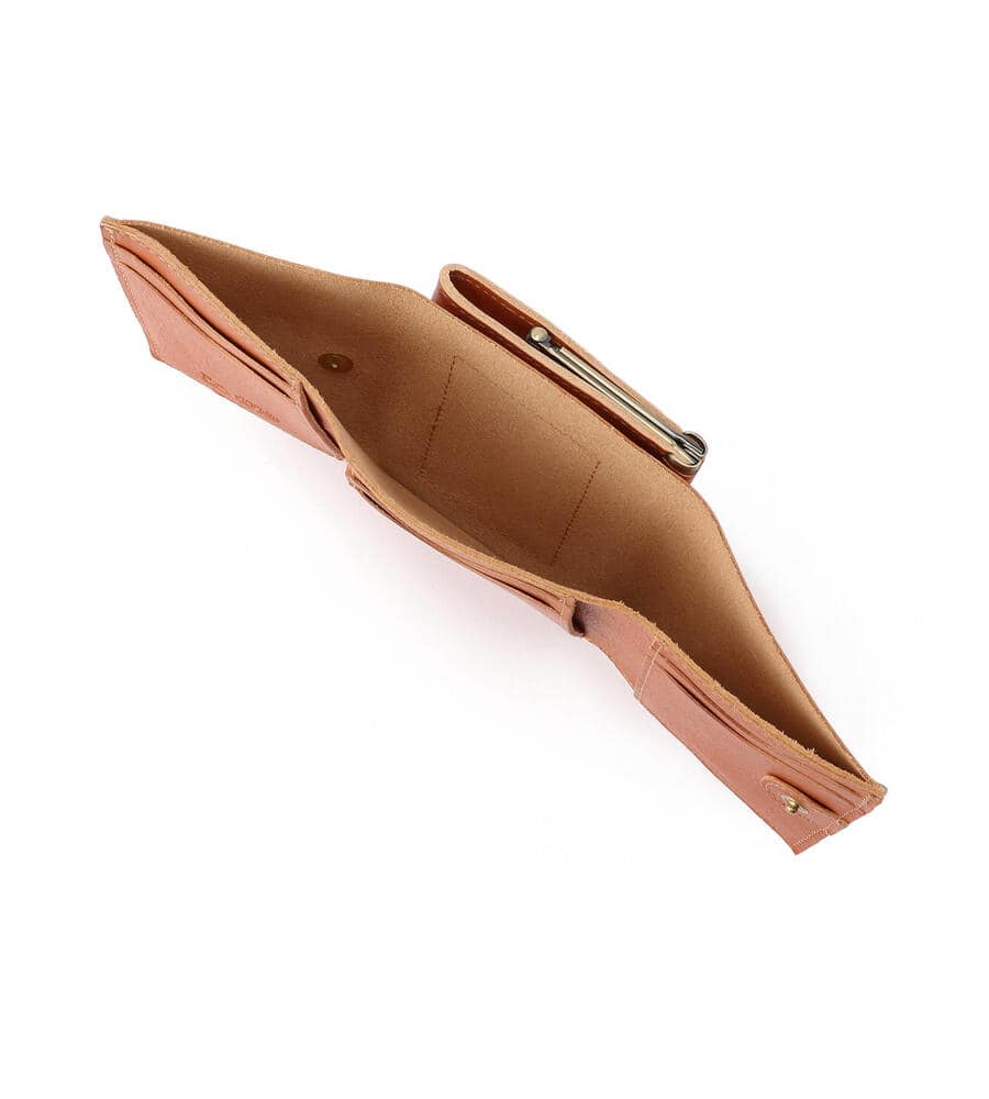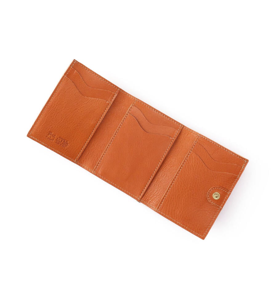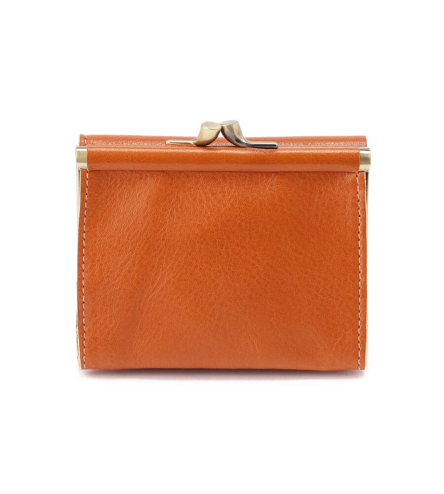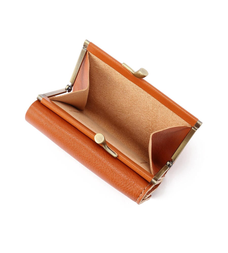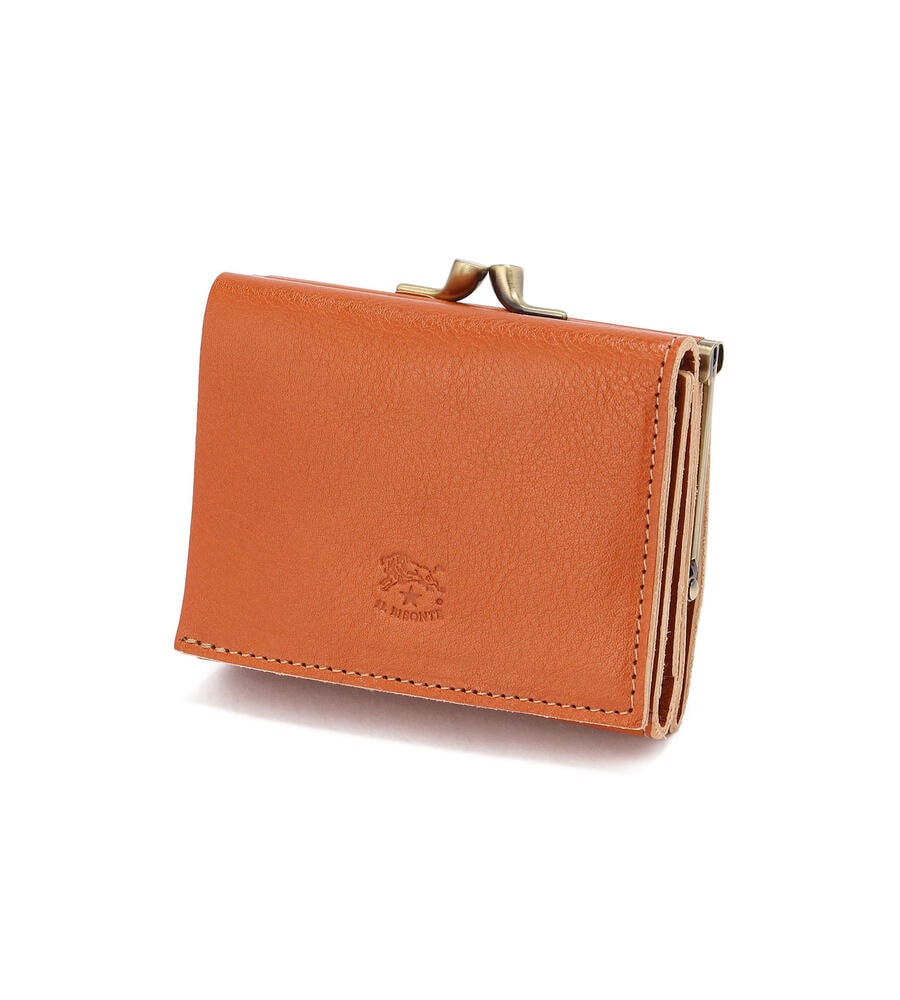 バイソンロゴの型押しがワンポイントになった3つ折りレザーウォレット。レトロなムード漂うがま口タイプのコインケース。スナップボタンを外すと内側にカードホルダーと札入れを備えています。