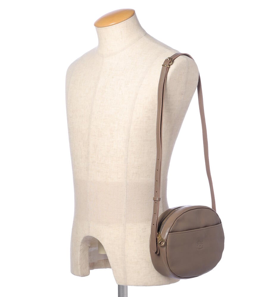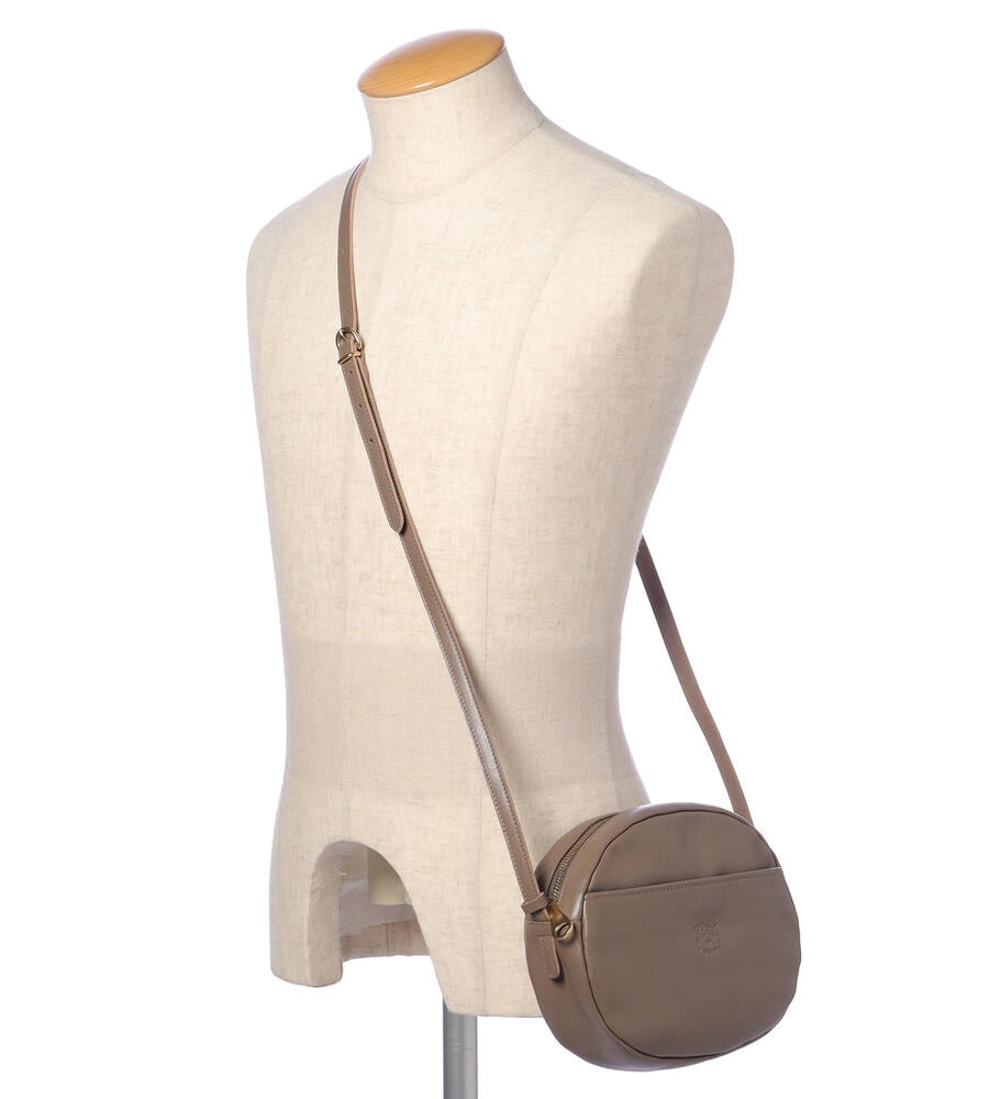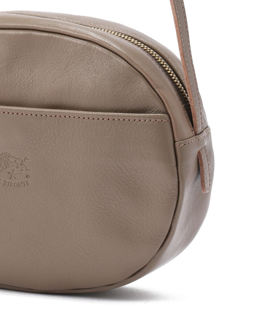 ころんとしたオーバル型のレザークロスボディバッグ。マチを確保したフォルムはコンパクトながらもしっかり収納できるのも嬉しい。間口はジップ仕様。アウトポケットが配置され、フロントにはバイソンロゴの型押しが施されています。