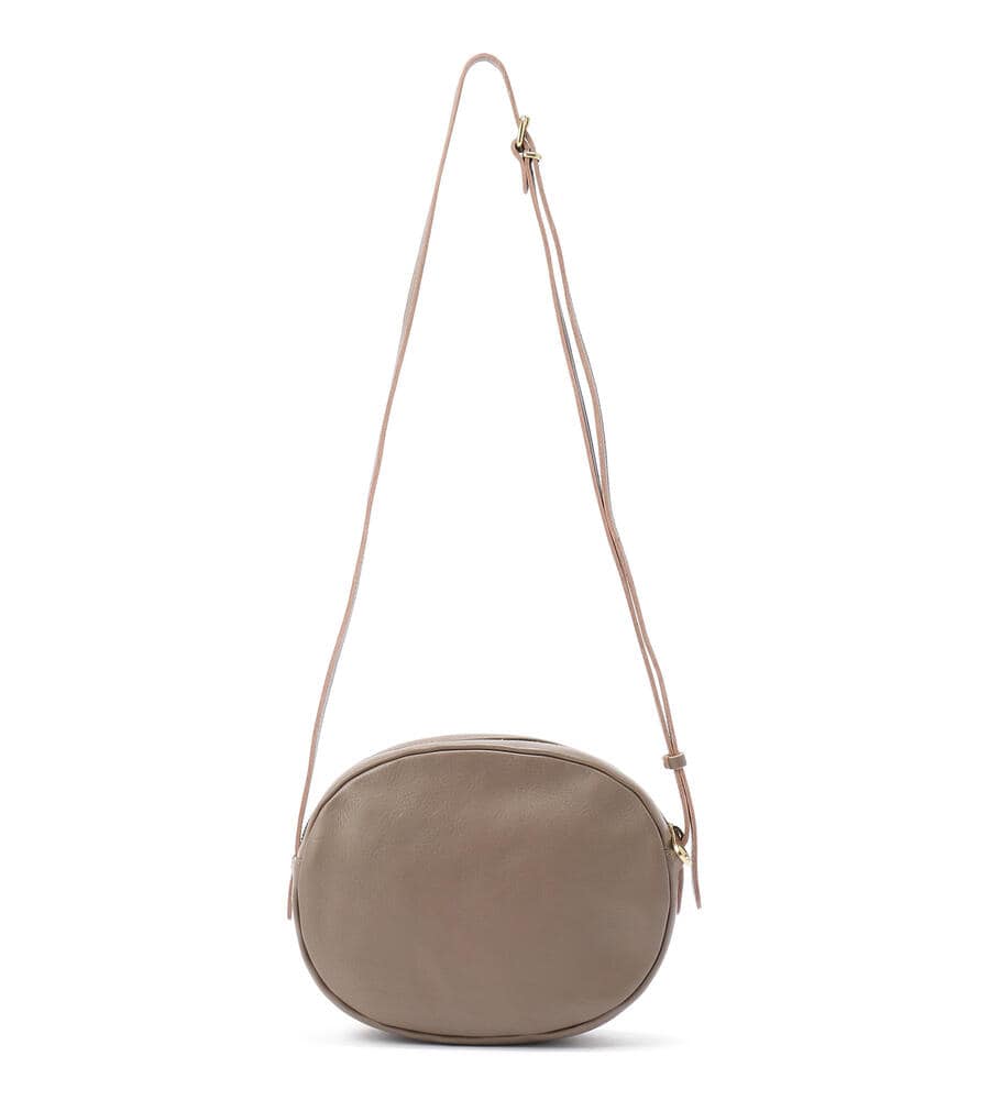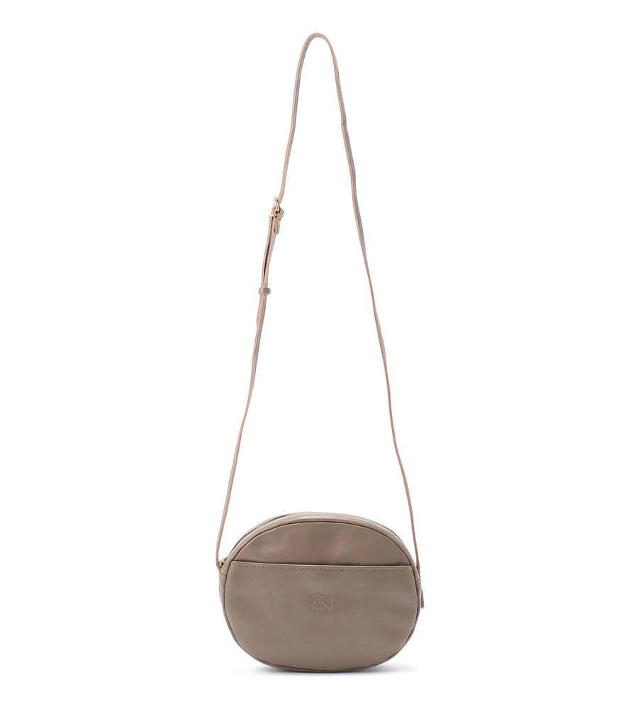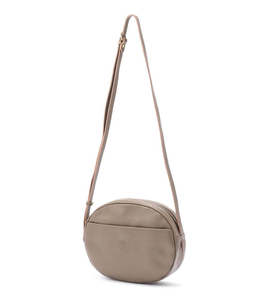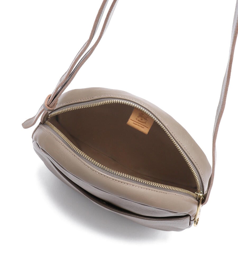 ころんとしたオーバル型のレザークロスボディバッグ。マチを確保したフォルムはコンパクトながらもしっかり収納できるのも嬉しい。間口はジップ仕様。アウトポケットが配置され、フロントにはバイソンロゴの型押しが施されています。