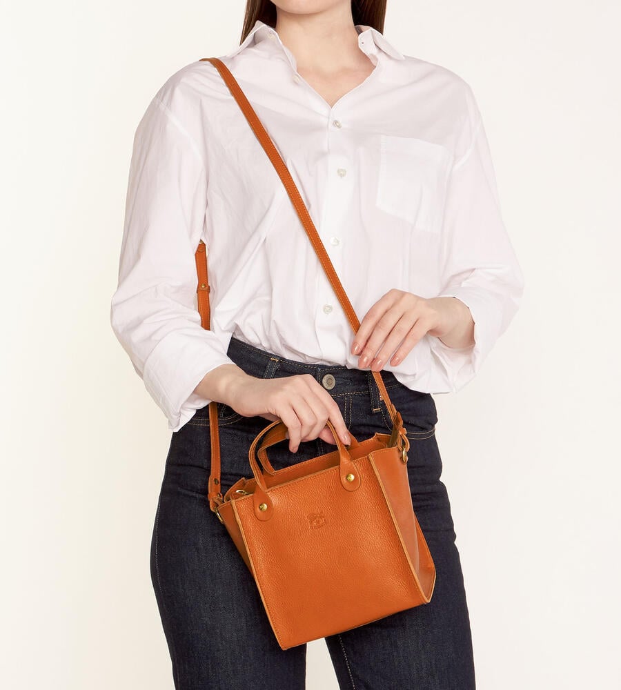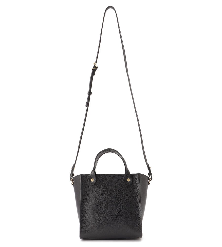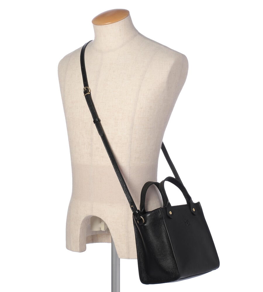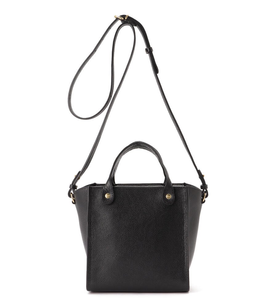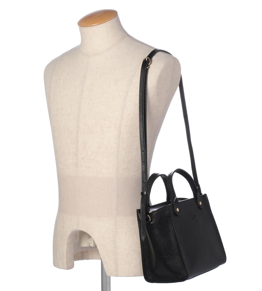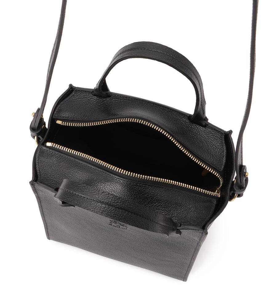 表情豊かなレザーの質感を楽しめるハンドバッグ。マチ付きフォルムで収納力を高めたデザイン。ゴールドの金具使いでリッチなニュアンスをプラスしています。手持ちもできるハンドル付き。ショルダーベルトは長さ調整が可能です。フロントにはブランドロゴの型押しがほどこされています。