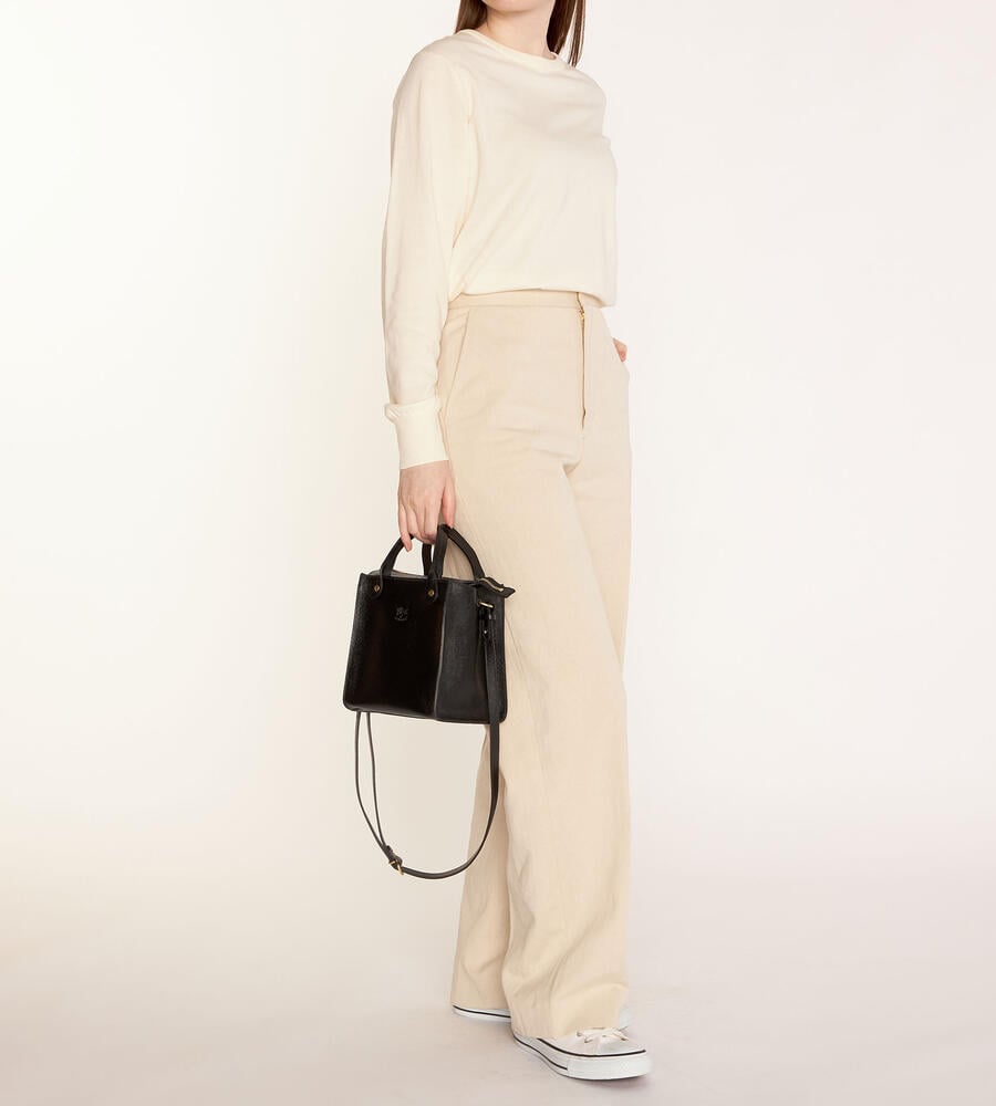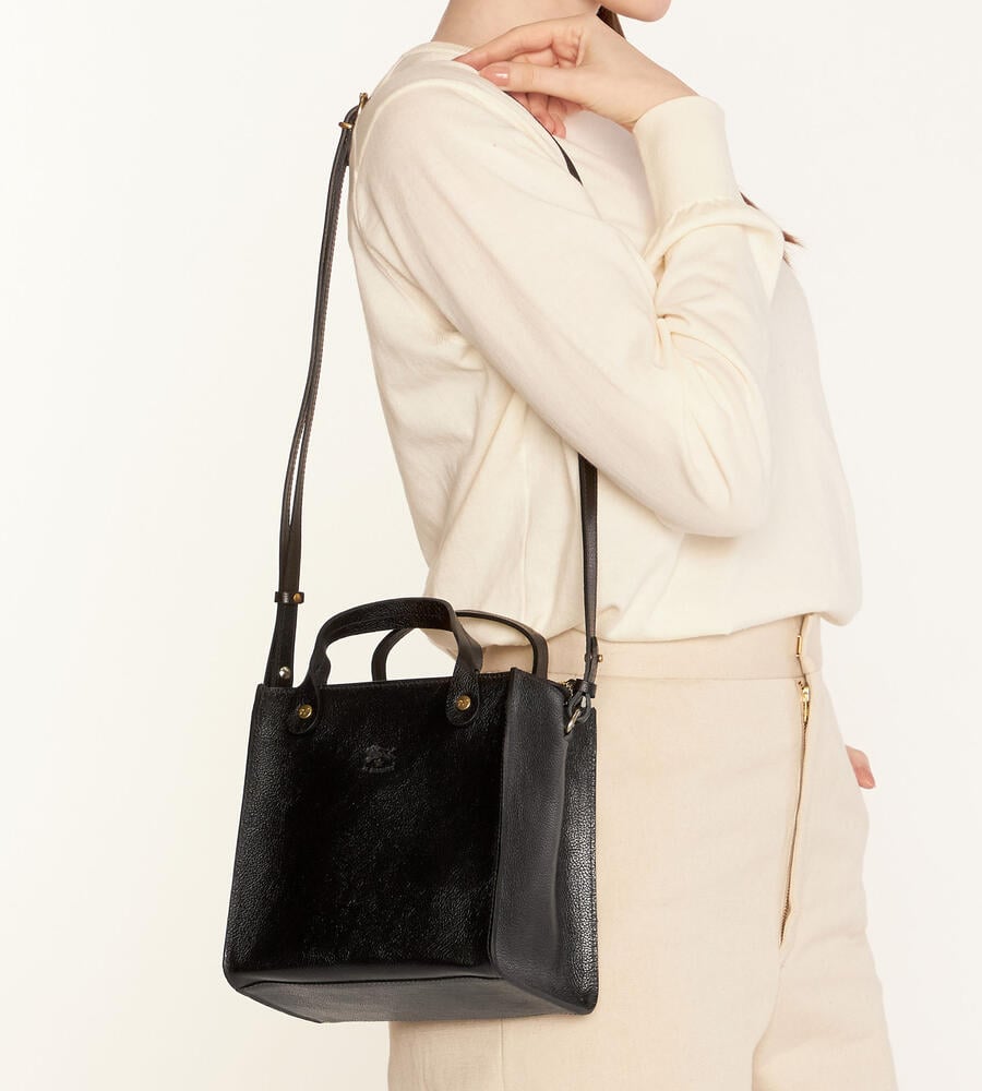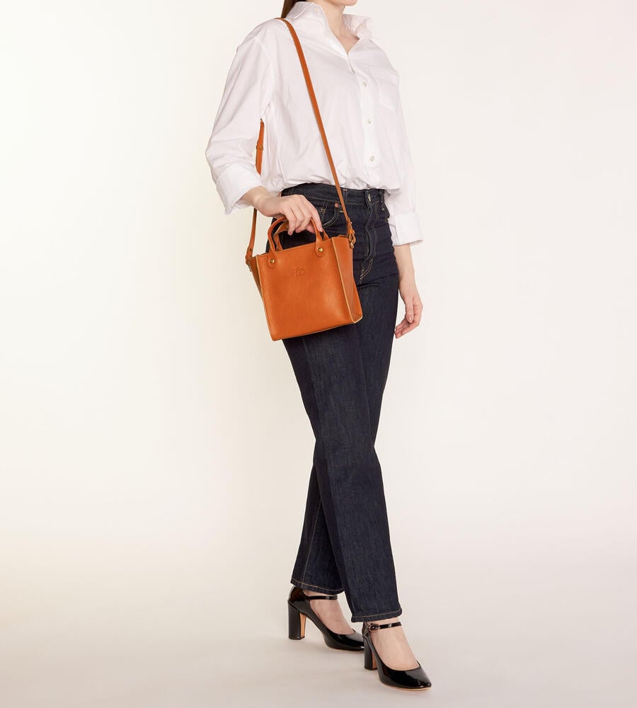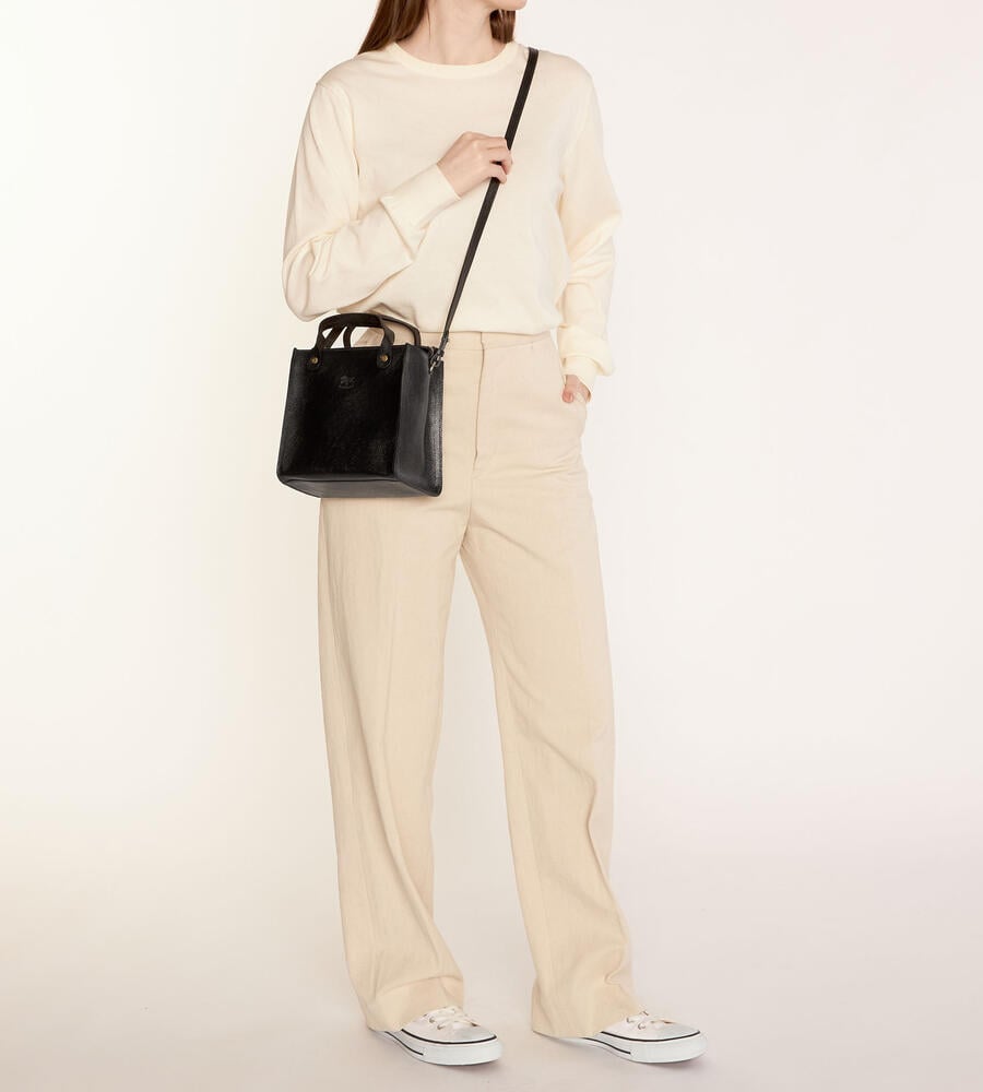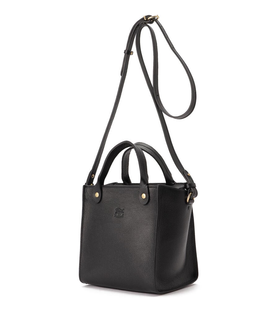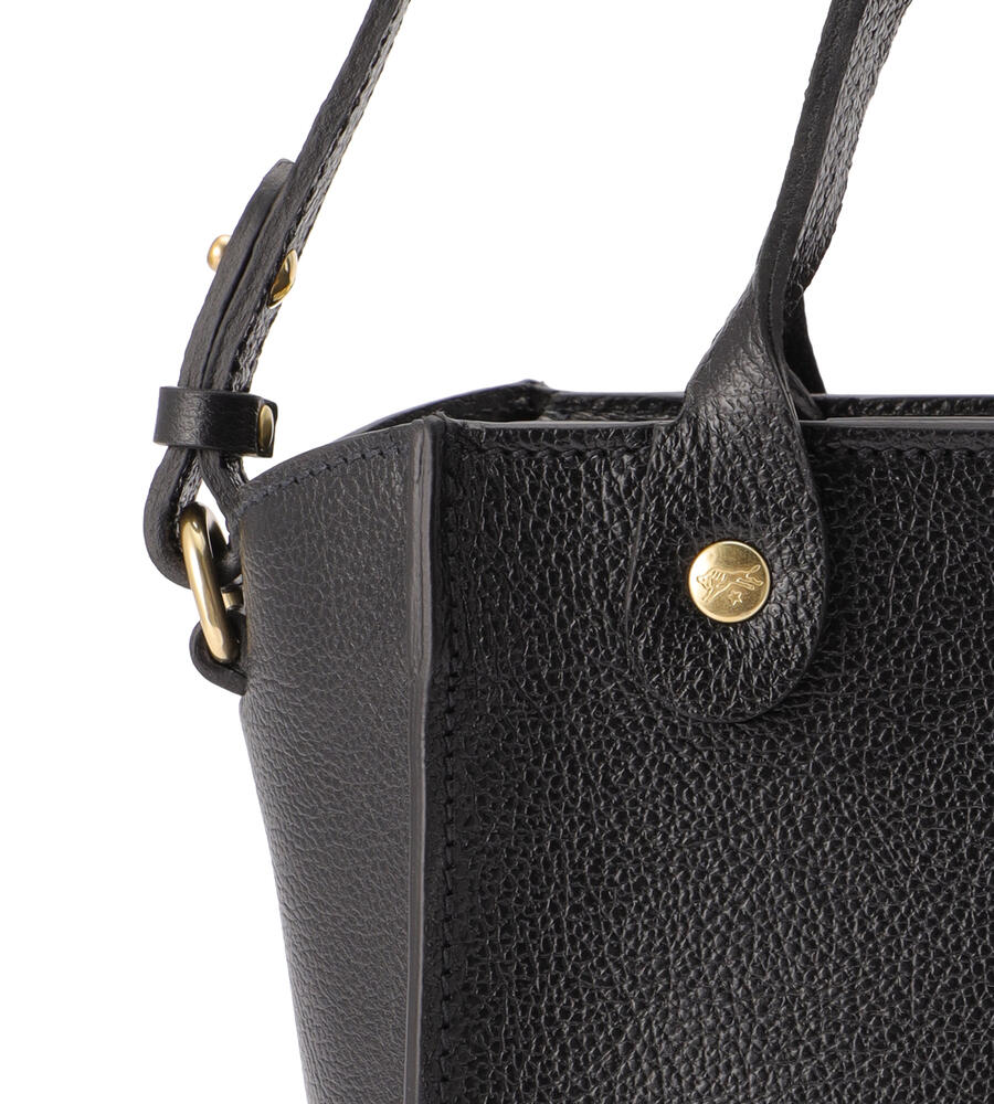 表情豊かなレザーの質感を楽しめるハンドバッグ。マチ付きフォルムで収納力を高めたデザイン。ゴールドの金具使いでリッチなニュアンスをプラスしています。手持ちもできるハンドル付き。ショルダーベルトは長さ調整が可能です。フロントにはブランドロゴの型押しがほどこされています。