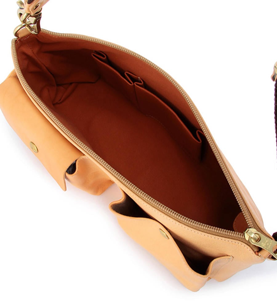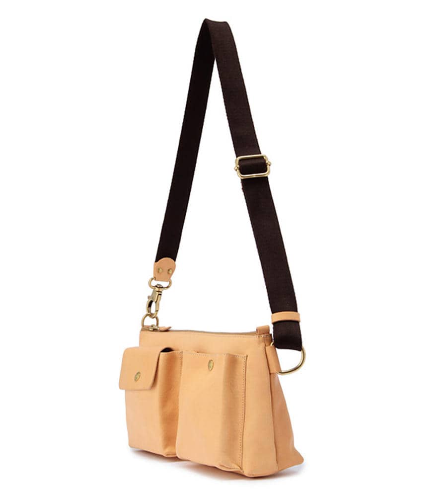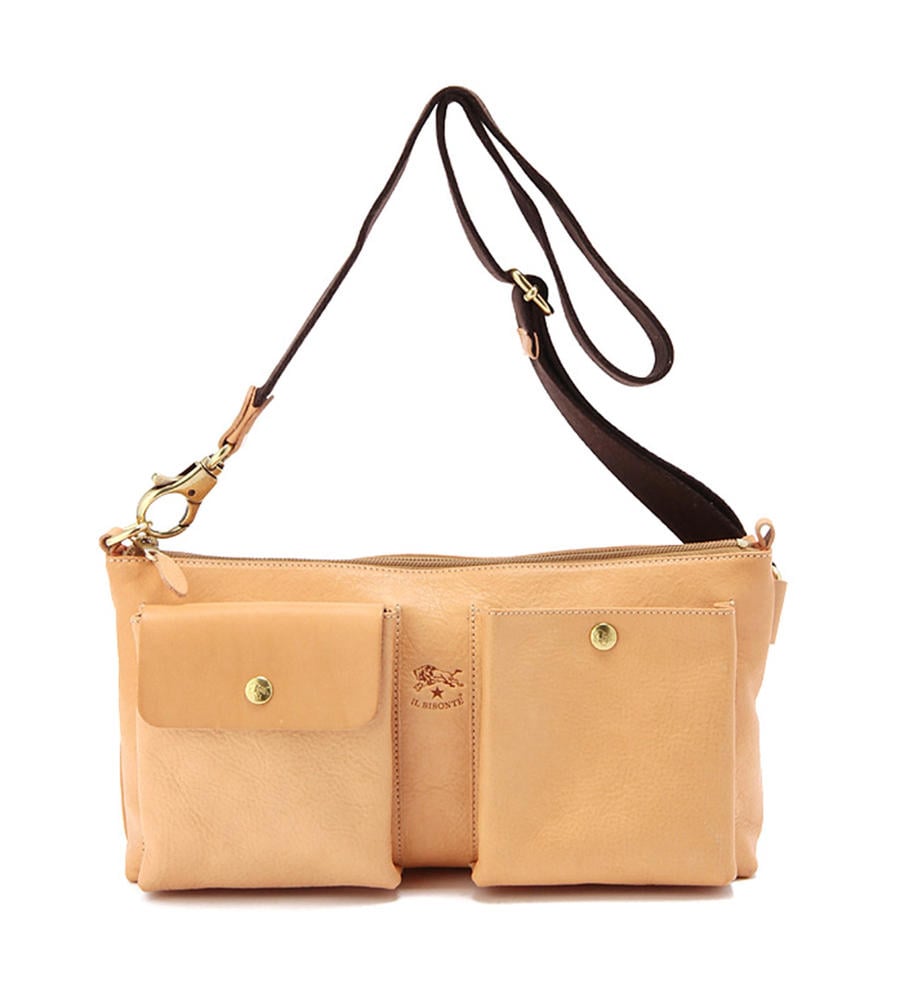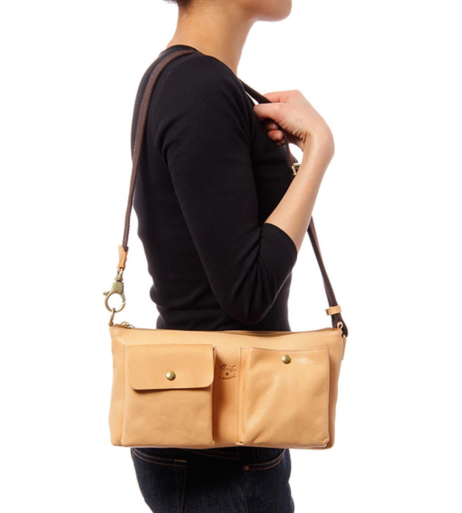 ダブルのポケットが特徴のレザーバッグ。内側には携帯を入れるポケットも配置されています。飽きの来ないシンプルなアイテムです。