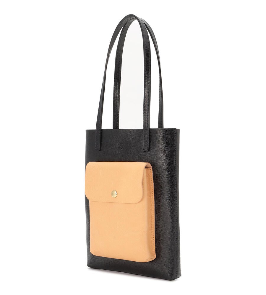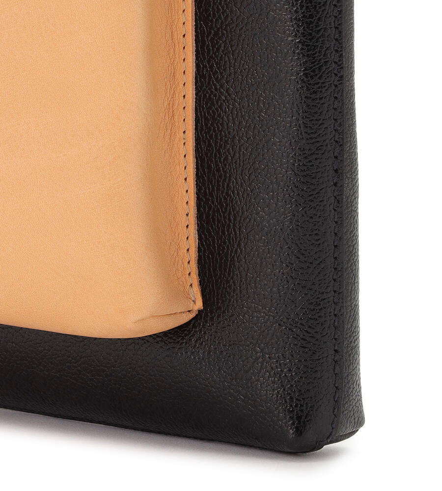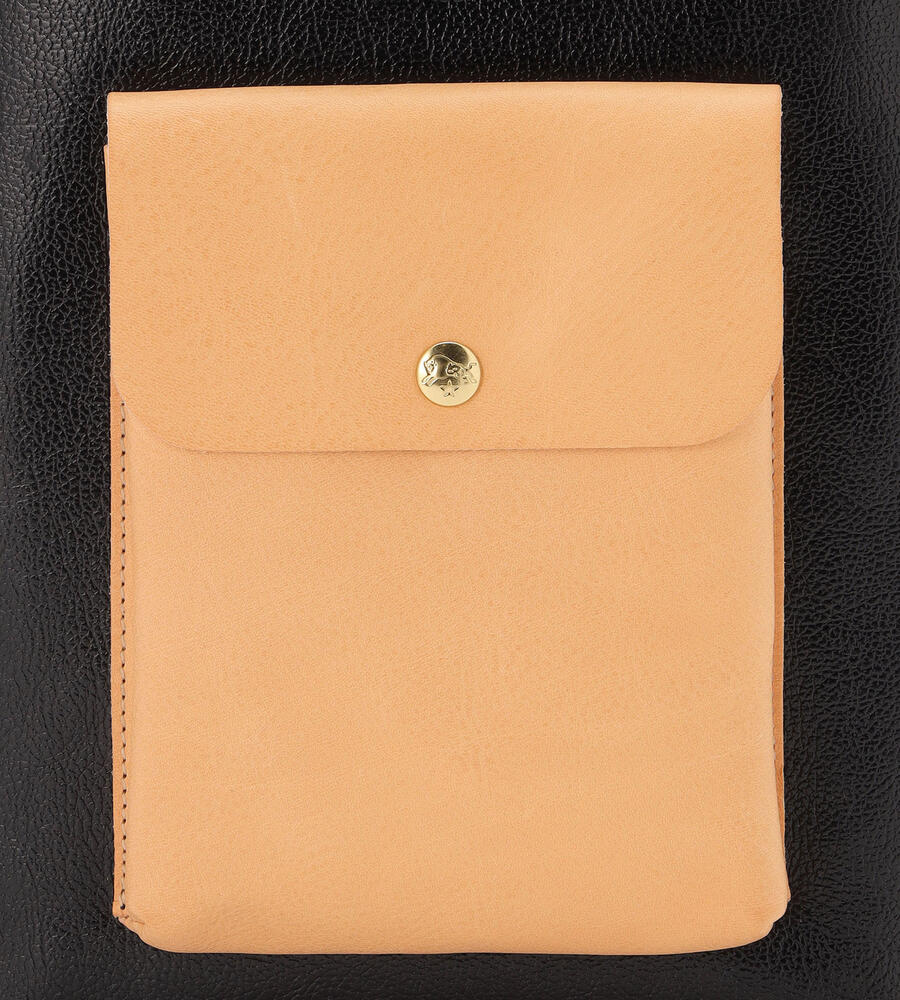 ブラックレザーにアイコニックなヌメ革のポケットを配した、遊び心あふれるデザイン。イル ビゾンテの職人技を活かした立体的なつくりは、ユニークな見た目と使いやすさを両立。ヌメ革ならではのエイジングもお楽しみいただけます。