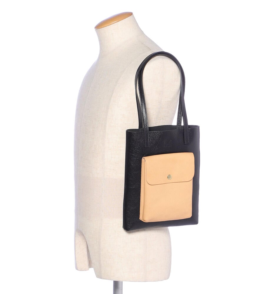 立体的なヌメ革のフラップポケットをあしらった、ユニークなデザインのトートバッグ。小物類の出し入れもスムーズに行える機能的な設計。コントラストカラーがスタイリッシュな印象を与えます。気軽にお出掛けできるコンパクトなサイズ感が今の気分にぴったり。