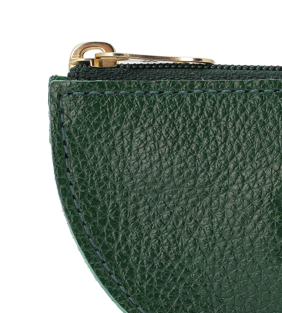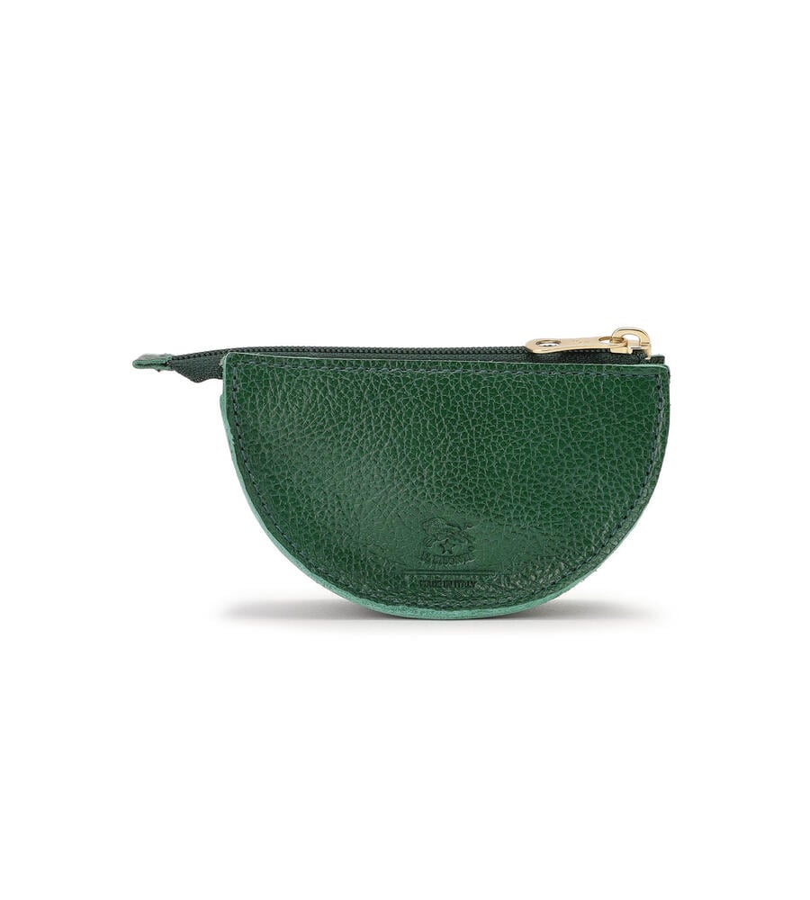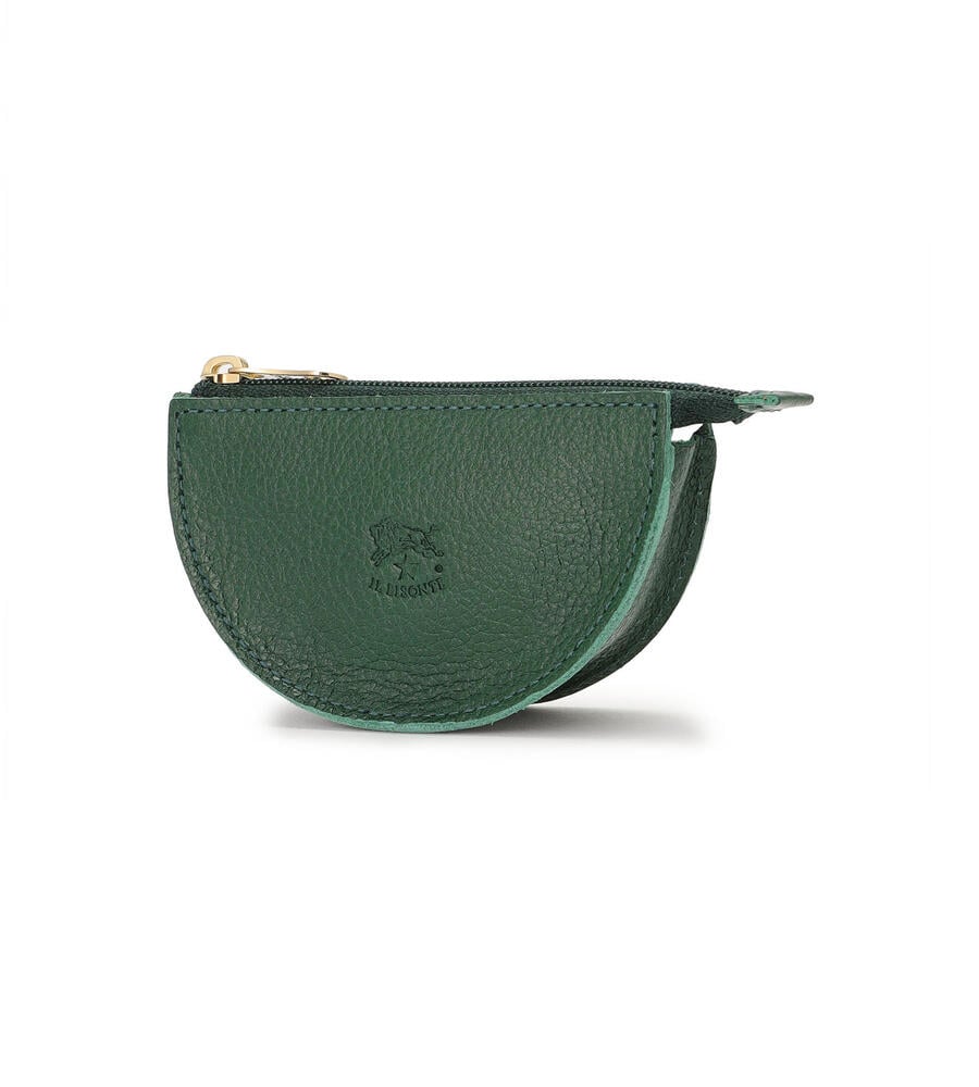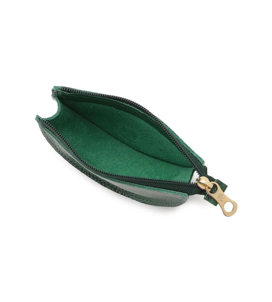 シボのあるしなやかな皮革素材を用いたコインパースです。丸みを帯びたフォルムにはしっかりとしたマチがあり、コインを収納しやすい形状。ジップが大きく開くため、中身が見やすく出し入れしやすいつくりです。かさばらないスマートなデザインで小さめのバッグの中にもすっきりと収まるのが特徴です。