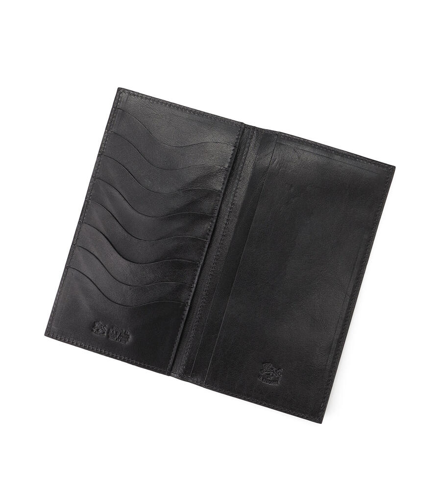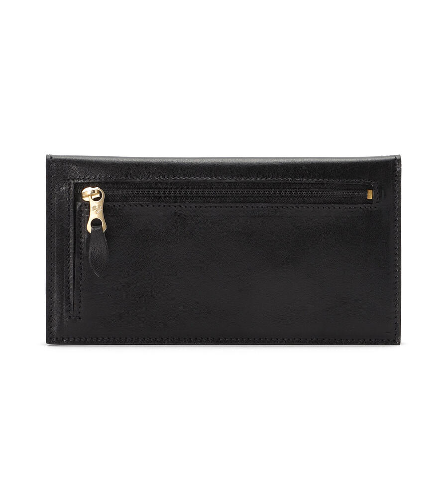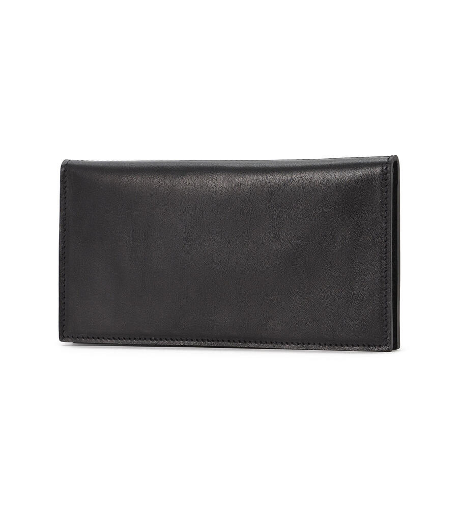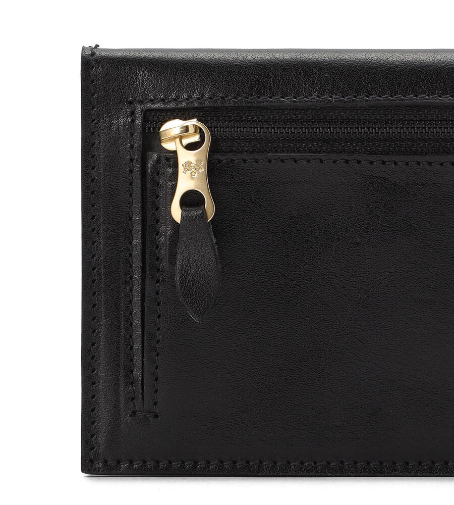シンプルで洗練されたデザインが美しいレザーの質感を際立たせるロングウォレット。背面にはマチつきのファスナーポケットを配置。内部にはたっぷり収納可能なカードホルダーと札入れを備えています。さりげなく添えたブランドロゴの型押しもポイントに。