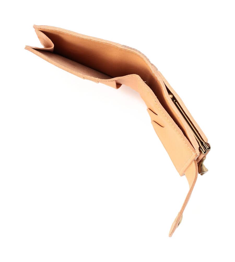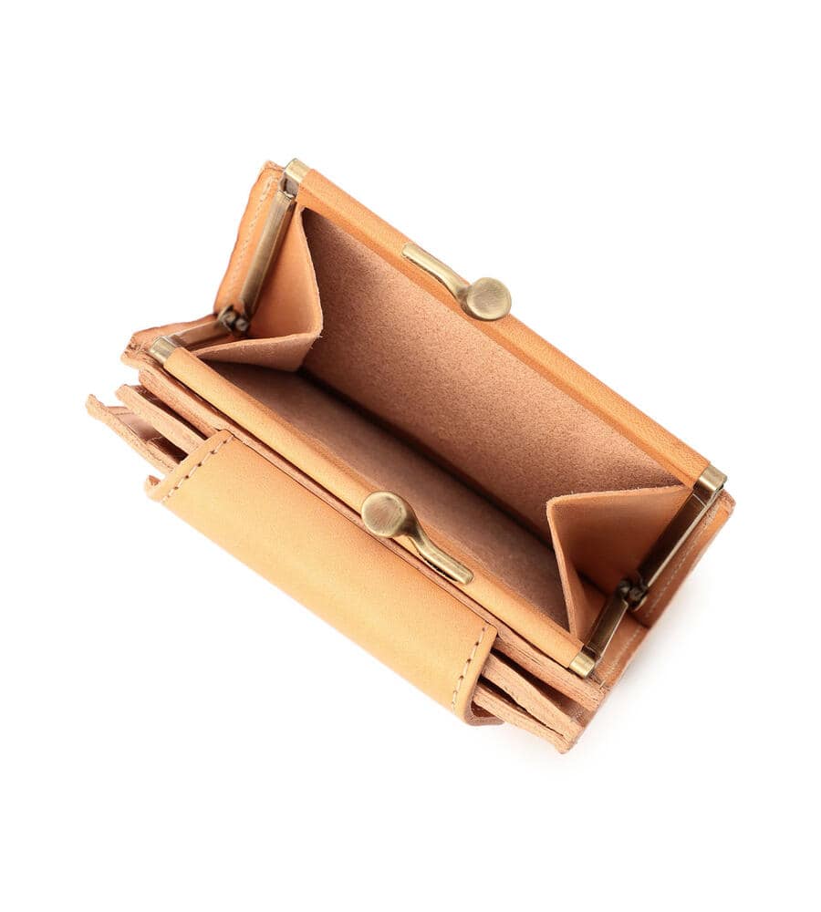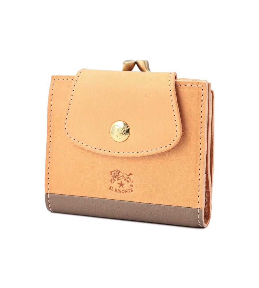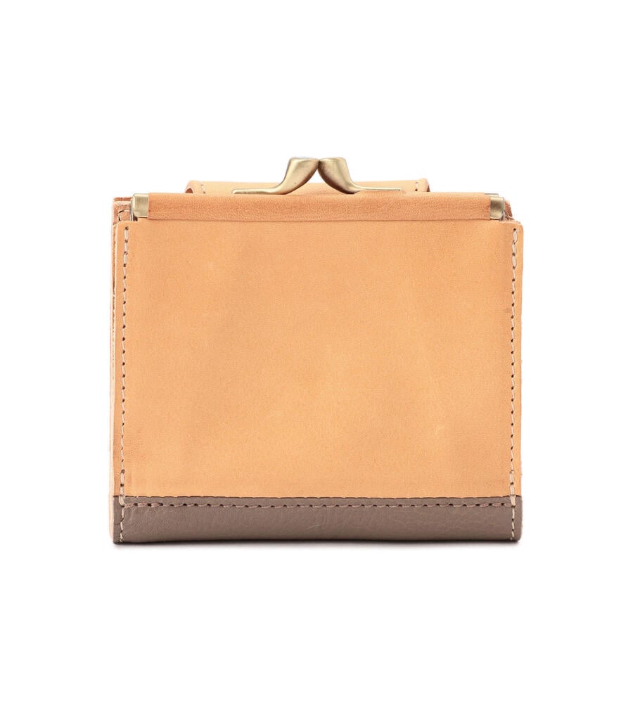 変形フラップや切り替えデザインがポイントの二つ折り財布。コイン収納部分はクラシカルな雰囲気のがま口開きを採用しています。カードポケットも備えており、小ぶりながらも使い勝手にこだわった作りです。