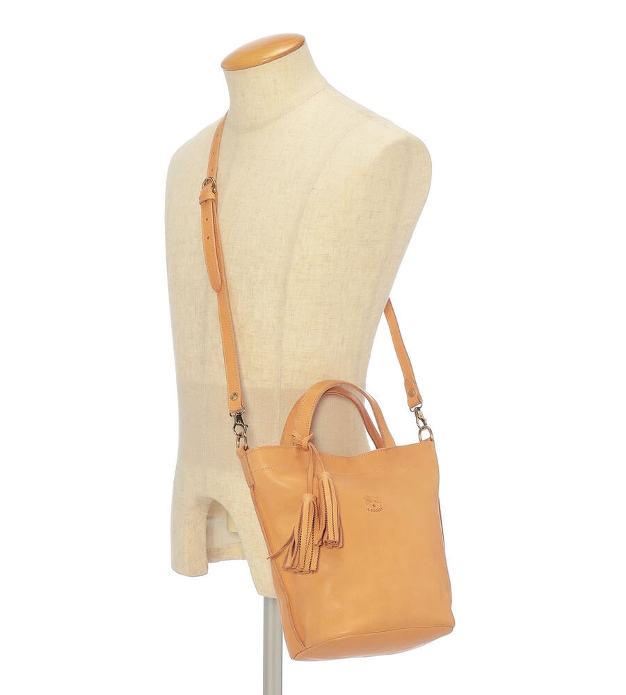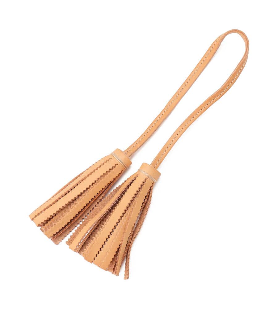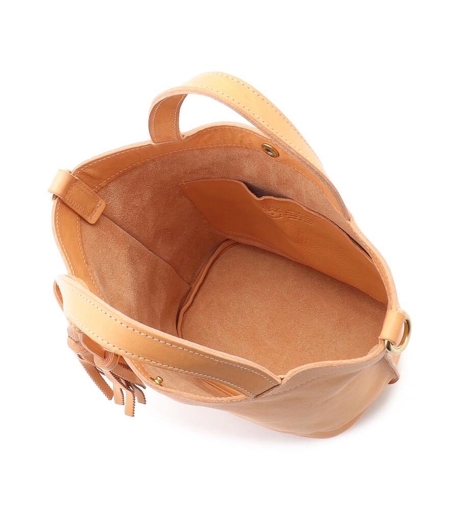 ショルダーベルトで肩掛けも可能な2WAY仕様のトートバッグ。ロゴマークの型押しをワンポイントにしたシンプルなデザインです。マチ幅が広く、さまざまなアイテムを収めやすいシルエット。レザーのタッセルチャームも付属しています。