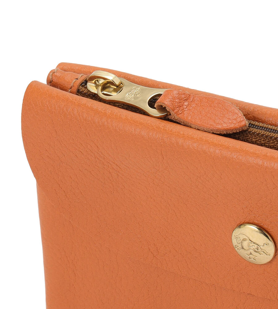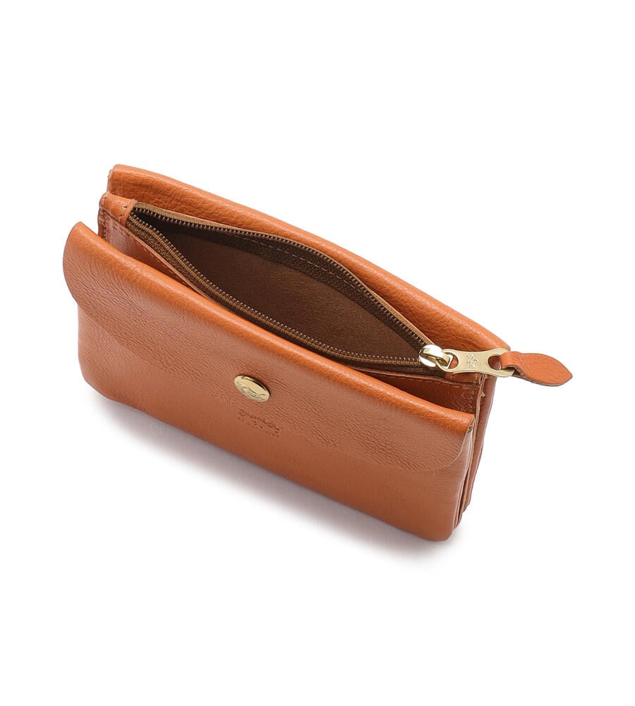 前後をフラップポケットタイプのコンパートメントにして、中央をジップポケットにしたトリオコンパートメントのミディアムウォレット。片手に収まるスマートなサイズ感です。カードやコインなどをコンパクトにまとめられるのが特徴。紙幣は折って収納することができます。