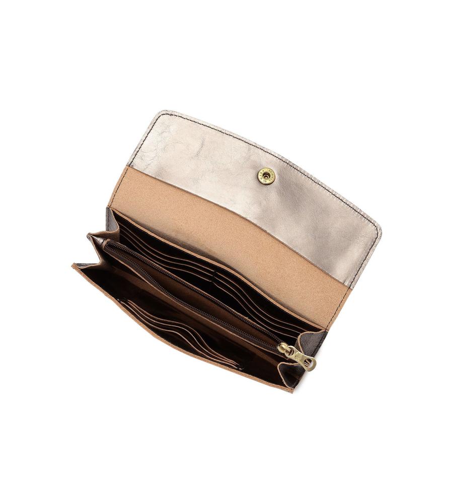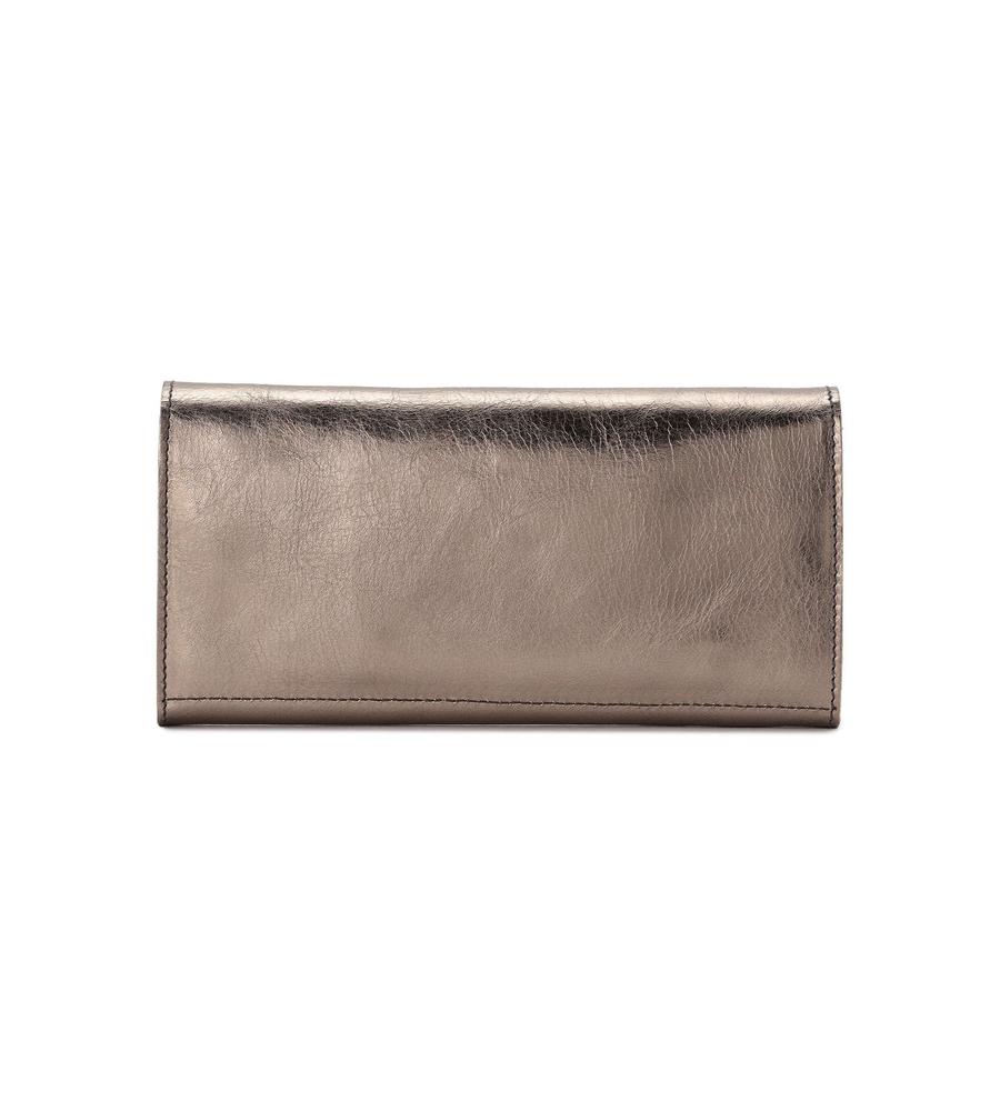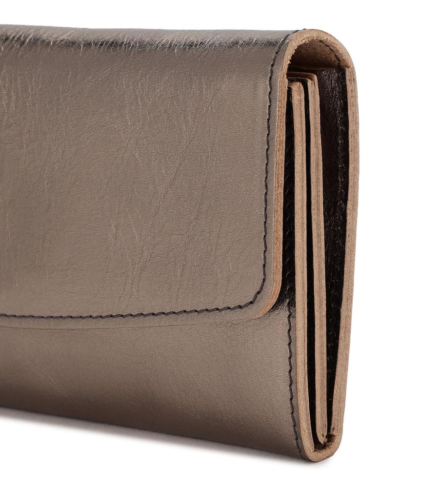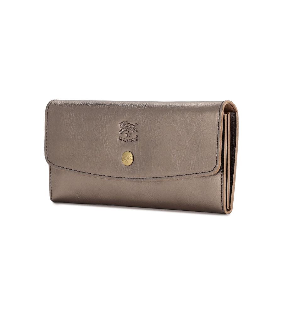 メタリックカラーが目を惹くロングウォレット。フロントにはブランドロゴの型押しとゴールドのスナップボタンがスタイリッシュなデザインアクセント。立体的なポケットはジップ付きのコインケースと充実のカードケースで収納力抜群のアイテムです。