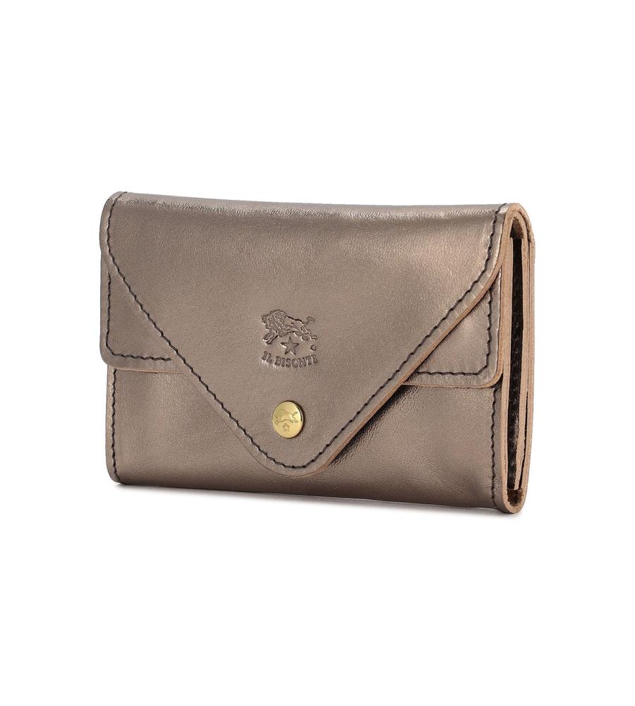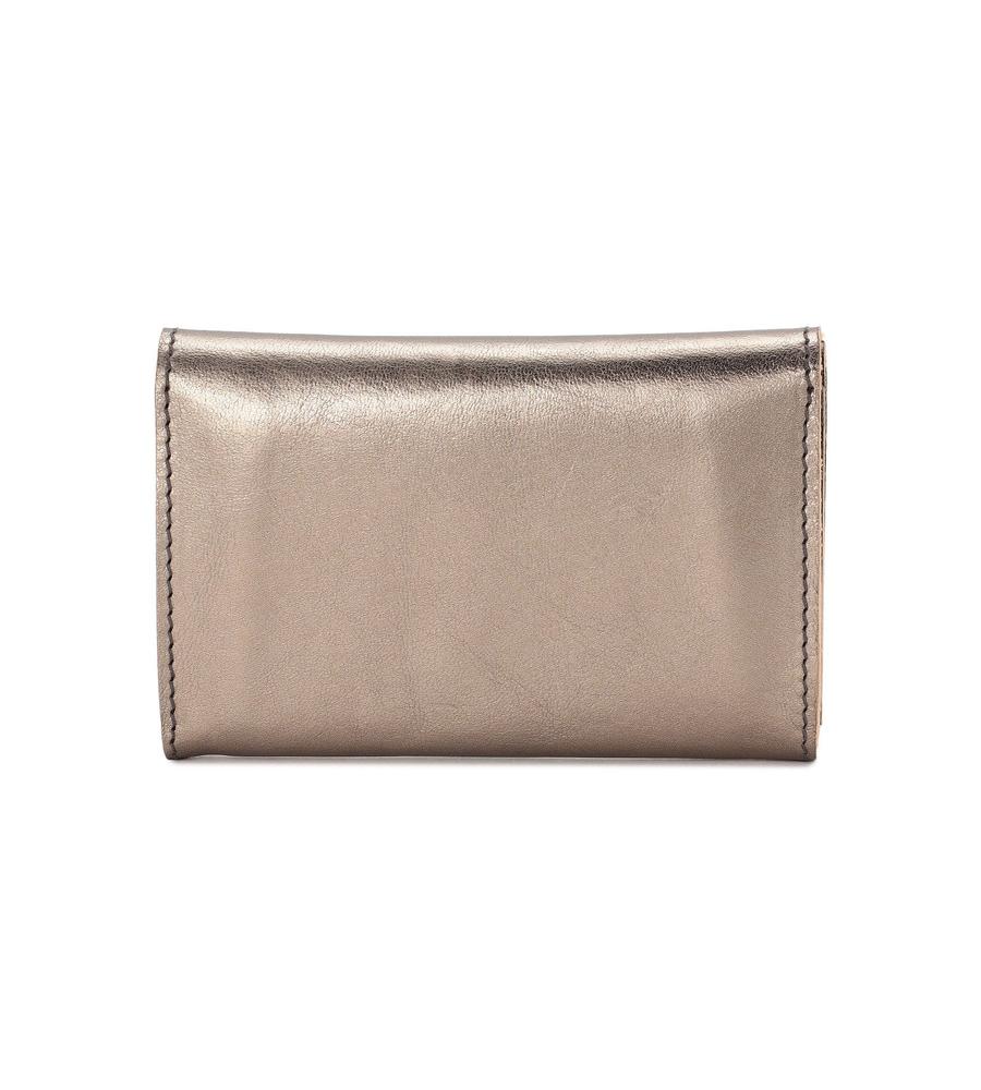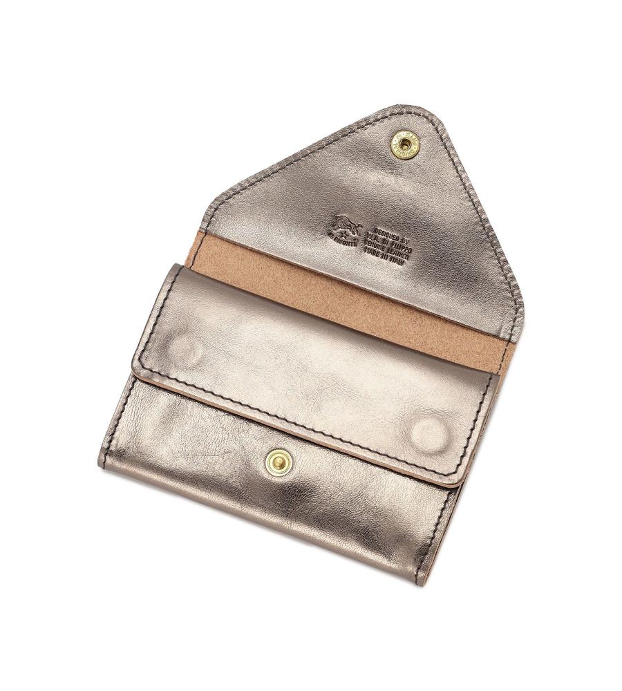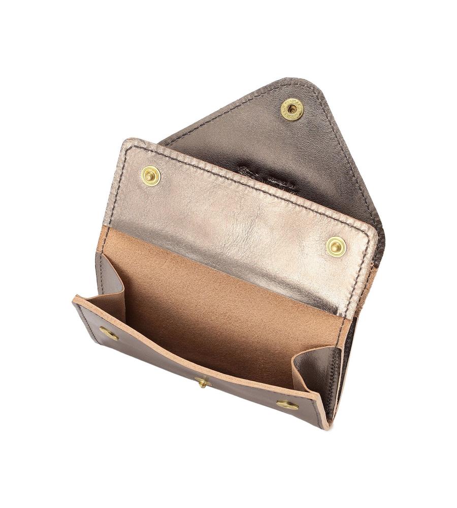 ダブルフラップのカードケース。きらりと輝きのあるメタリックカラーが華やかで印象的。フロントのブランドロゴの型押しがおしゃれなデザインアクセント。ポケットが2つに分かれているため、収納・整理がしやすく実用性も抜群のアイテムです。