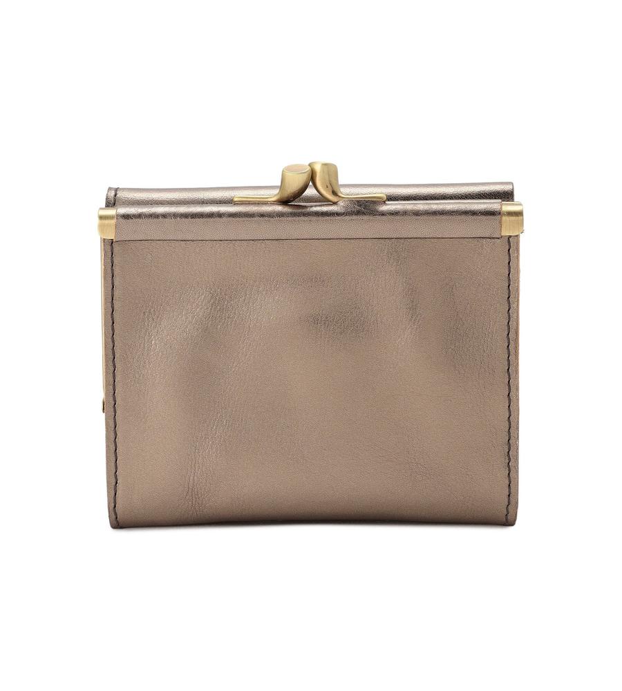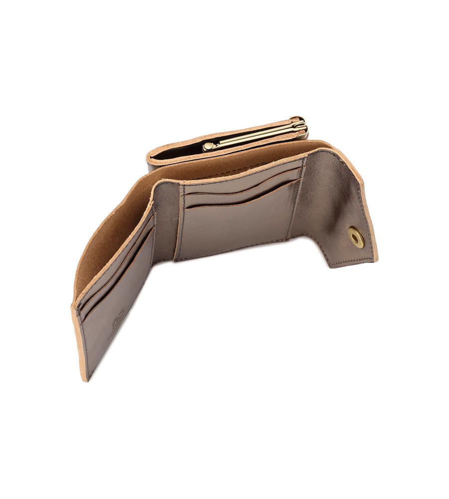 メタリックカラーのミニウォレット。フロントのブランドロゴの型押しがおしゃれなデザイン。コンパクトなサイズ感でミニマルなお出かけスタイルにぴったり。コンパクトながらもがまぐち仕様の立体的なコインケース、カード入れ、お札入れ付きで使い勝手も抜群です。