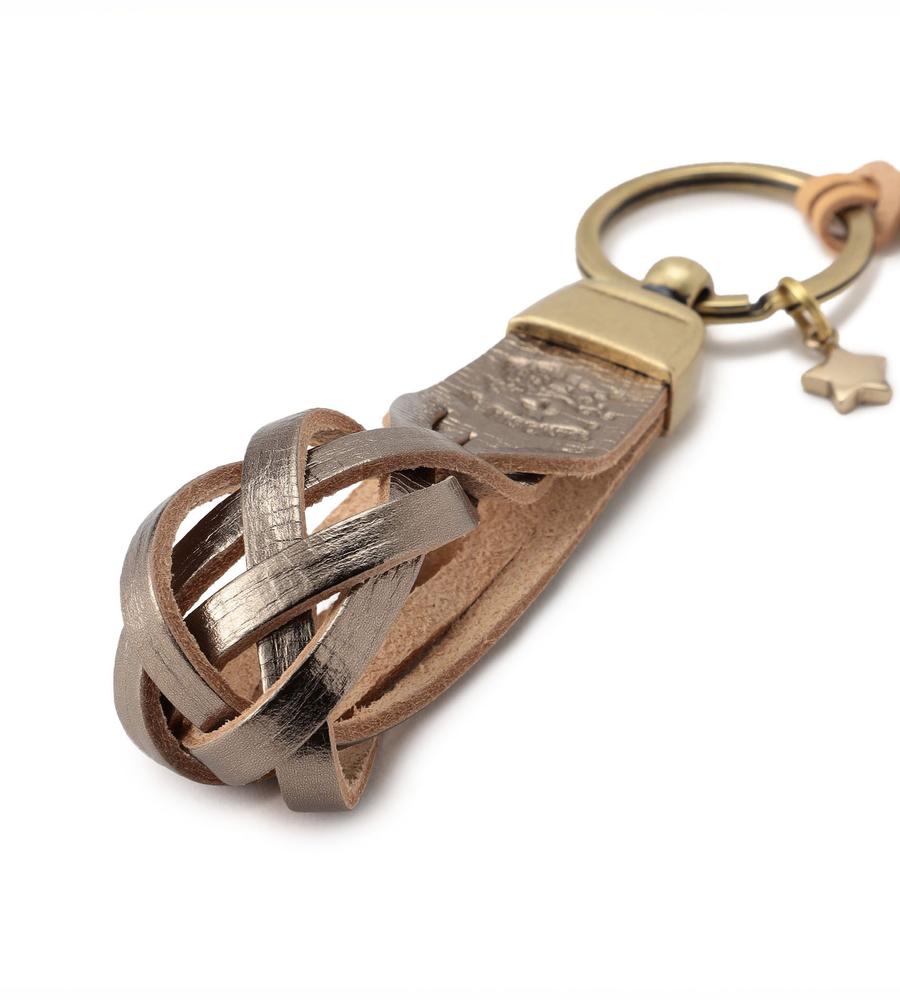 輝きのあるメタリックカラーが目を惹くキーリング。ブランドロゴの型押しとレザー編みのストラップがエレガントなデザイン。星の小さなチャームとレザーのブランドタグもおしゃれなポイント。鍵を簡単に付けられるキーリングのシンプルなデザインです。