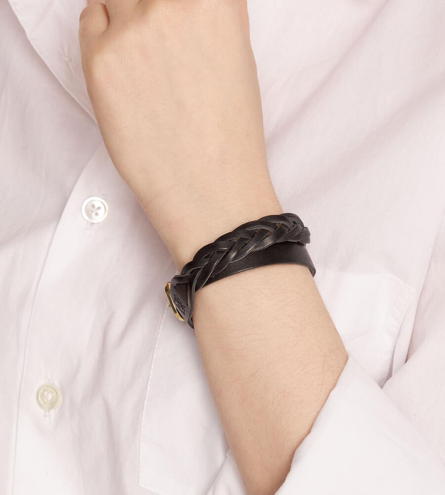 レザーを編み込んだデザインのブレスレット。2重に巻いたレザーは適度にボリュームがあり、シンプルコーデのアクセントに。アンティークライクなバックルもポイント。