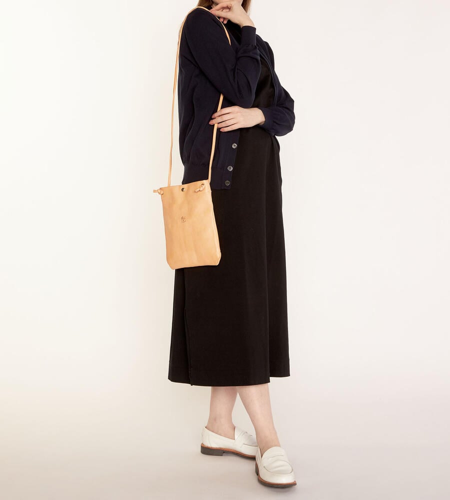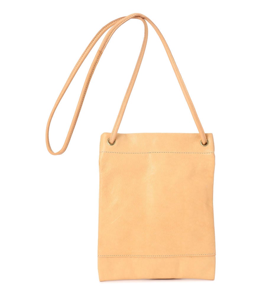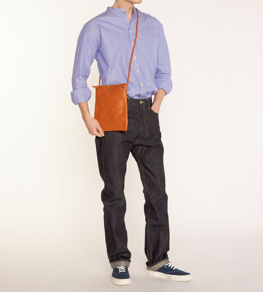 フラットな縦長フォルム、スリムなショルダーベルトがシンプルで洗練された印象のレザーバッグ。開口部はスナップボタン仕様で中身の出し入れもスムーズ。フロントにはブランドロゴの型押しがほどこされています。