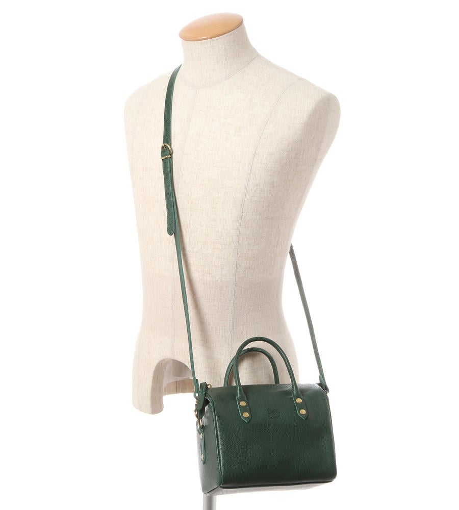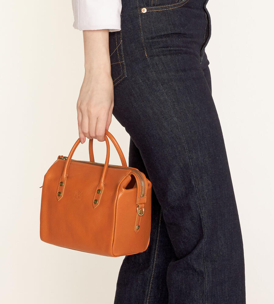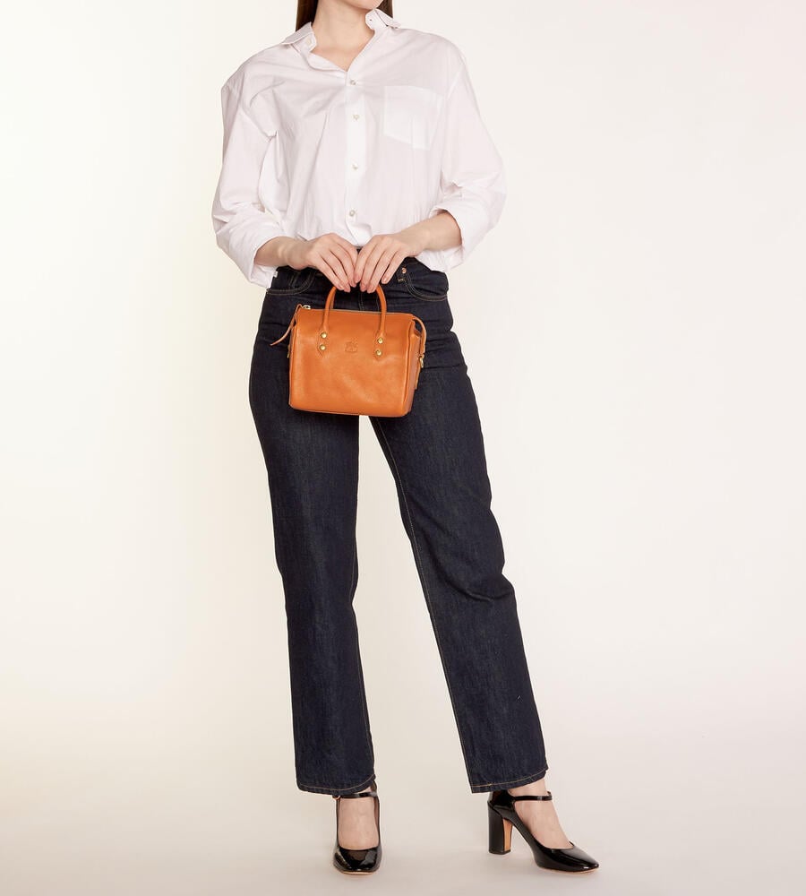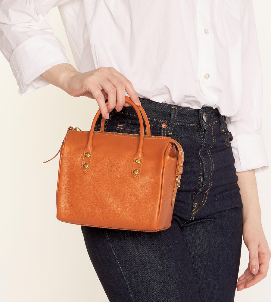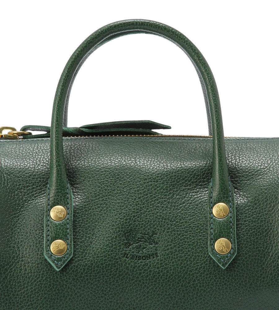 アイコンのバイソンが刻印されたスタッズがアクセントになったミニボストンバッグ。大きく開くファスナーは中身が見渡しやすく、たっぷり収納できるマチつきフォルムはデイリーに大活躍。