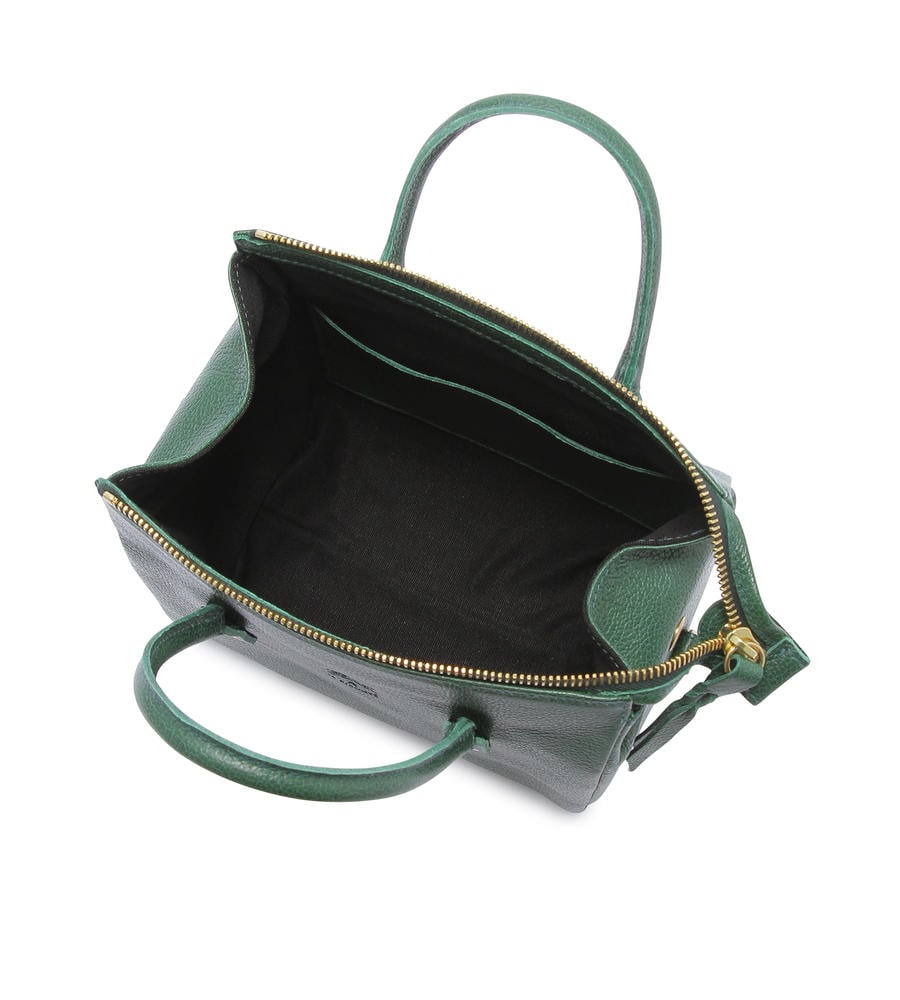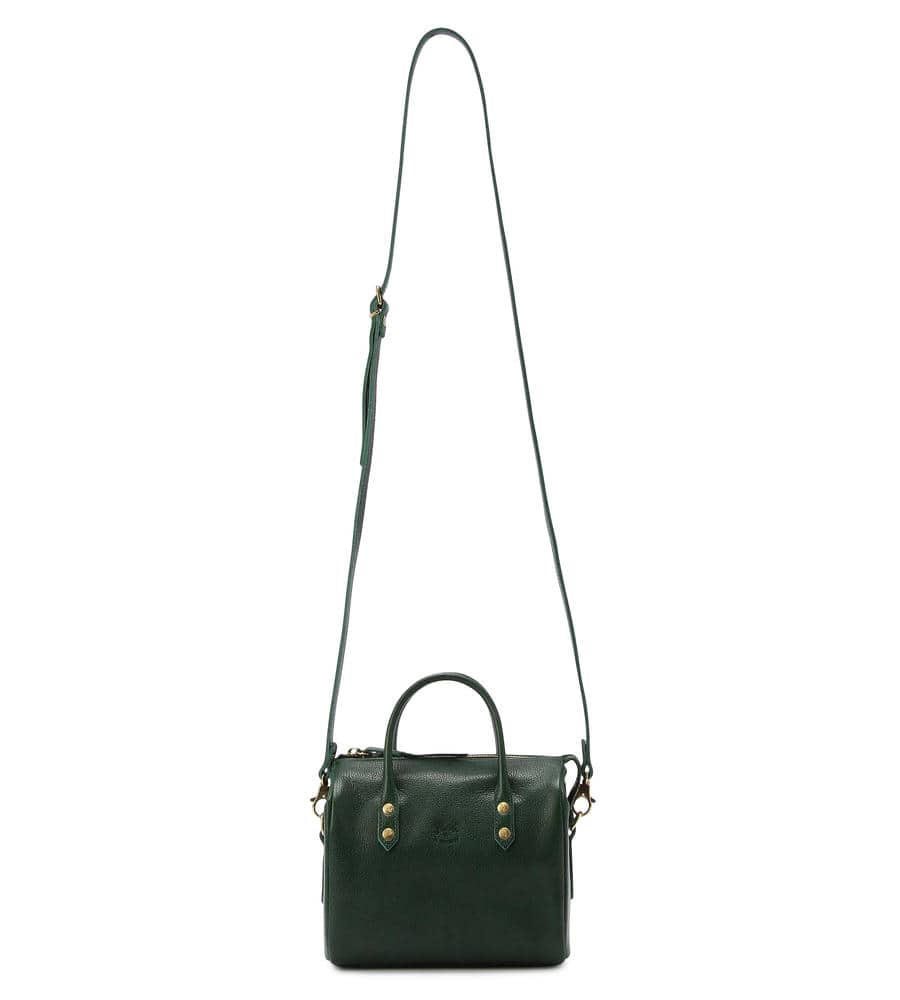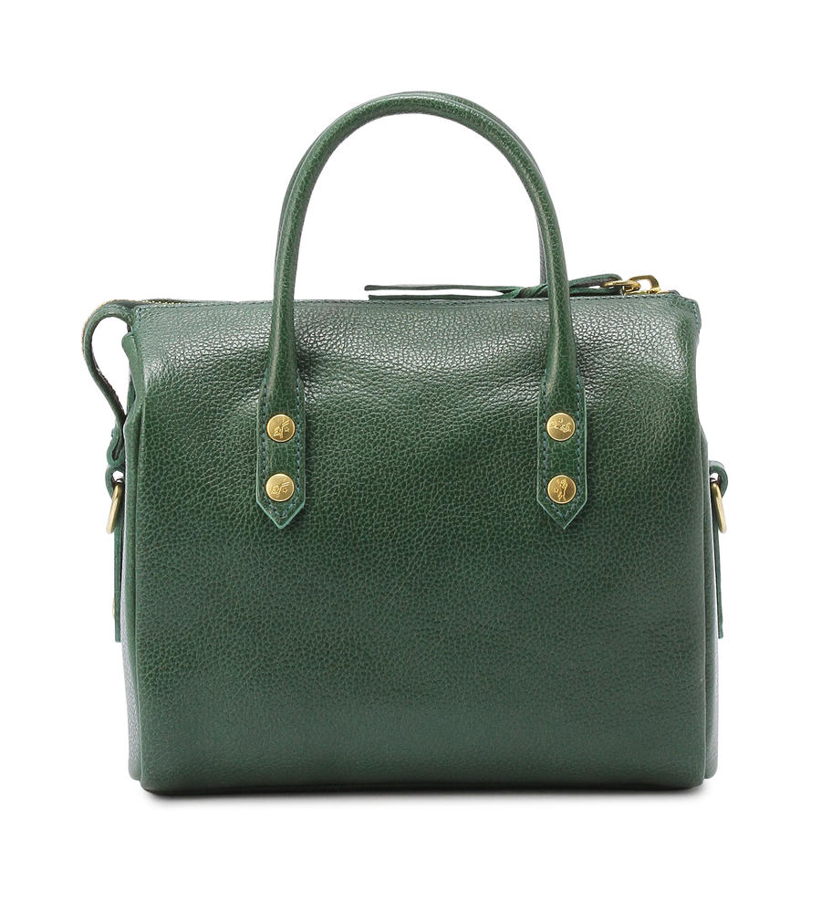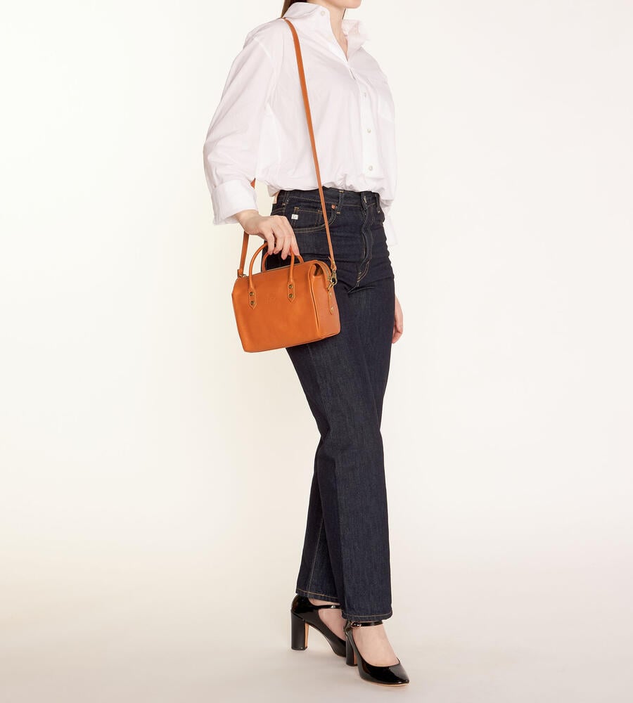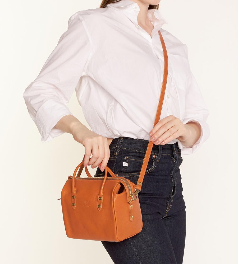 アイコンのバイソンが刻印されたスタッズがアクセントになったミニボストンバッグ。大きく開くファスナーは中身が見渡しやすく、たっぷり収納できるマチつきフォルムはデイリーに大活躍。