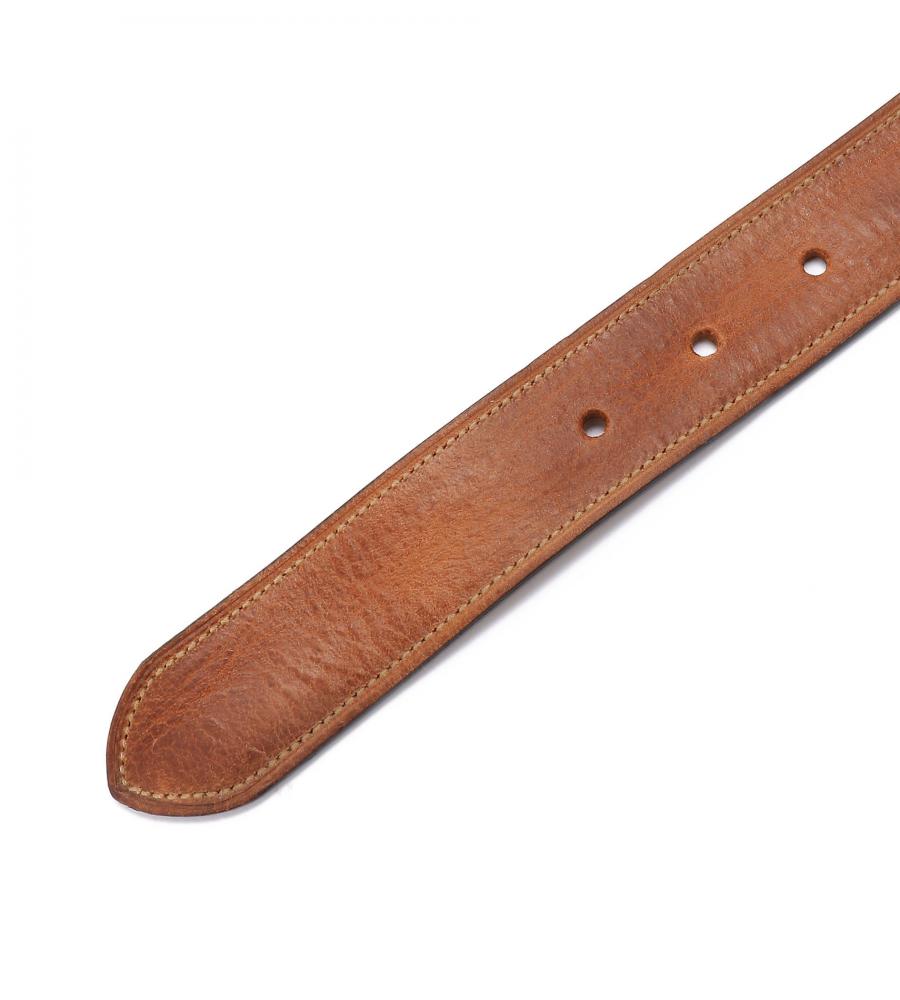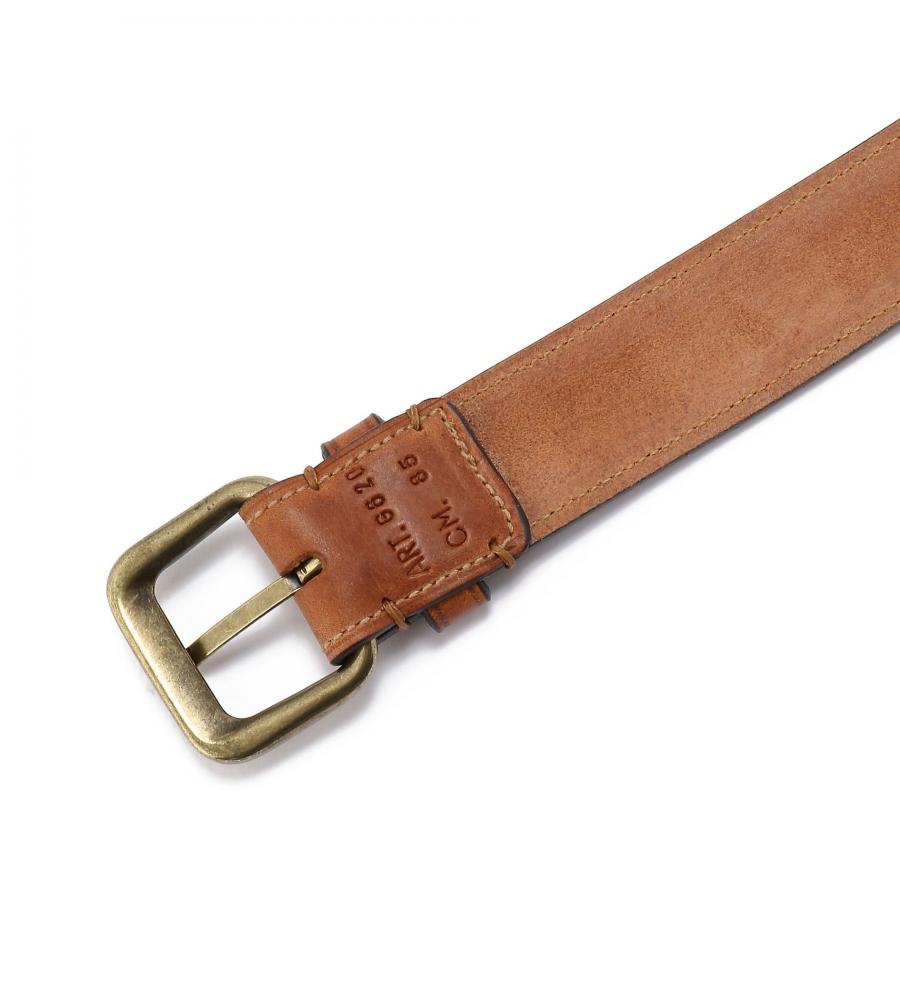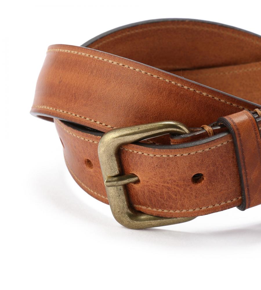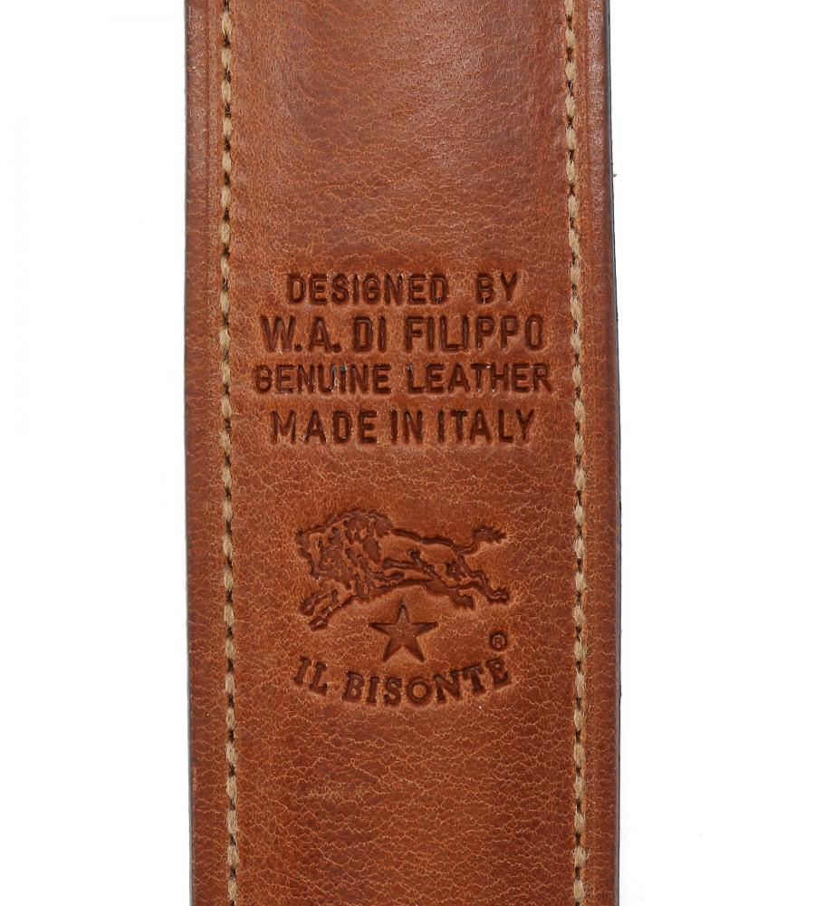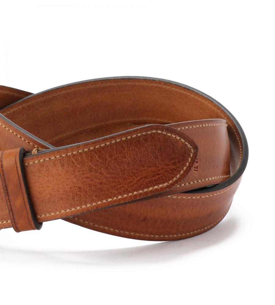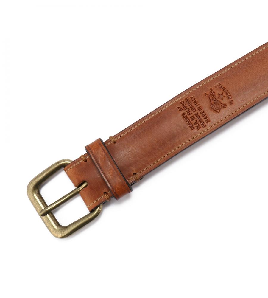 牛革レザーを用いたベルト。濃淡のある味わい深いカラー。ブロンズのスクエアバックルを組み合わせています。外側に、バイソンロゴの刻印入り。