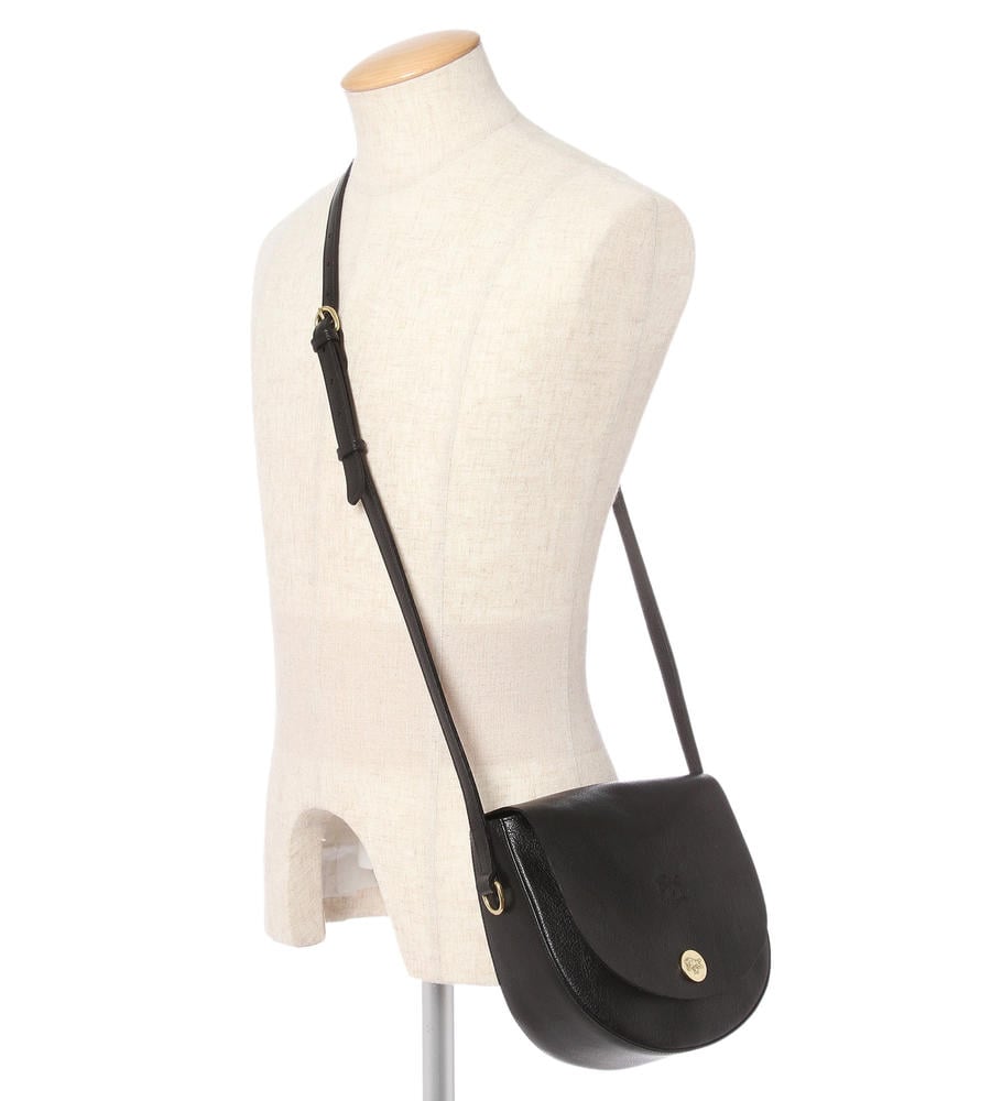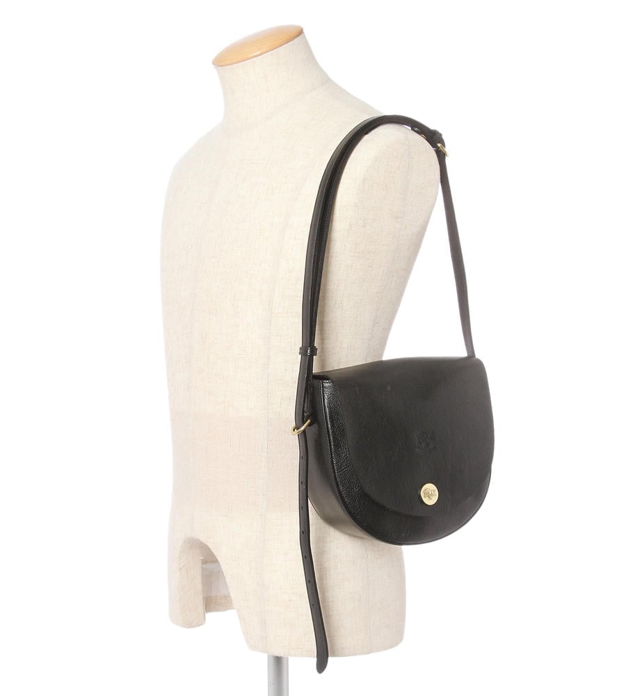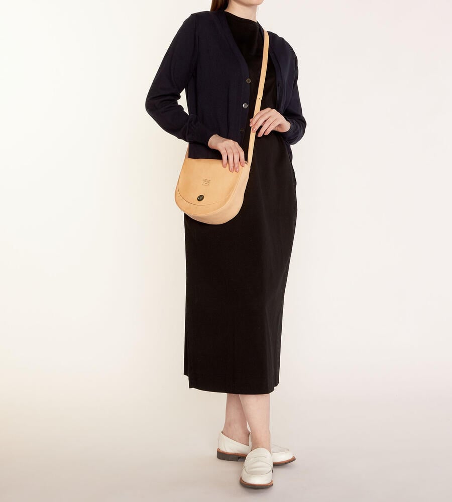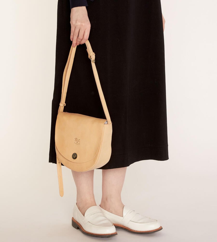 楕円を描くフォルムがレトロなムードを漂わせるバッグです。フラップにはバイソンロゴを刻み大きめのスナップ金具がアクセントになっています。小ぶりながらもマチがある為、見た目以上の収納を発揮。ショルダーベルトは調整が可能なので持ち方のアレンジも自在です。