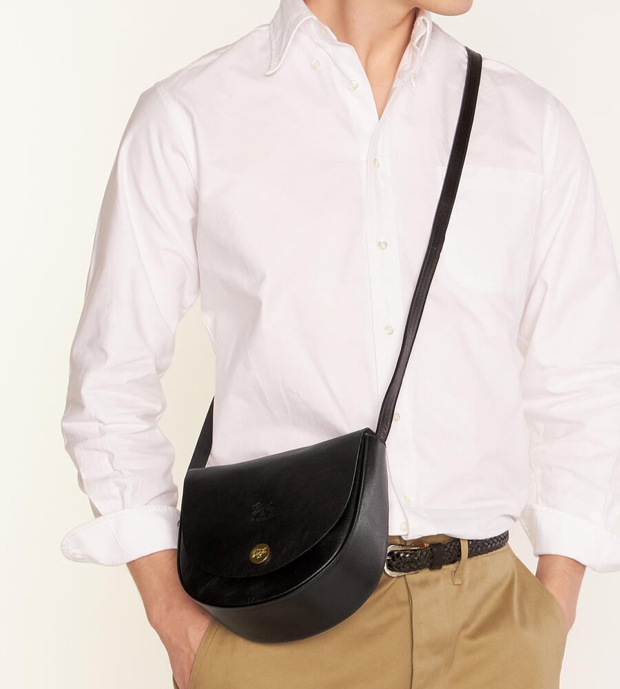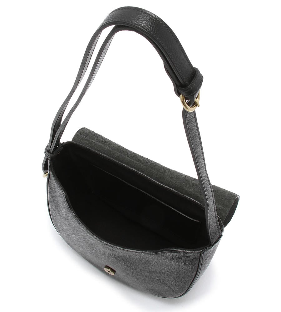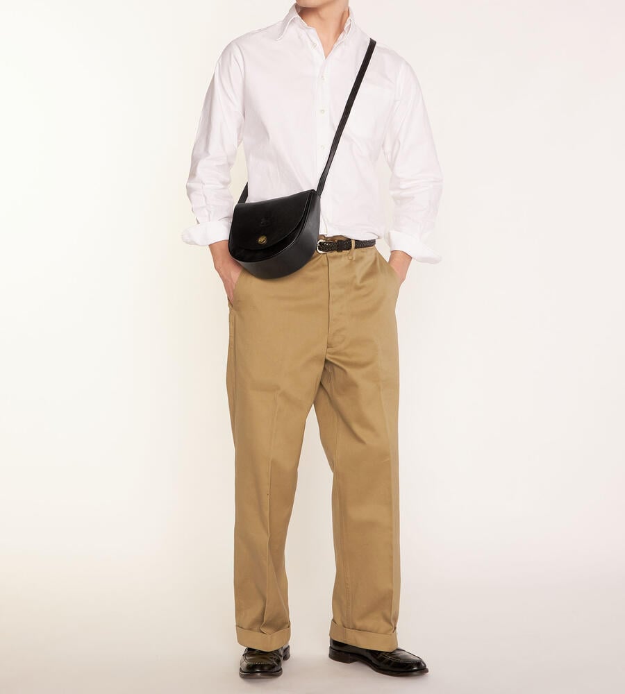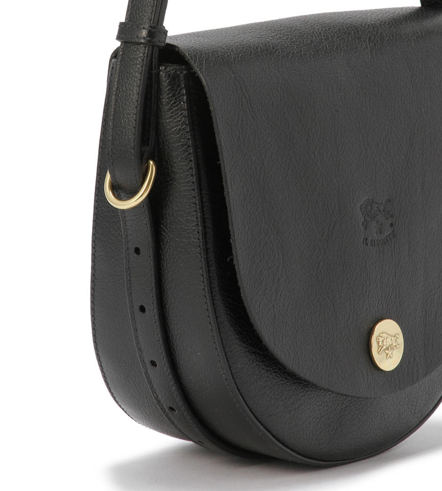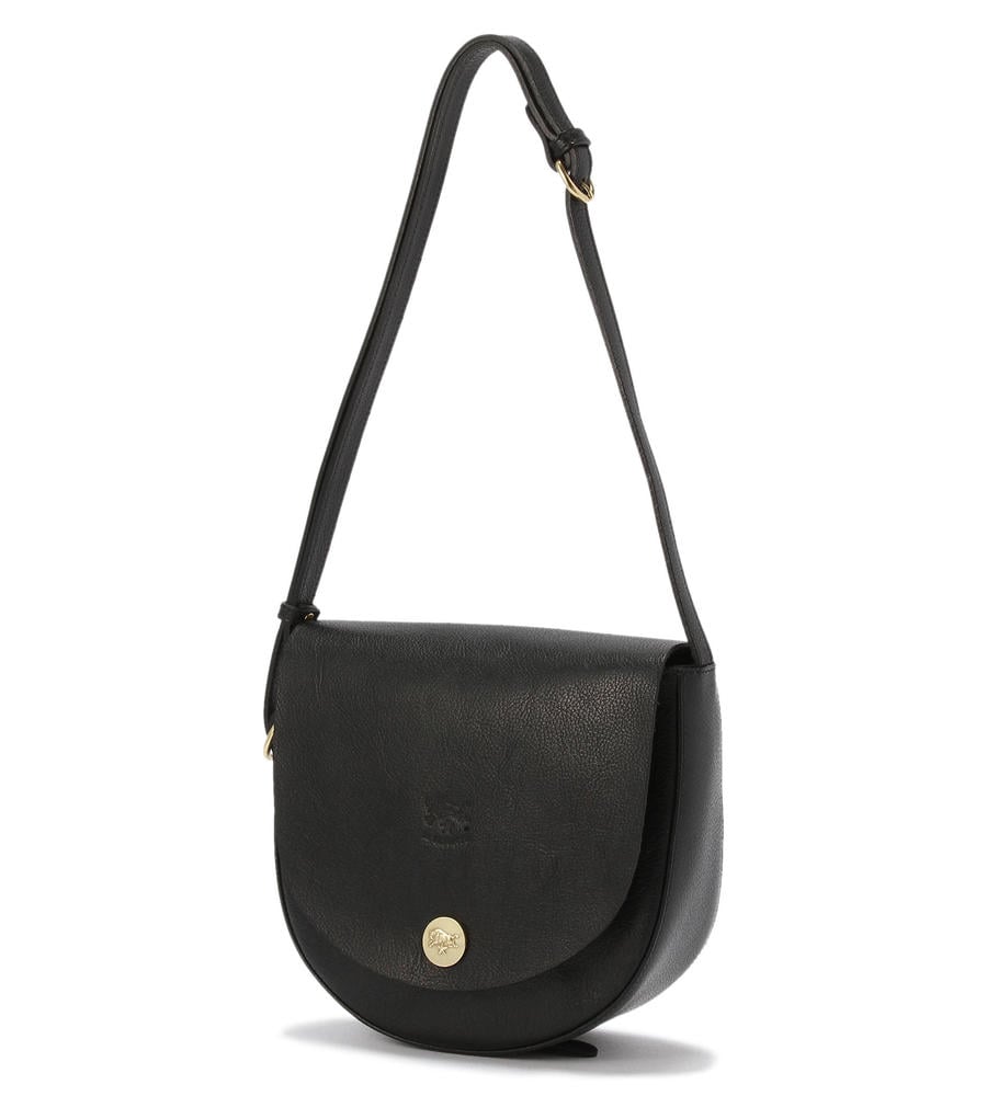 楕円を描くフォルムがレトロなムードを漂わせるバッグです。フラップにはバイソンロゴを刻み大きめのスナップ金具がアクセントになっています。小ぶりながらもマチがある為、見た目以上の収納を発揮。ショルダーベルトは調整が可能なので持ち方のアレンジも自在です。