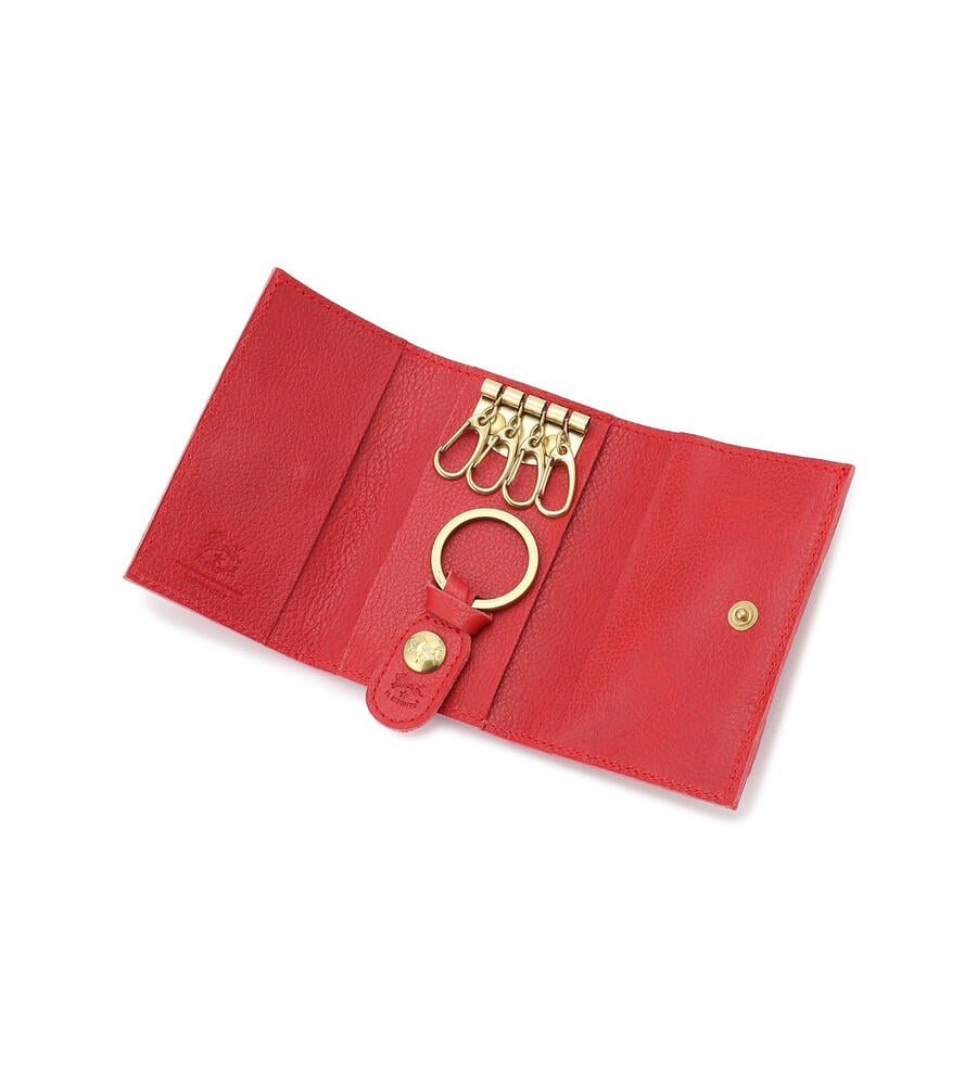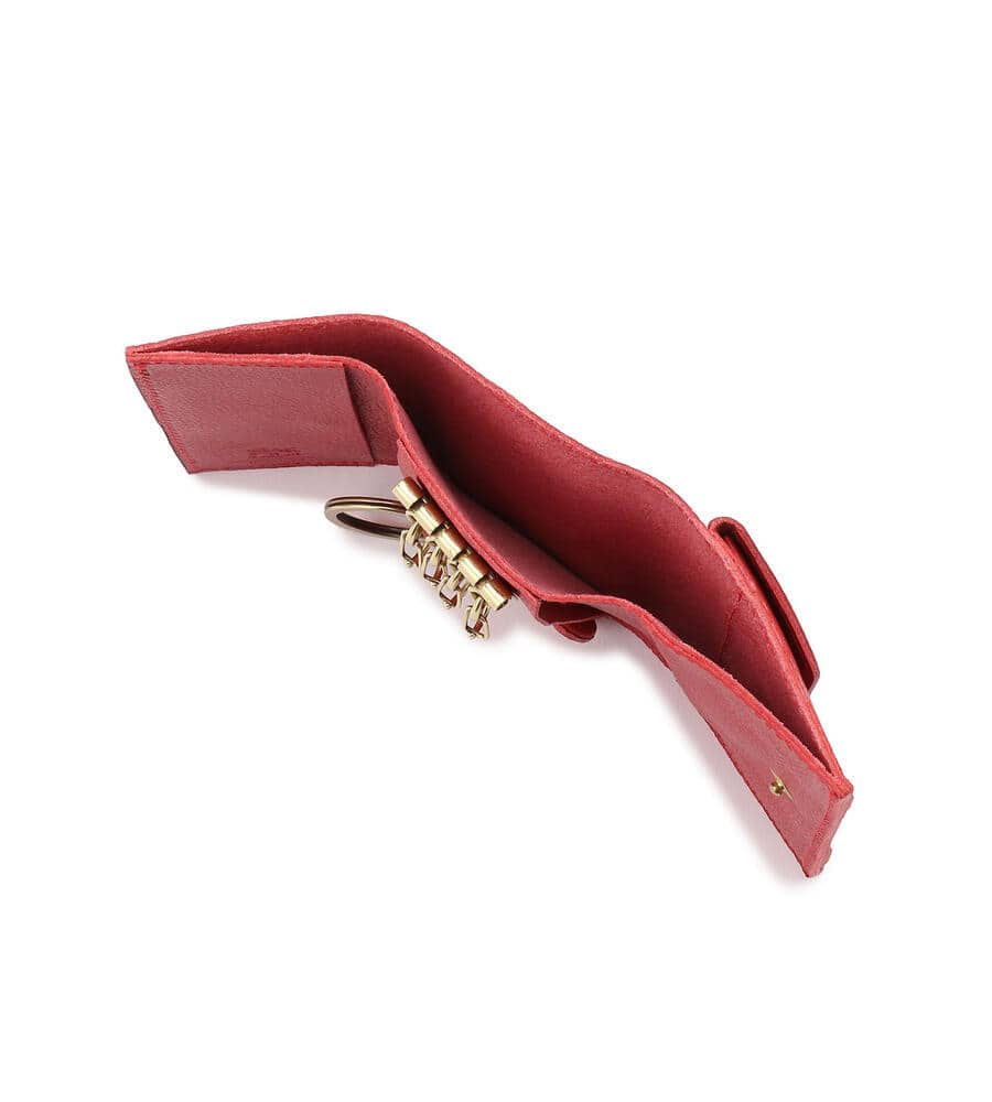 カラーバリエーション豊富に展開したレザーキーケース。内側にはキーフックを4つ、取り外し可能なキーリングを備えています。加えて札入れ、フラップタイプのコインポケット付き。1つにすべてを収めることができる実用的なアイテムです。