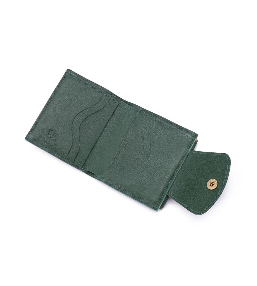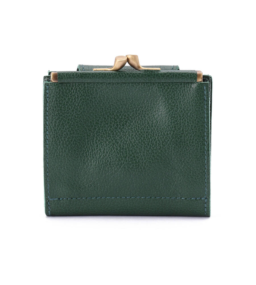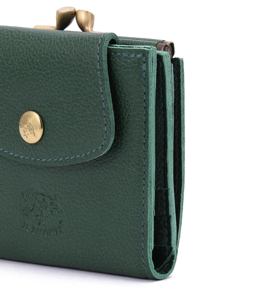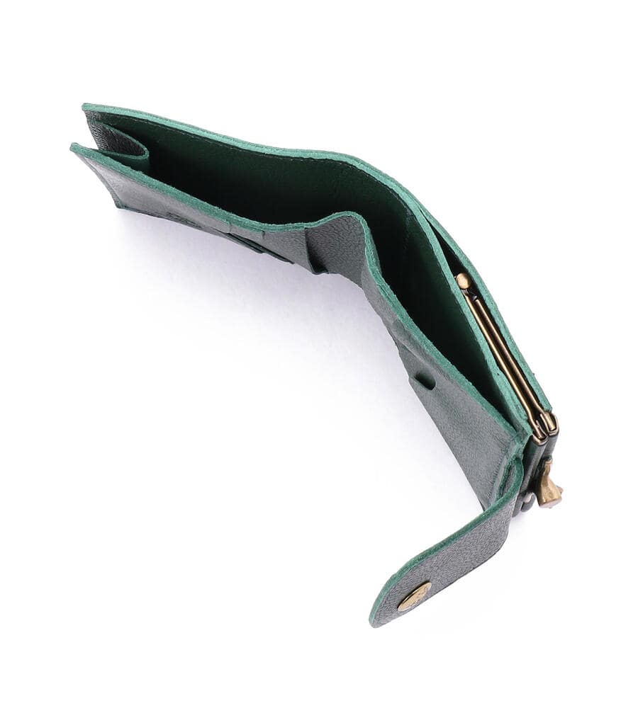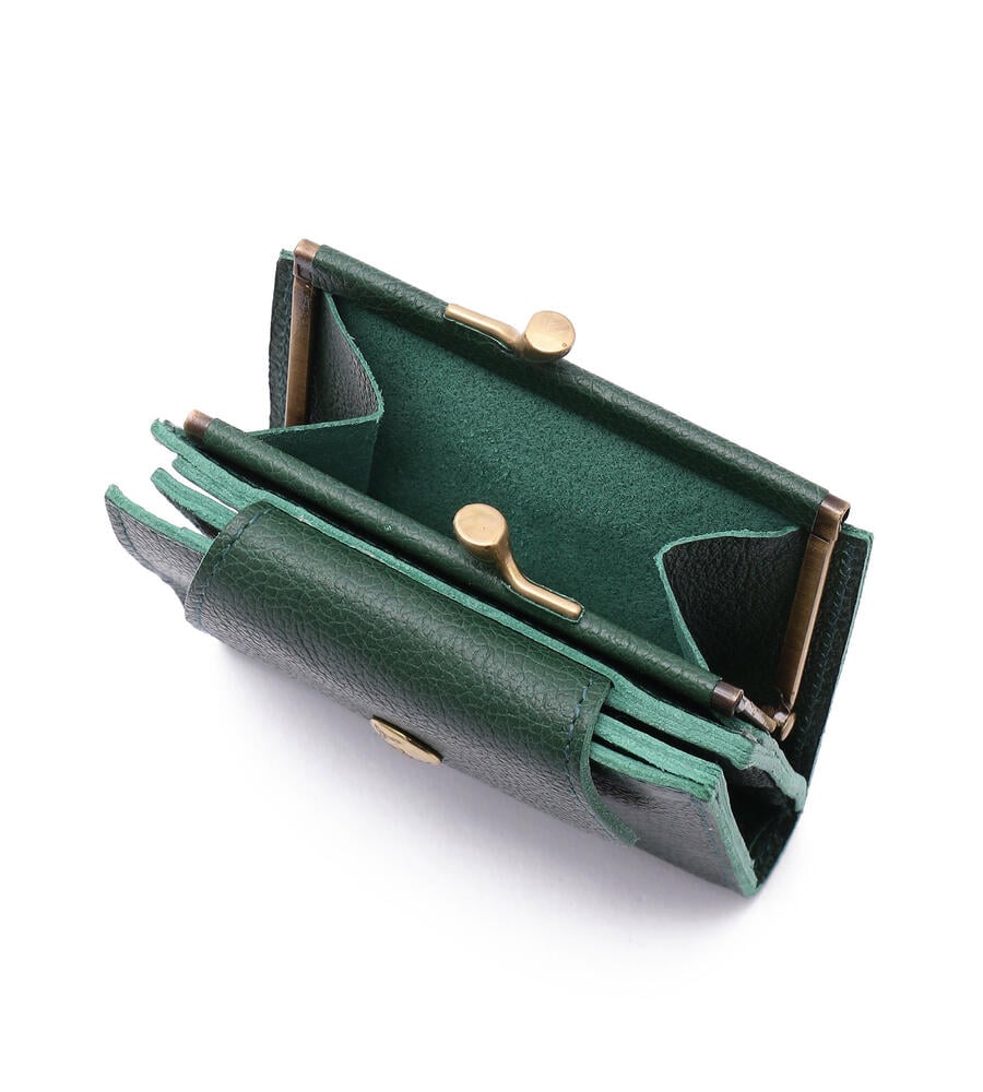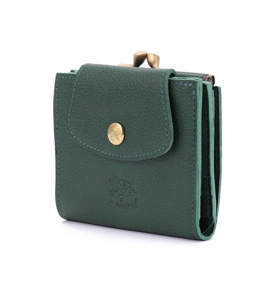 コンパクトな2つ折りタイプのレザーウォレットです。紙幣やカードを入れるスリットに加え、がま口タイプのコインポケットを備えています。バイソンロゴがアクセントのベーシックなデザインで、ギフトにも最適です。