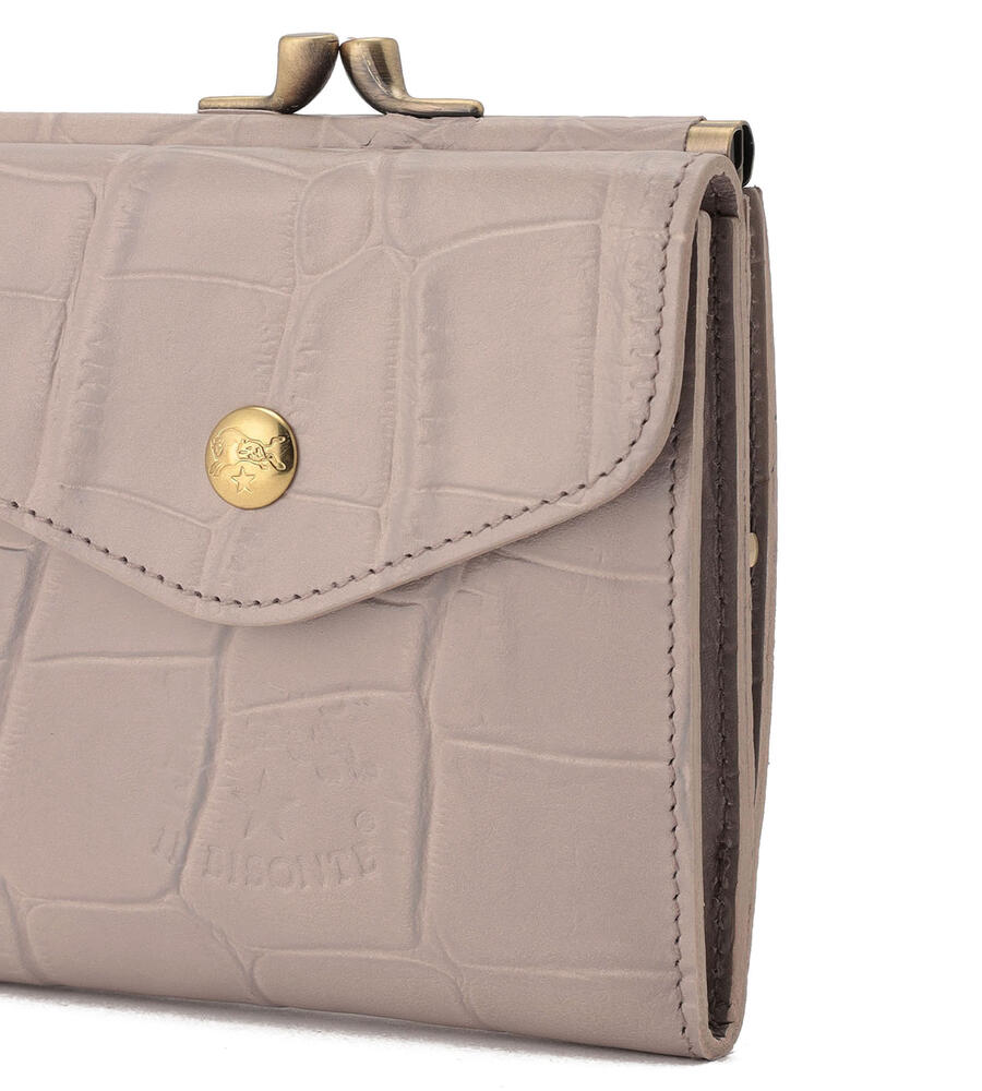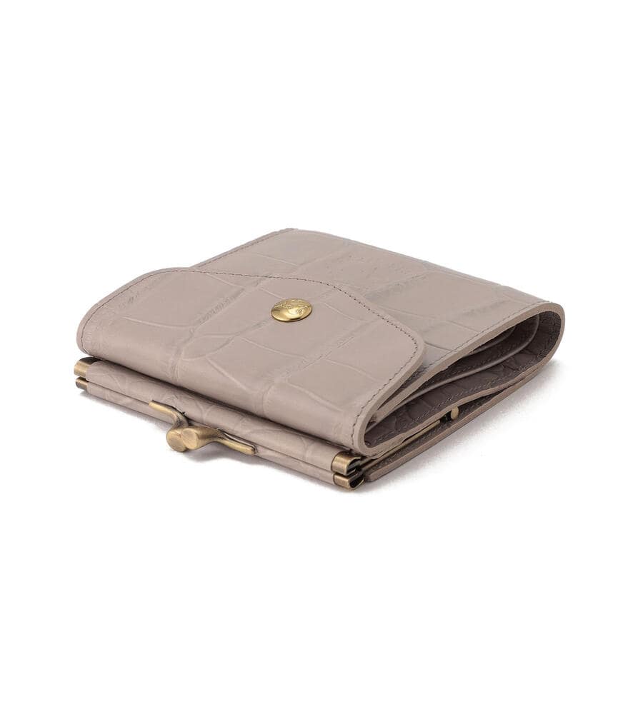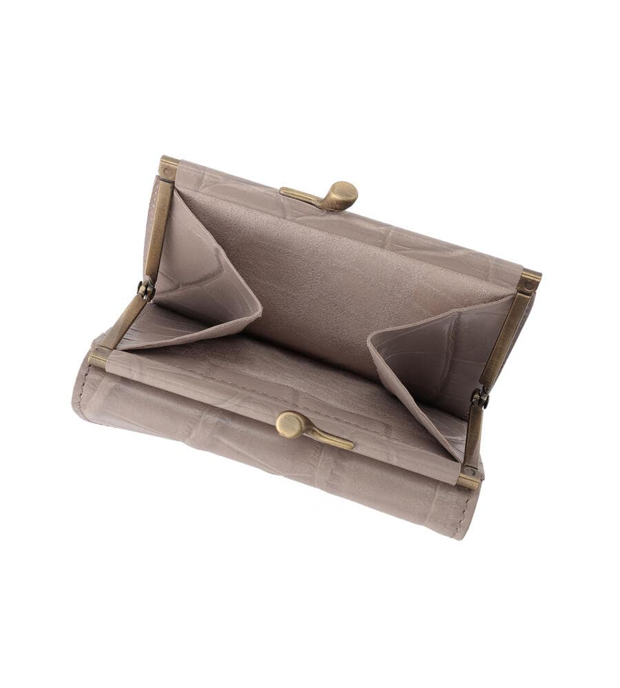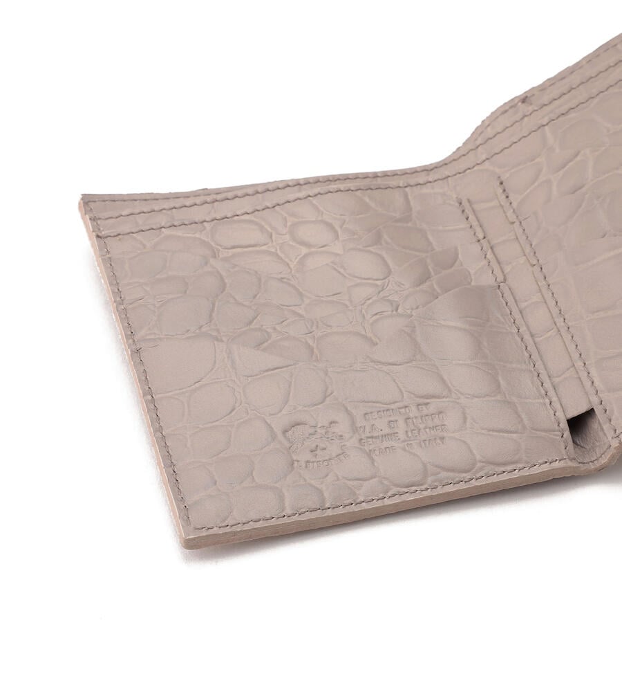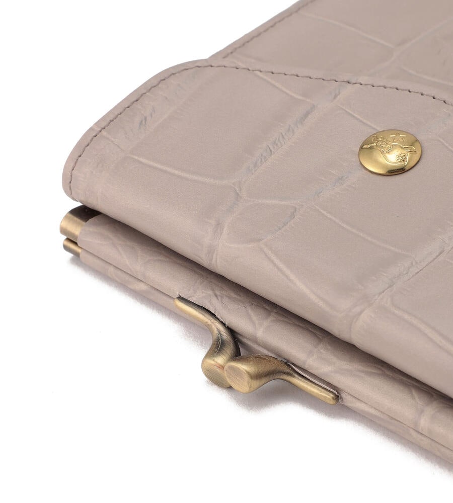 高級感漂うクロコダイルの型押しがほどこされたウォレット。キラリと光るゴールドボタンとバイソンロゴの型押しがワンポイントに。がま口デザインのコインケースは間口が大きく開くため使い勝手も良くおすすめ。内側にはカードホルダーと札入れを備えています。
