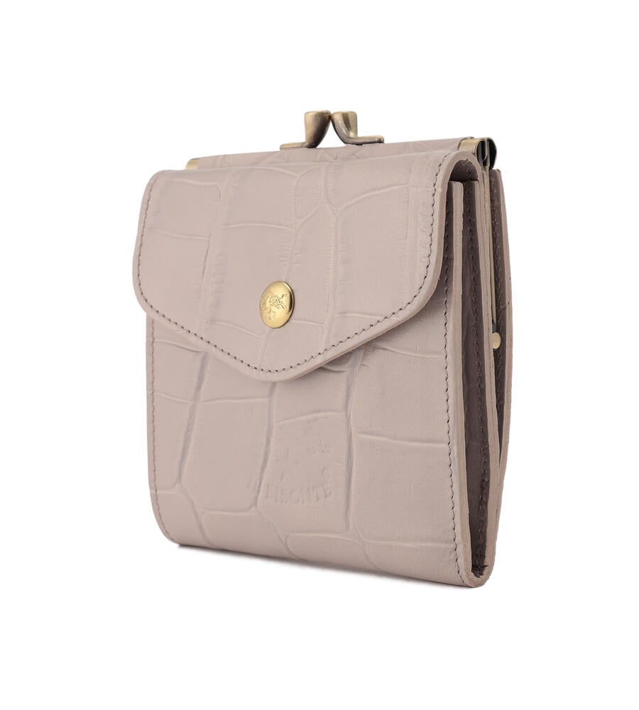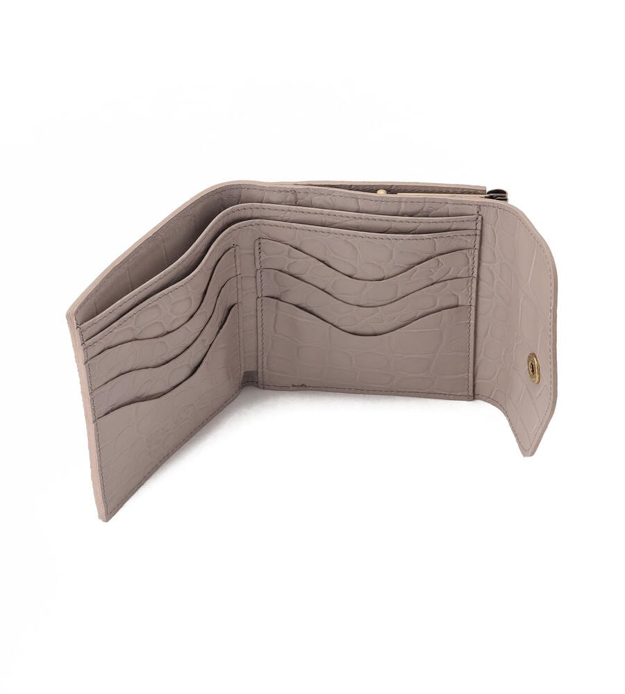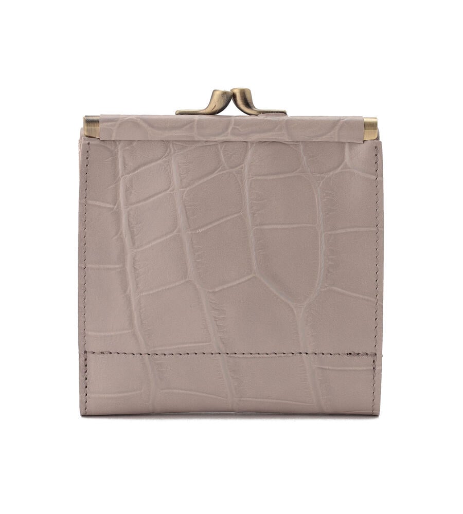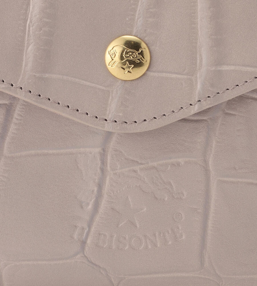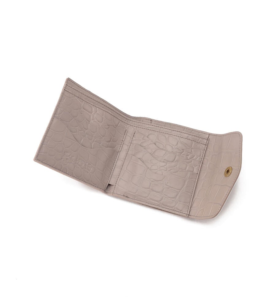 高級感漂うクロコダイルの型押しがほどこされたウォレット。キラリと光るゴールドボタンとバイソンロゴの型押しがワンポイントに。がま口デザインのコインケースは間口が大きく開くため使い勝手も良くおすすめ。内側にはカードホルダーと札入れを備えています。