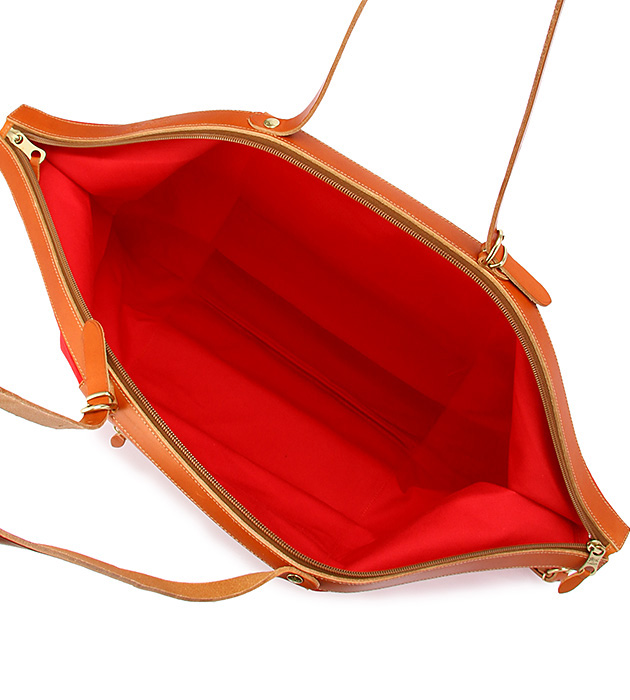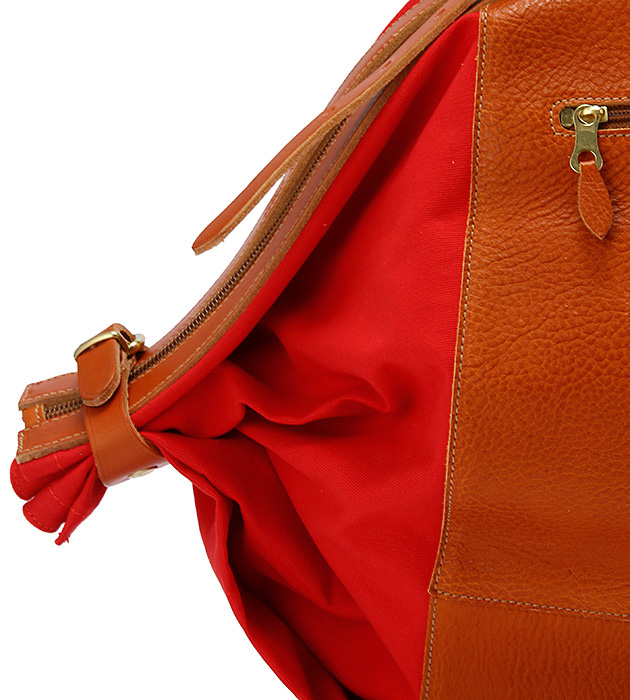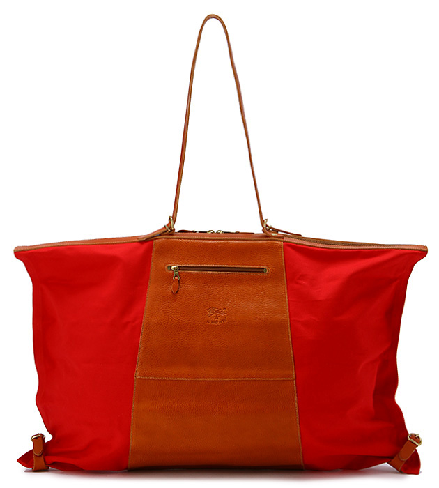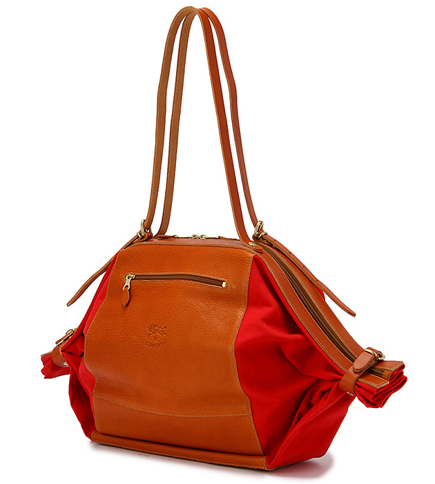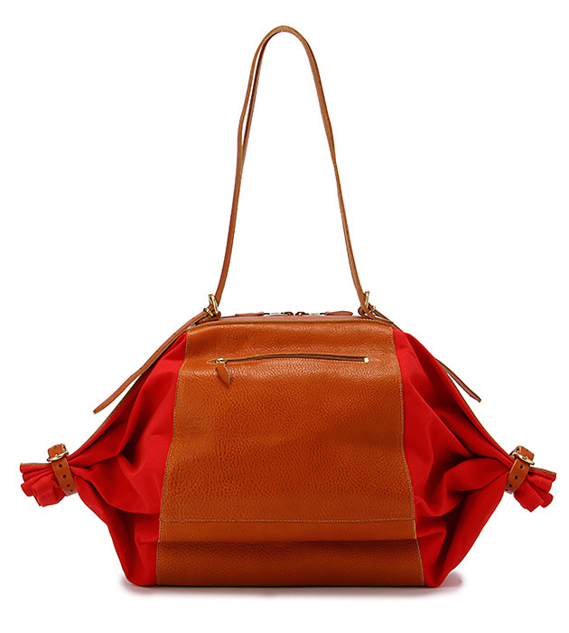 両サイドをレザーベルトで固定することで、キャンディのようなかわいい形になるショルダーバッグ。サイドのベルトを外すと、大容量バッグに変身します。キャンバス素材で軽く、旅行バッグとしても使いやすいアイテムです。