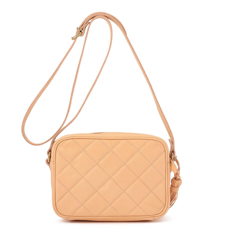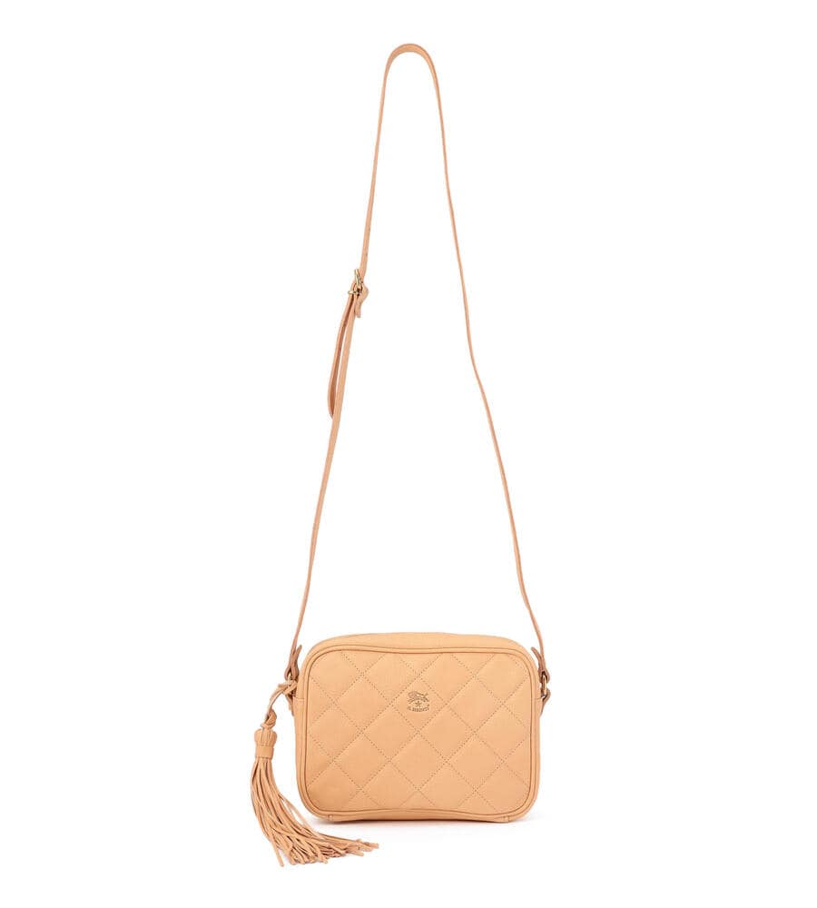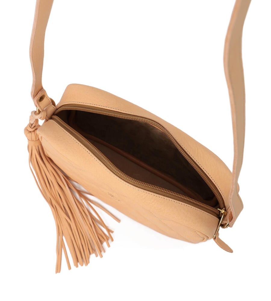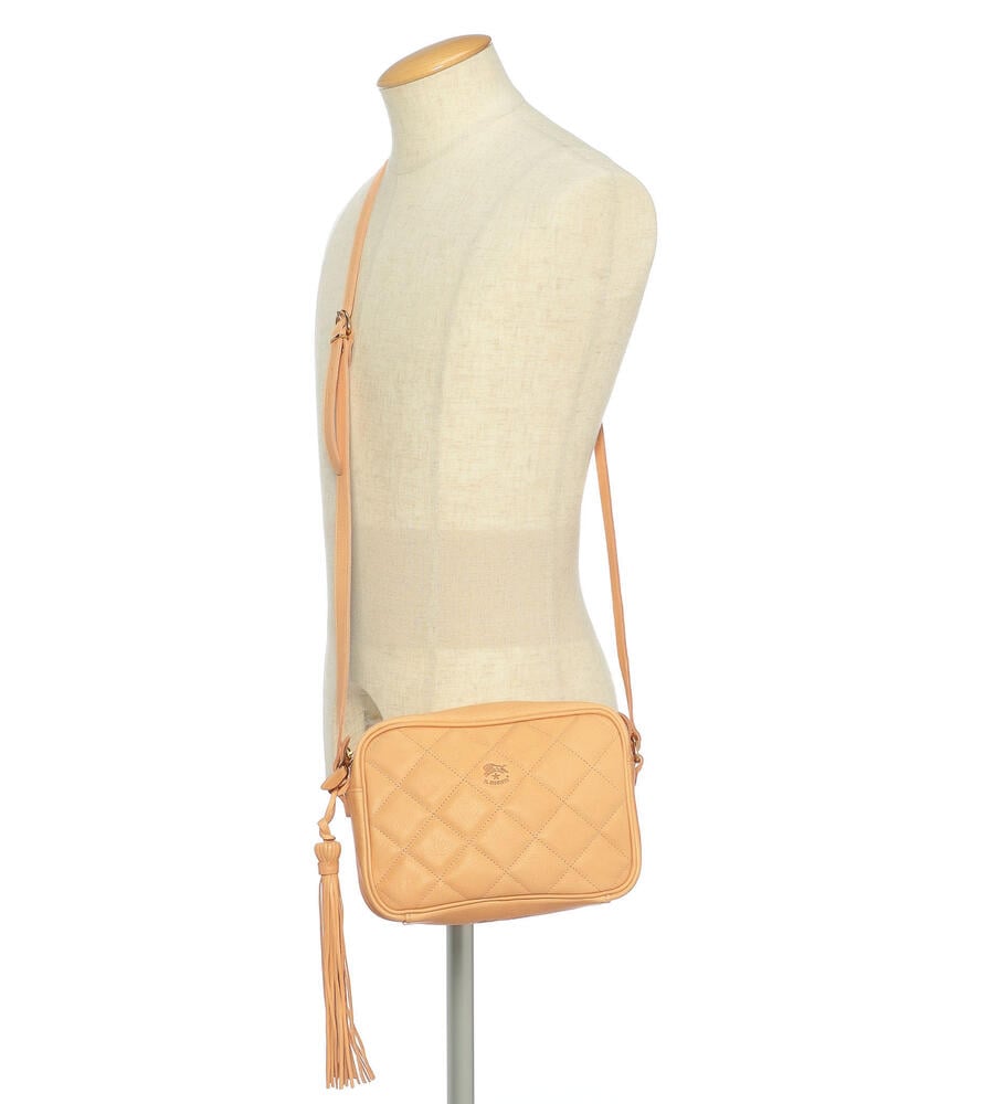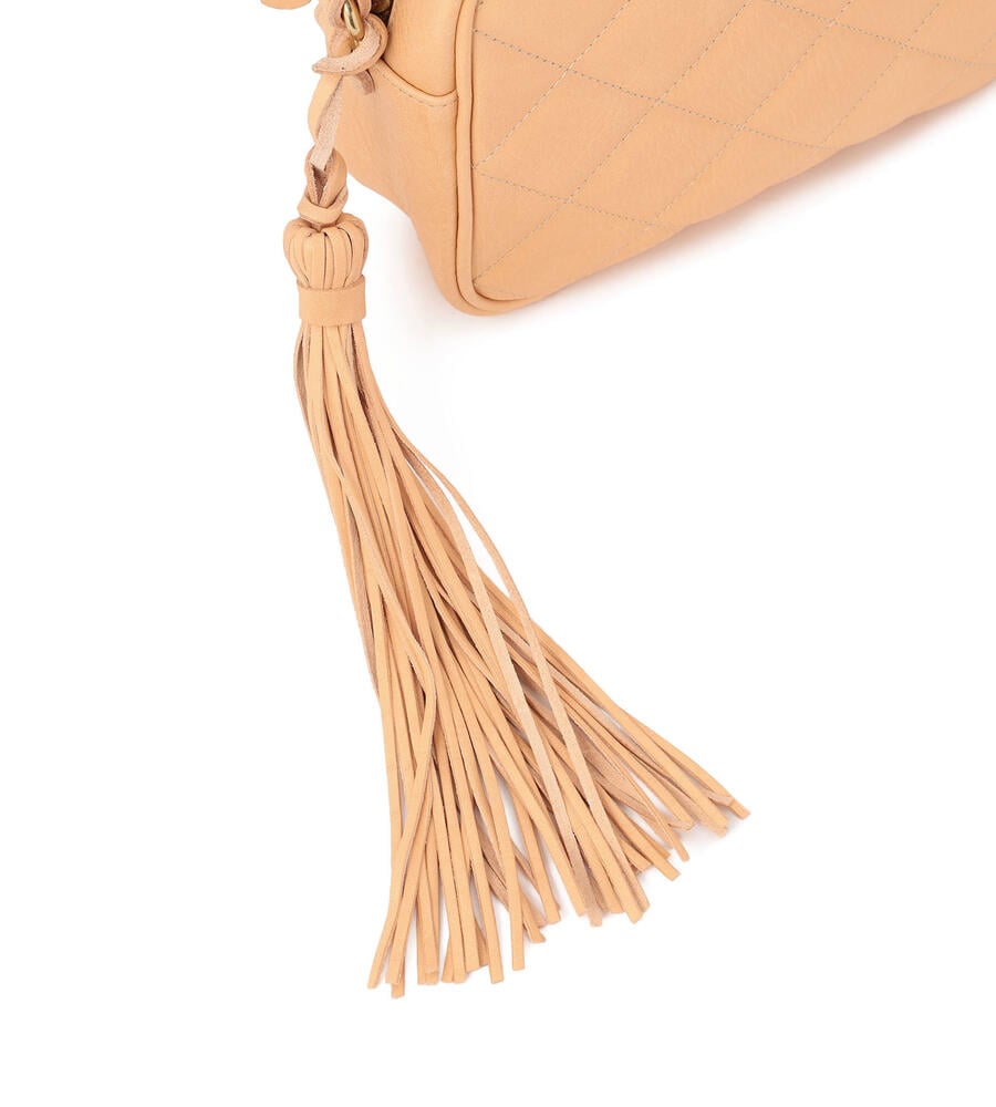 キルティング仕立てのレザーショルダーバッグ。大ぶりのタッセルチャームがアクセントで付いています。ショルダーストラップは長さの調節が可能。マチがあり、コンパクトでも収納力があります。