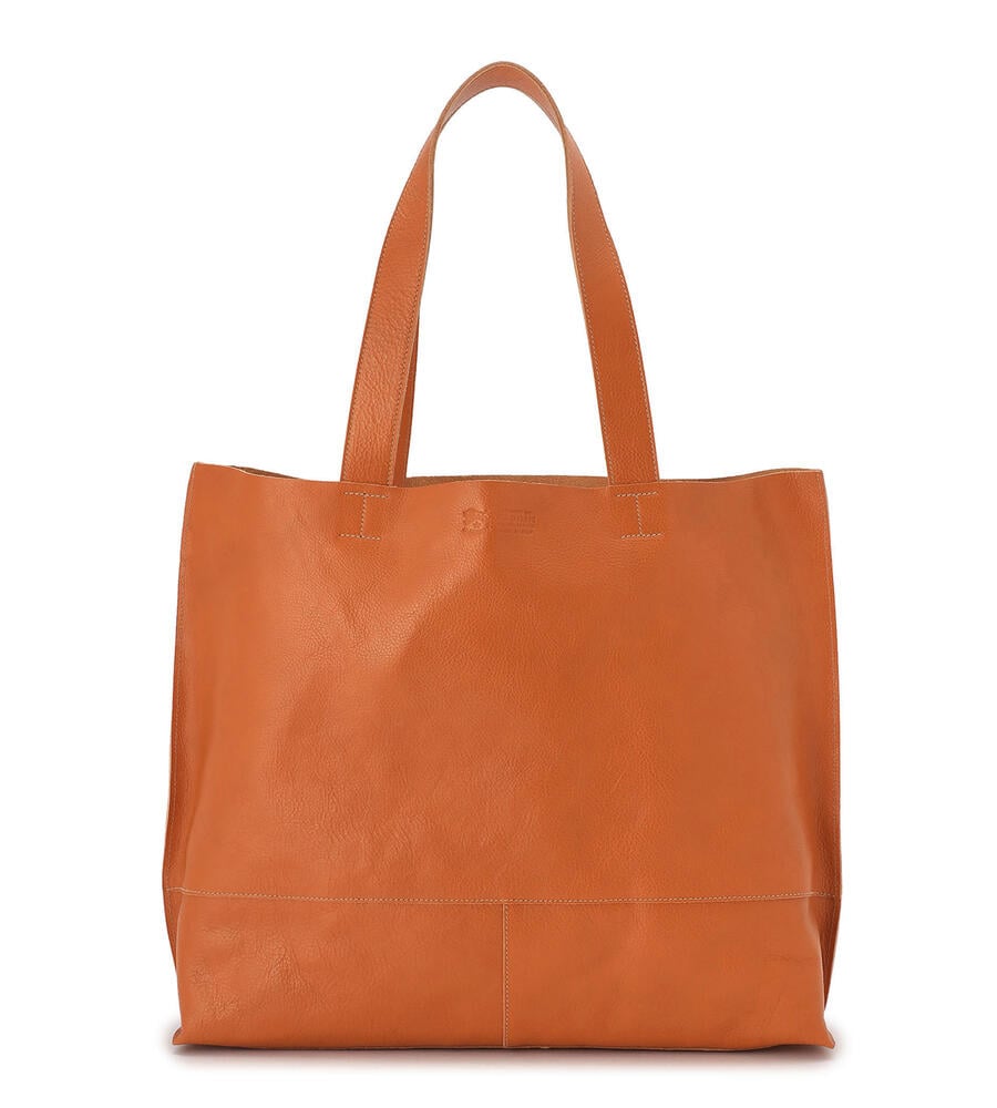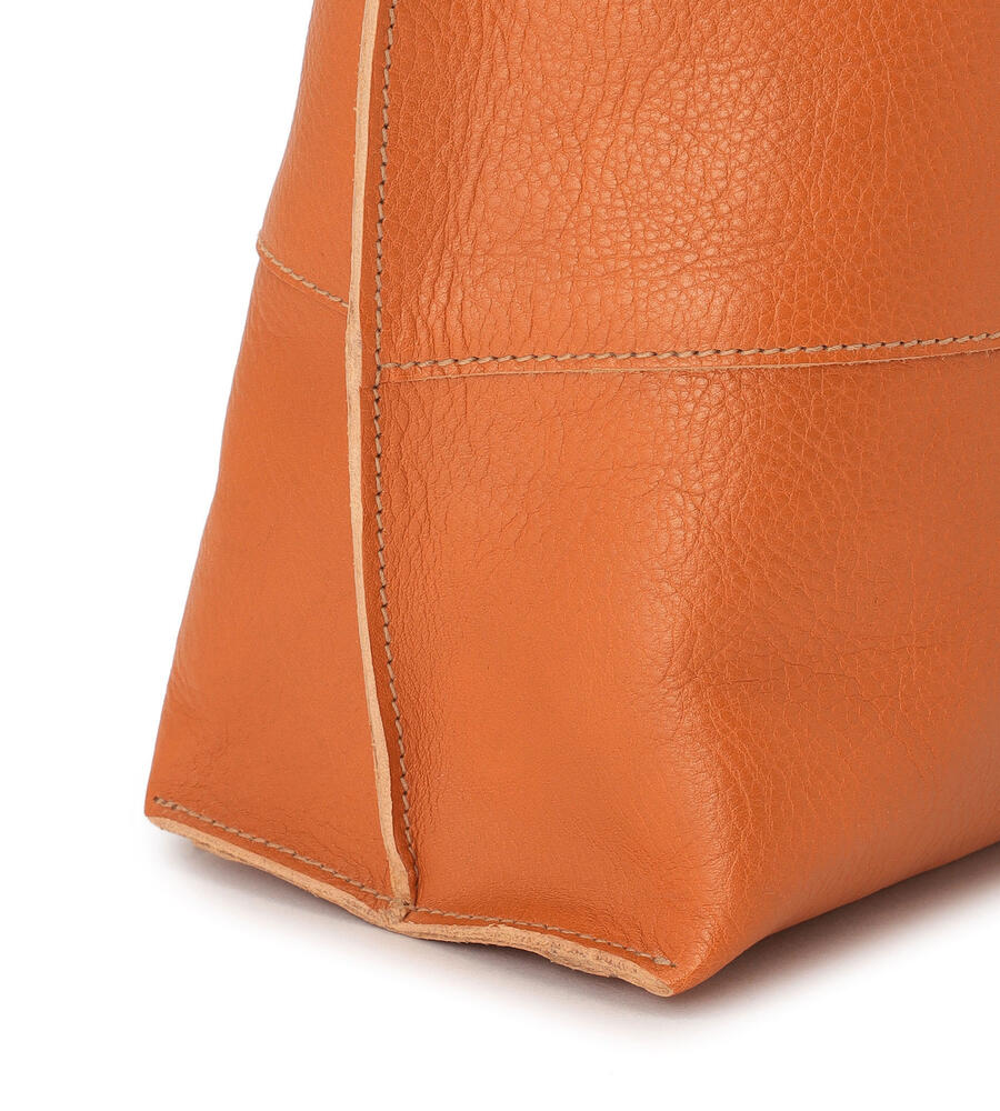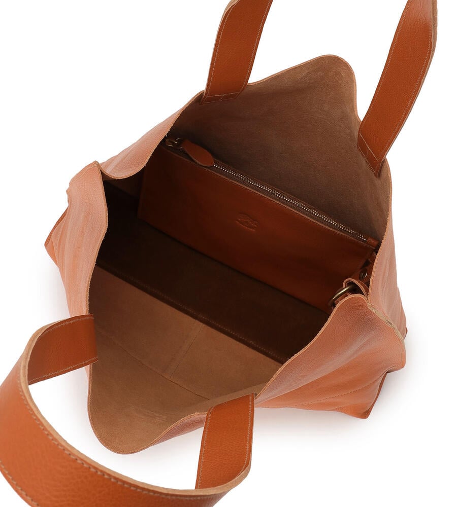 しなやかなレザーの質感が美しい、ボトムの切り替えデザインがポイントになったハンドバッグです。スナップボタンでハンドル部分に着脱ができるポーチが付属。小物類をまとめておけるため、バッグの中もすっきり。