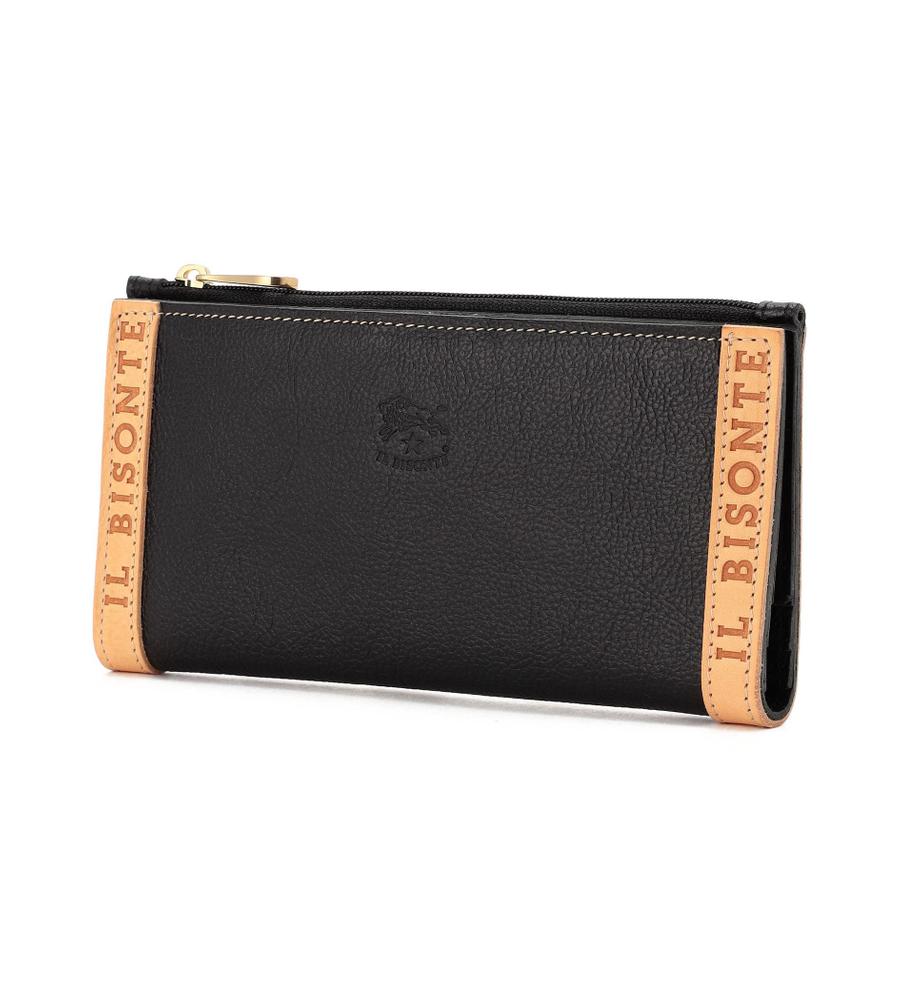 心地良く手に馴染むレザーの長財布。ジップ開閉でさっと小銭などを出し入れできるのがうれしい。サイドにはロゴのパイピングを、モダンなアクセントに加えています。
