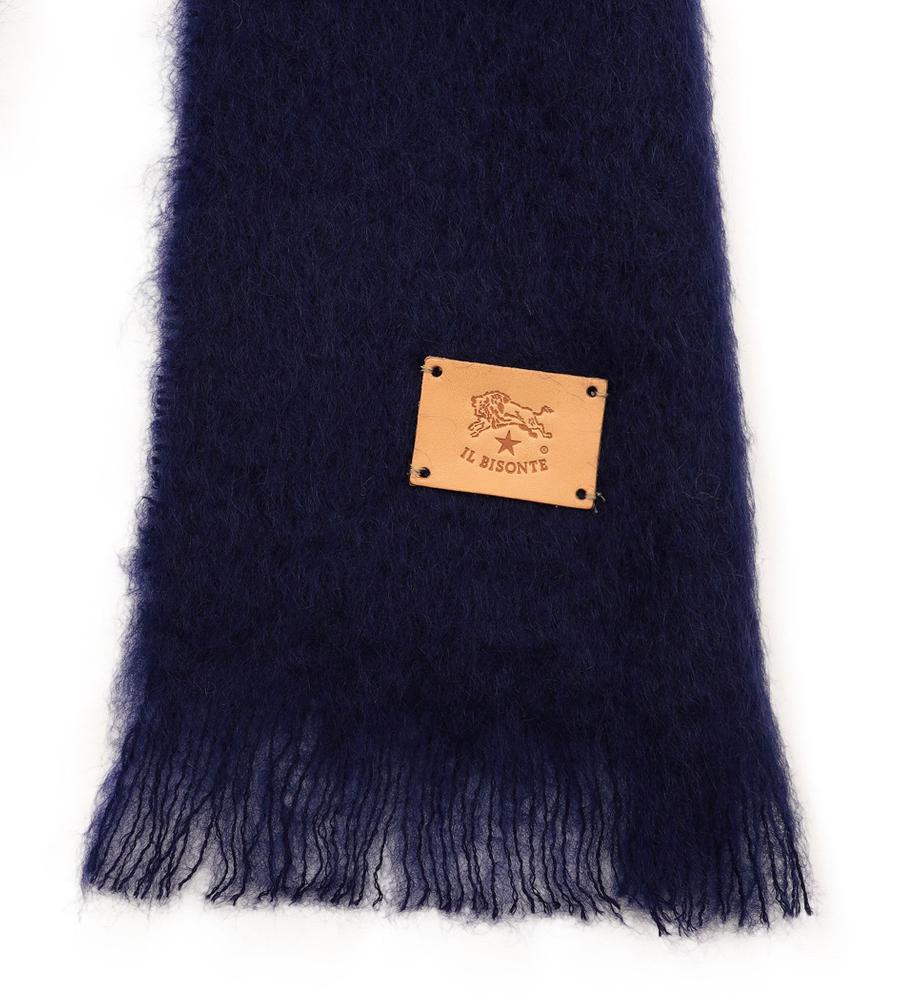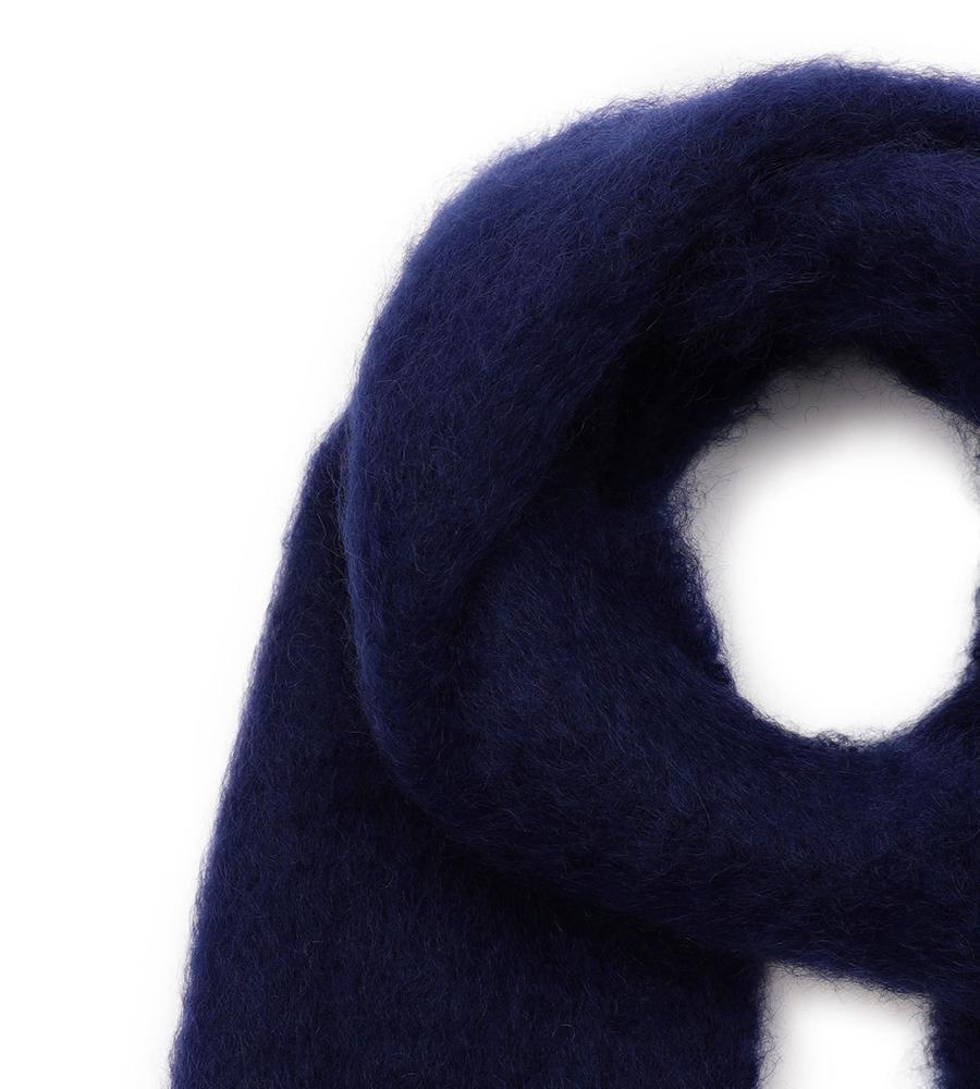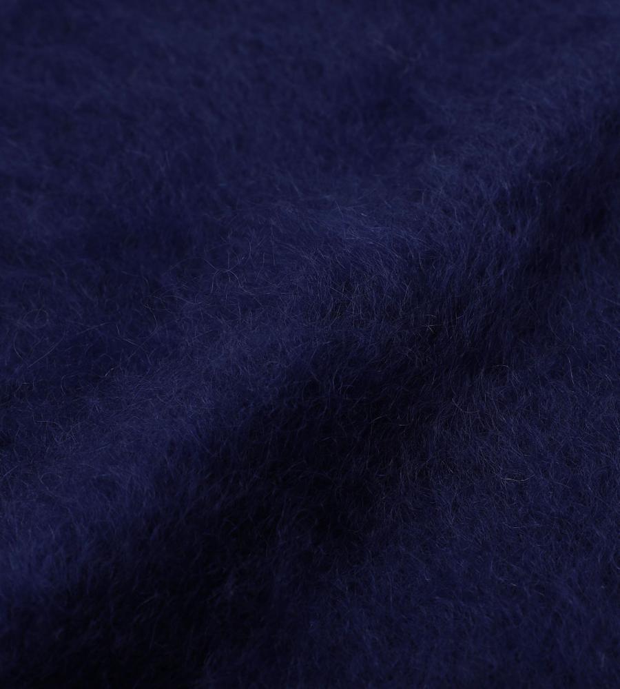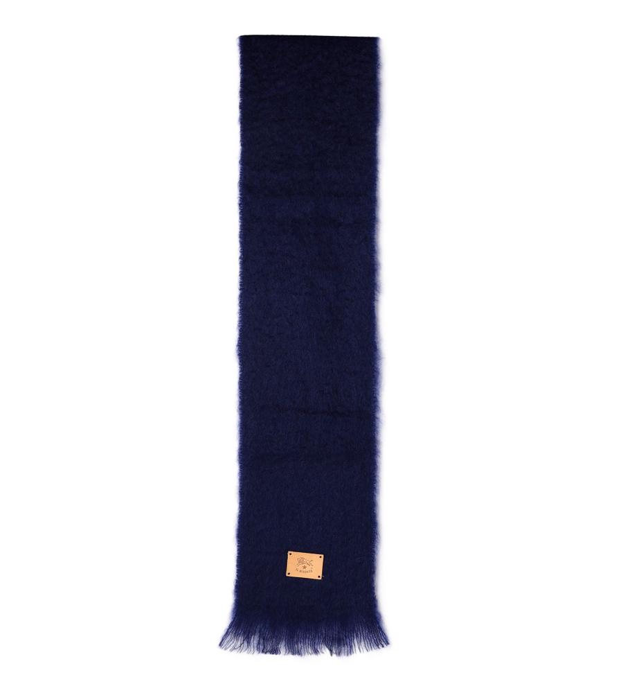 毛をベースにナイロンを織り交ぜた、ふんわりとした起毛感のある素材のストール。上質かつ暖かな風合いで、コーディネートの風格を高めるアイテムです。端に添えたレザーワッペンが、高級感を高めるアクセント。