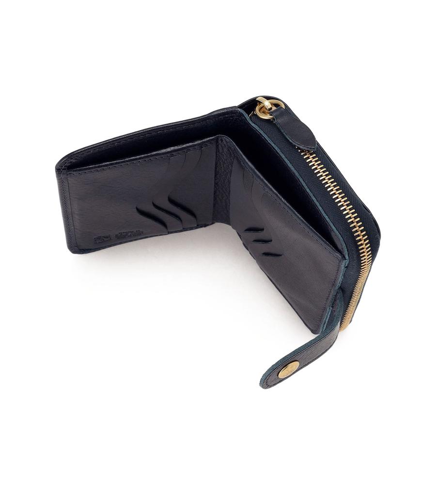 マットな光沢を持つ皮革素材の2つ折りウォレット。ラウンドジップとスナップボタンのタブで留めるつくりです。コインポケットが独立した、使い勝手の良いデザイン。コンパクトなサイズ感は、キャッシュレス派の方にもおすすめです。
