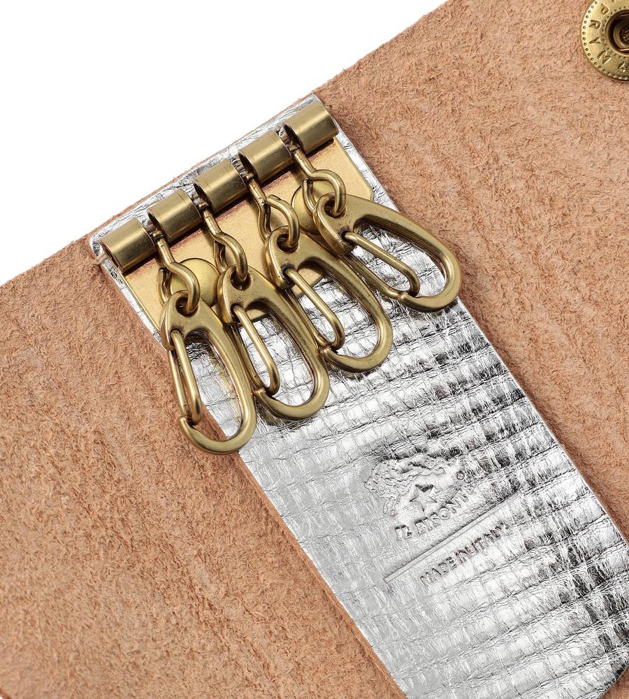 ゴールドの型押し入りスナップが目を引くキーケース。ハート入りのロゴの型押しも親しみやすさを感じさせるアクセント。4つのフックがついており、鍵をスマートにまとめられるのが特徴です。大切な方へのギフトとしてもおすすめです。