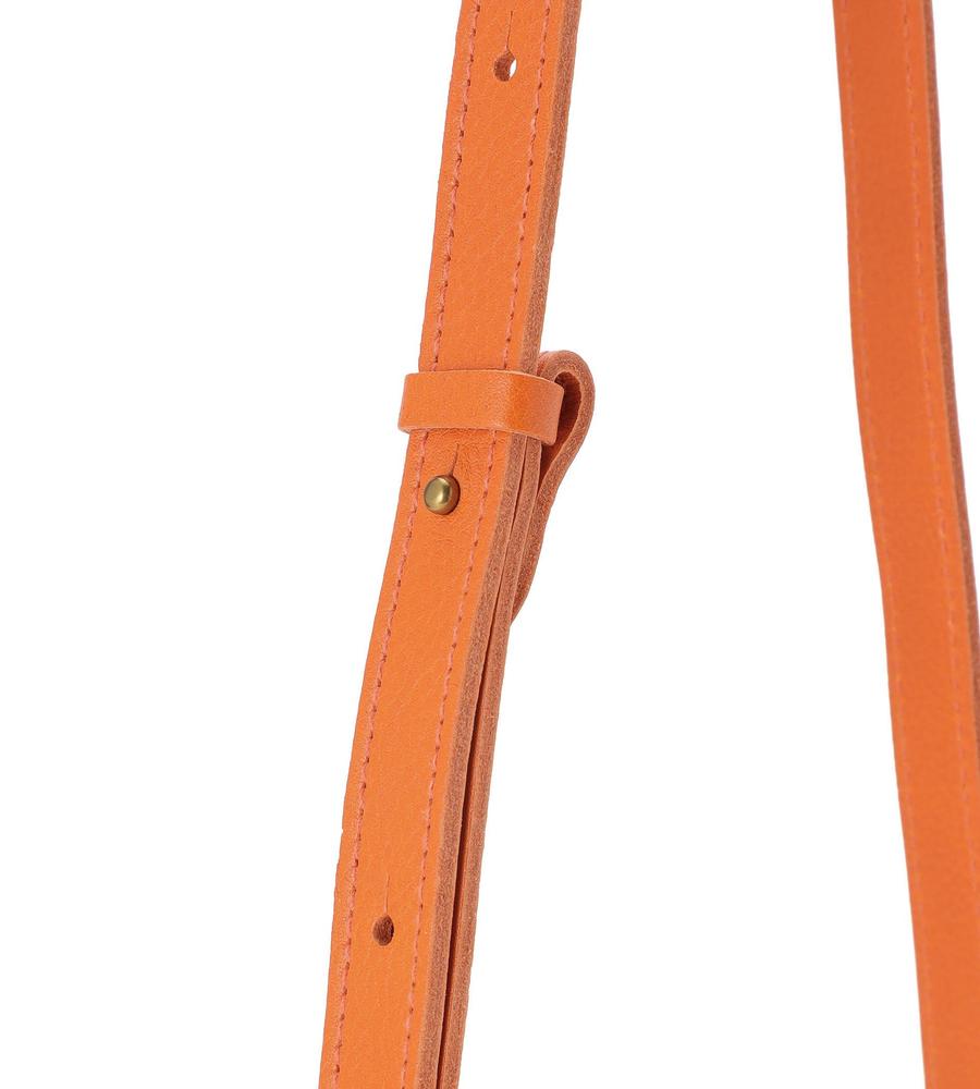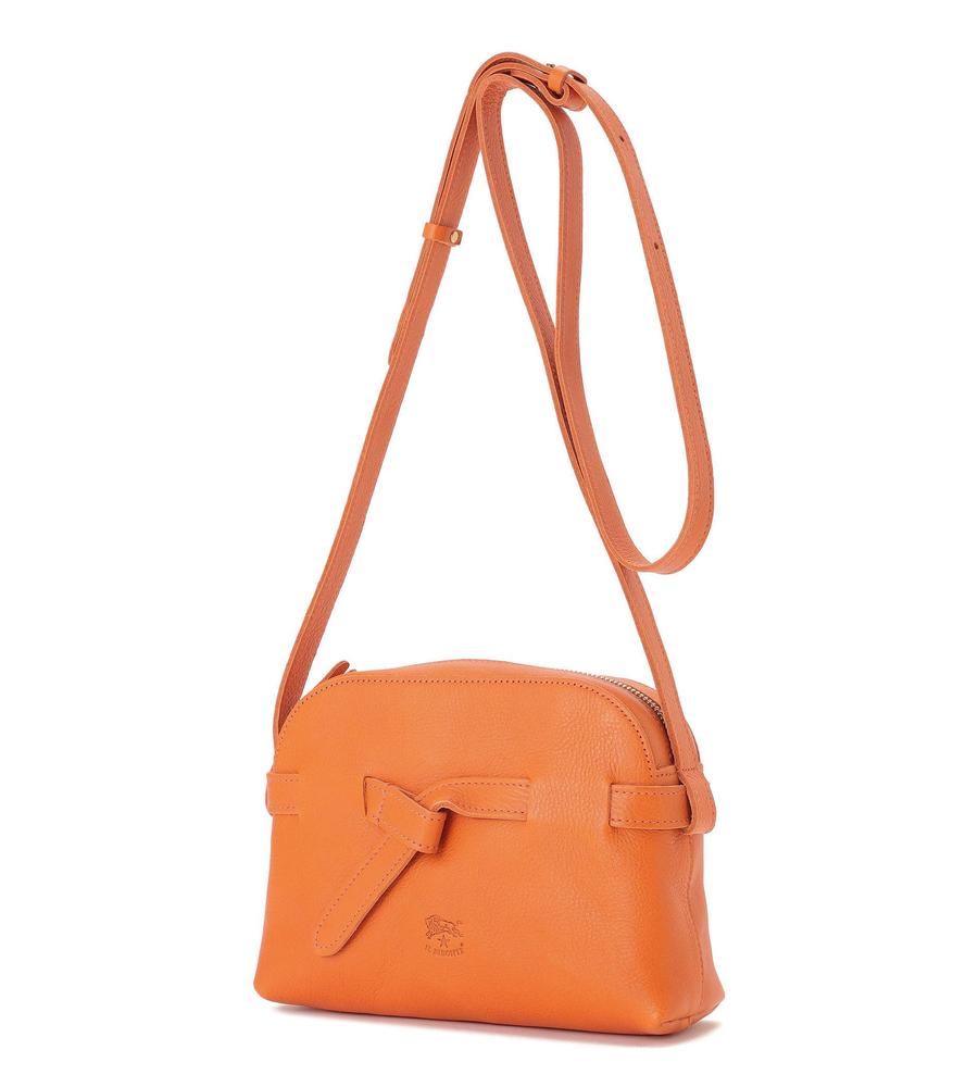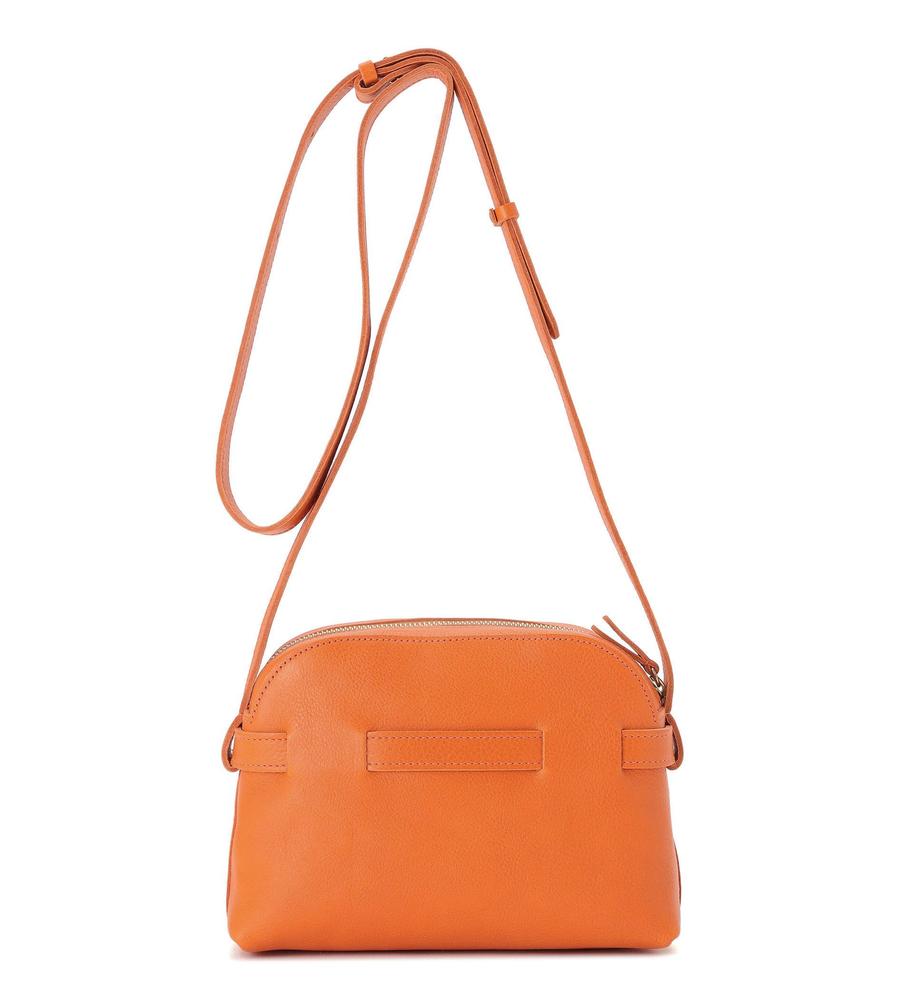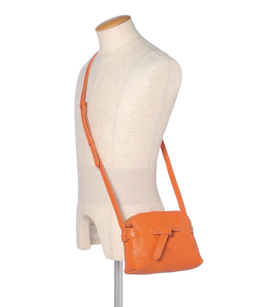 シボ入りの牛革を用いたクロスボディバッグ。上品なストラップデザインと型押しロゴがアクセント。小ぶりながらマチ幅があり、スマートフォンや長財布などが収まります。間口はジップ仕様で、ショルダーベルトは長さ調整可能です。